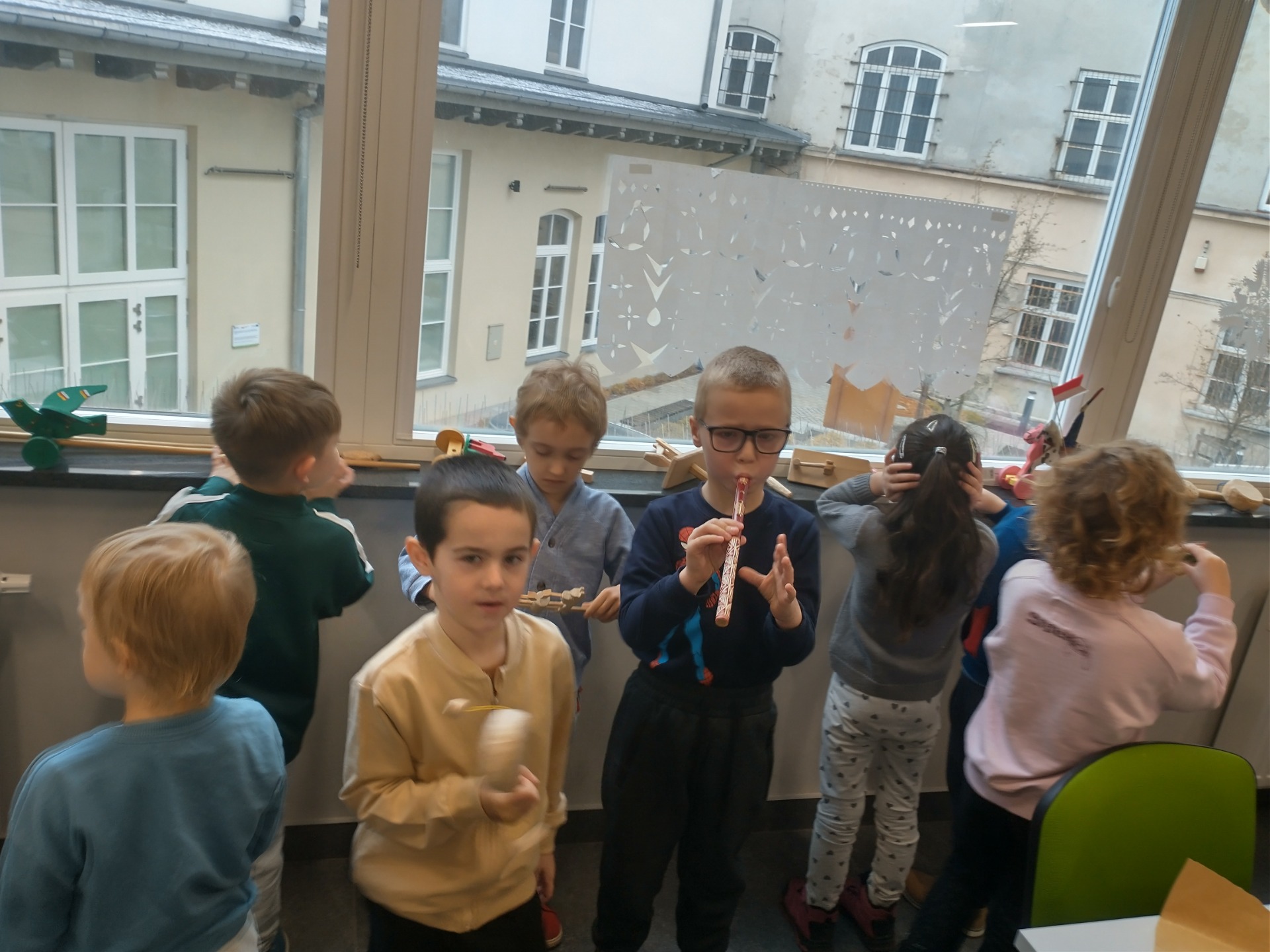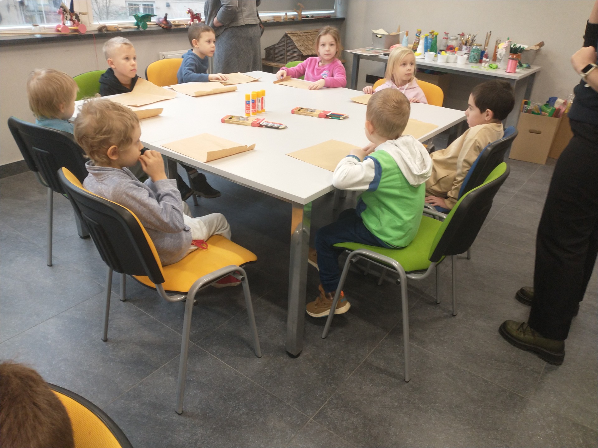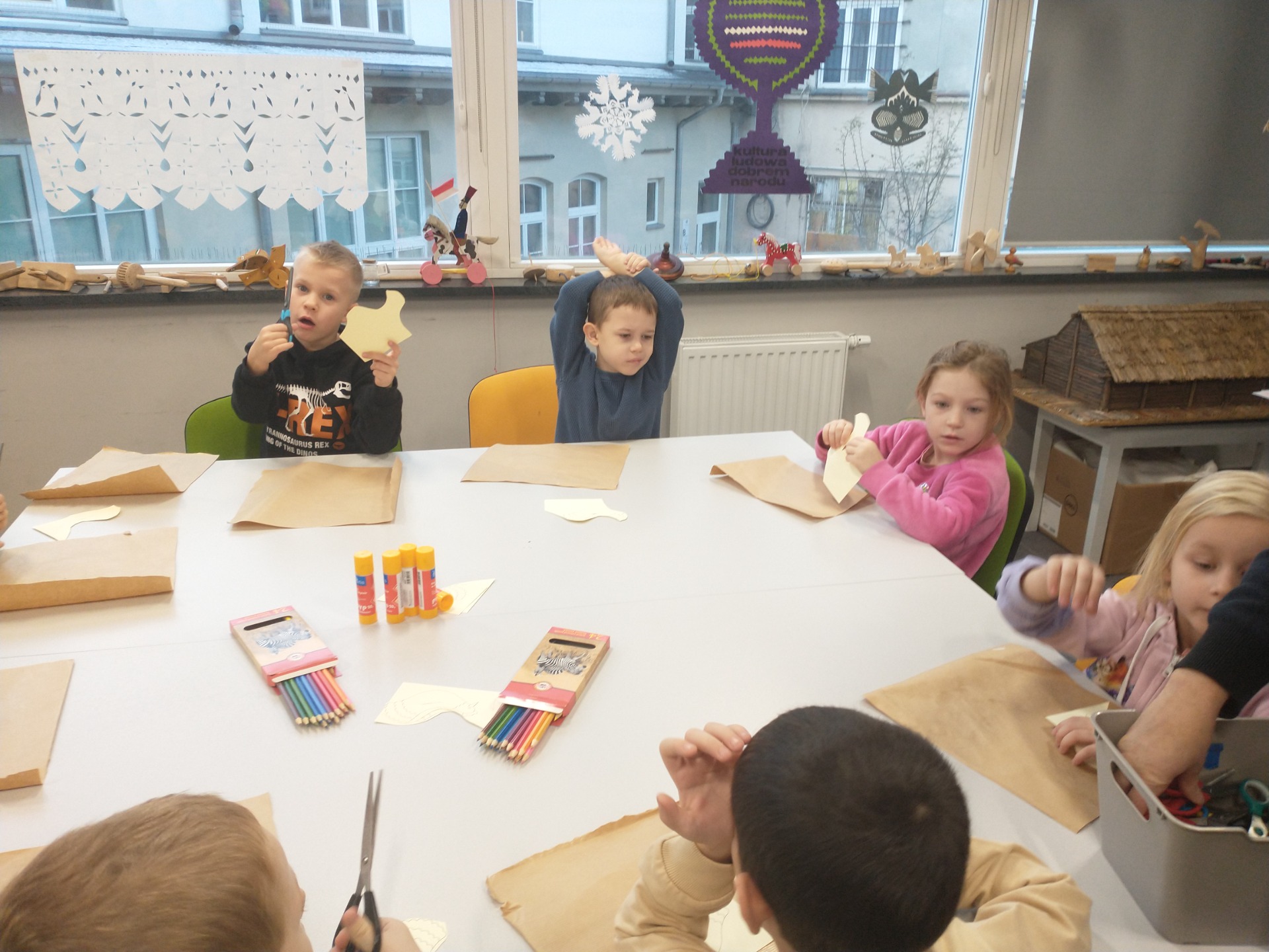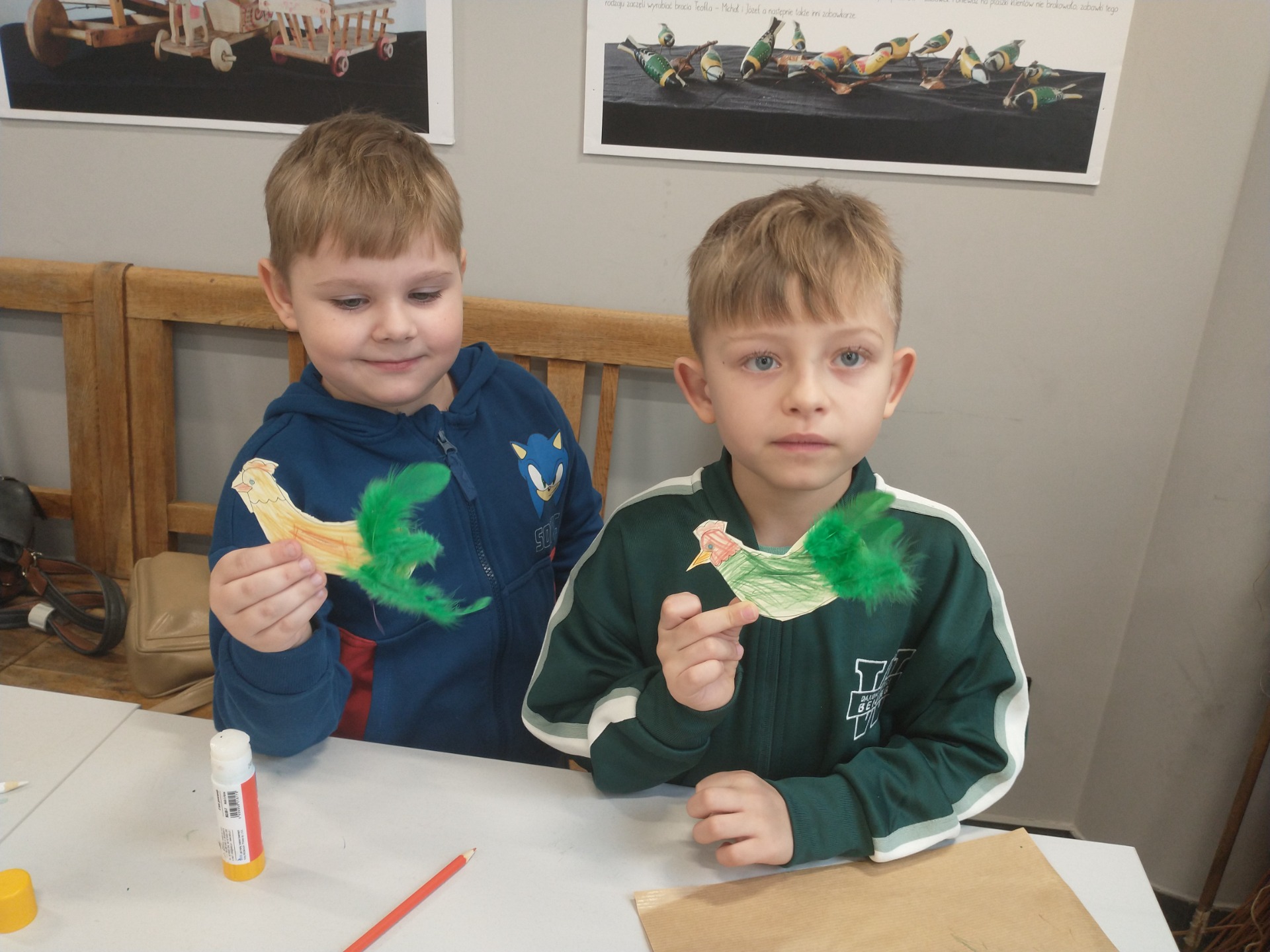 Starsze dzieci uczestniczyły w warsztatach pt. „Dawne zabawy i zabawki”. Dzieci obejrzały fragment wystawy etnograficznej, gdzie zobaczyły, jak wyglądało życie na wsi 100 lat temu i jaką rolę pełniły zabawy, a jaką obowiązki w codziennym życiu dzieci. Przedszkolaki miały okazję wziąć do rąk dawne, drewniane zabawki jarmarczne i poczuć ich magię.