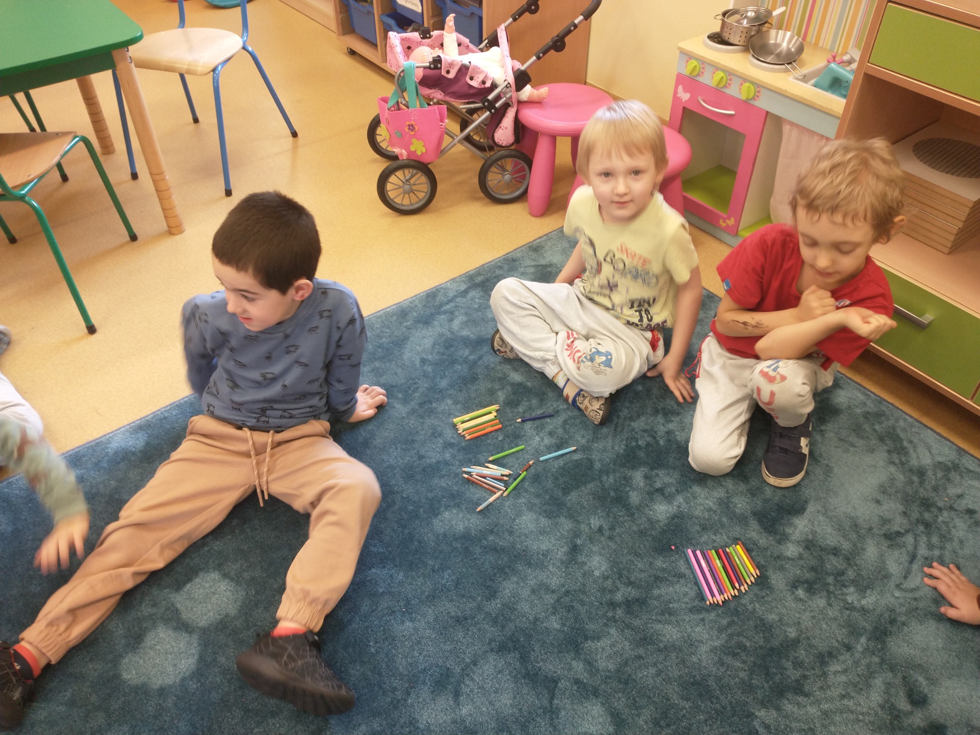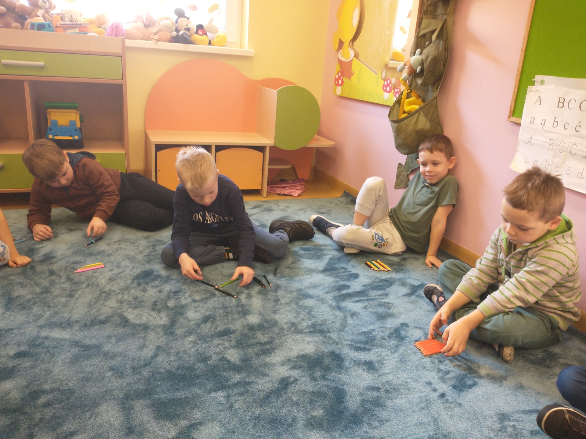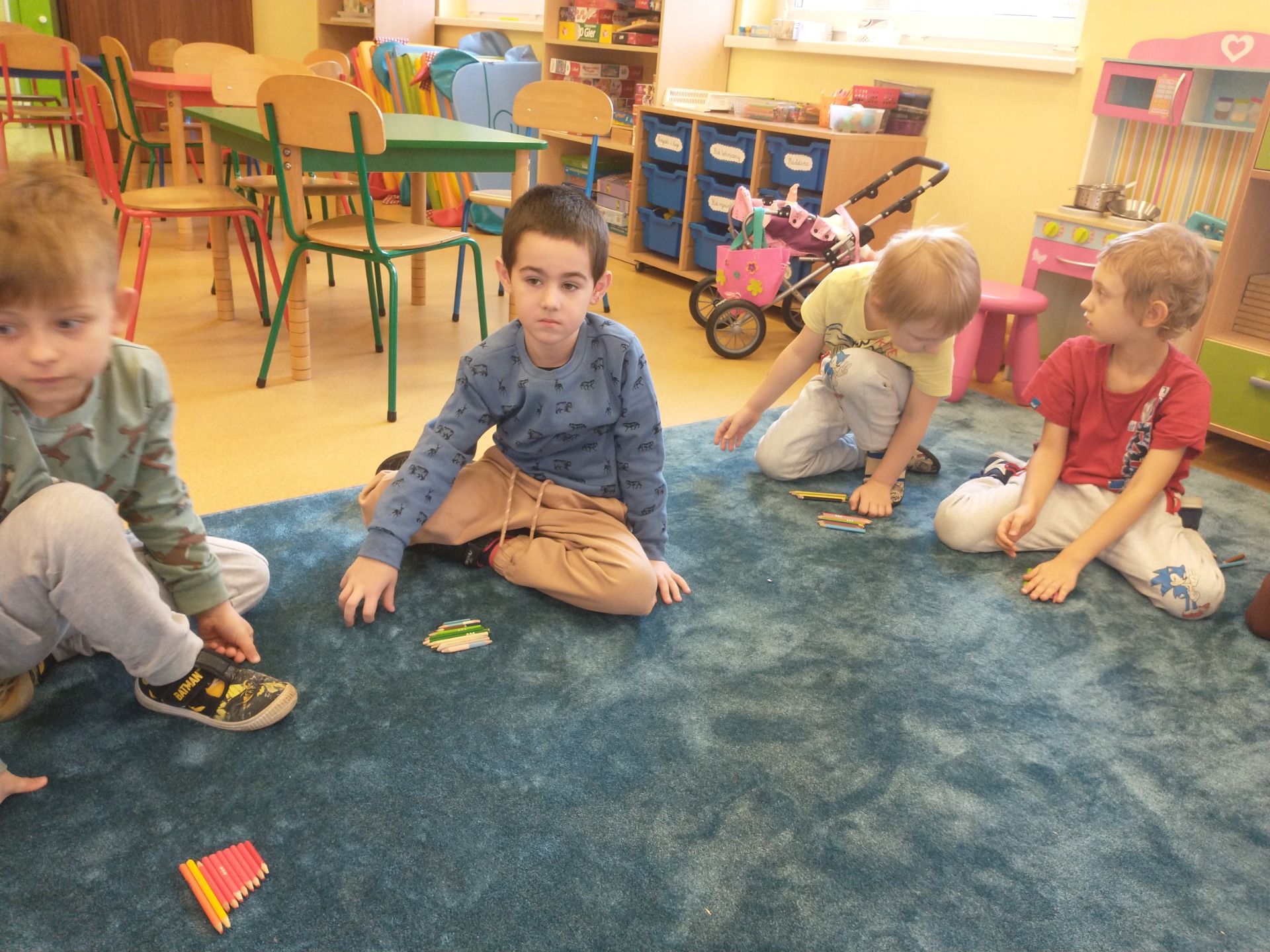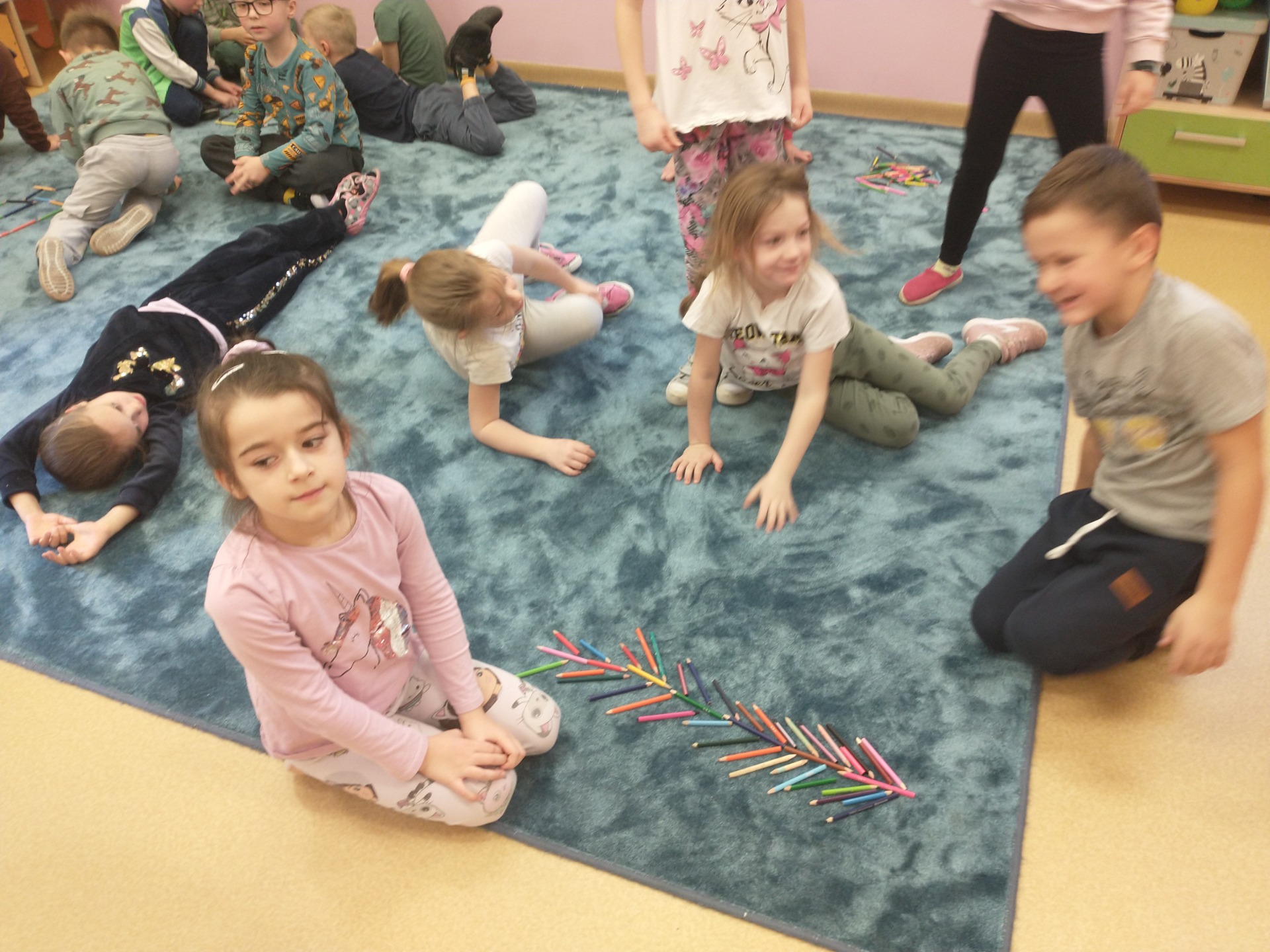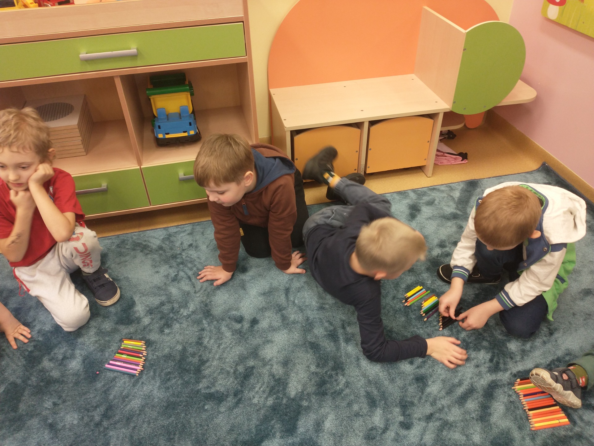 Wycieczka do Muzeum Archeologicznego i Etnograficznego w Łodzi na warsztaty pt. „Dawne zabawy i zabawki” była inspiracją do przeprowadzenia następnego dnia zajęć, których motywem przewodnim było wykorzystanie kredek do różnych zabaw. Dzieci współpracowały przy tworzeniu kredkowych obrazków, motaniu sznurka oraz układaniu kredek według wielkości. Nie zabrakło również zadań matematycznych i plastycznych.