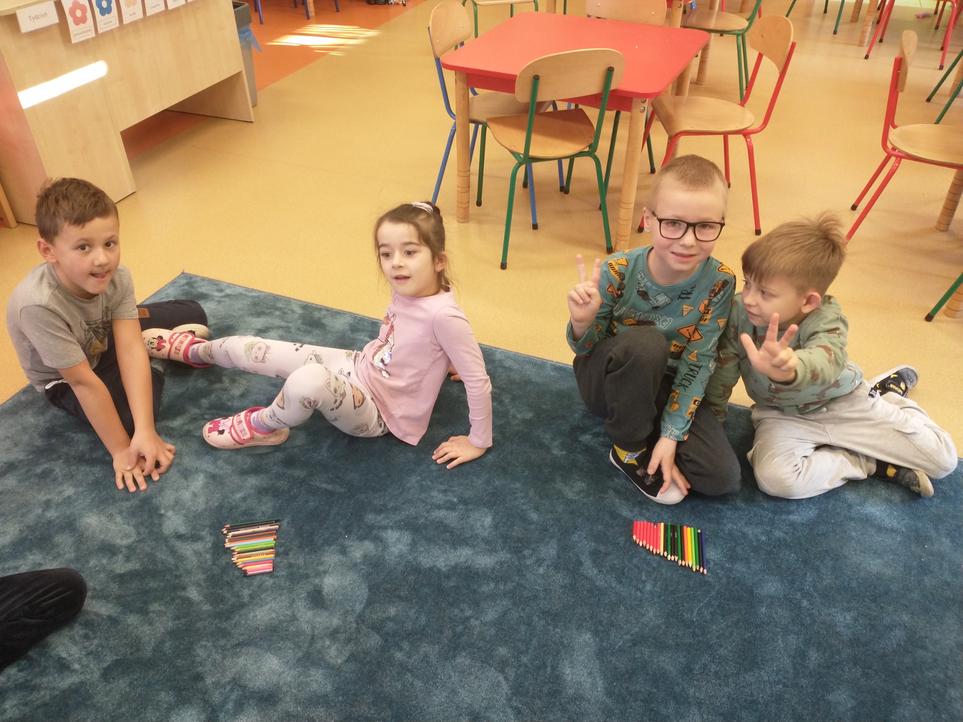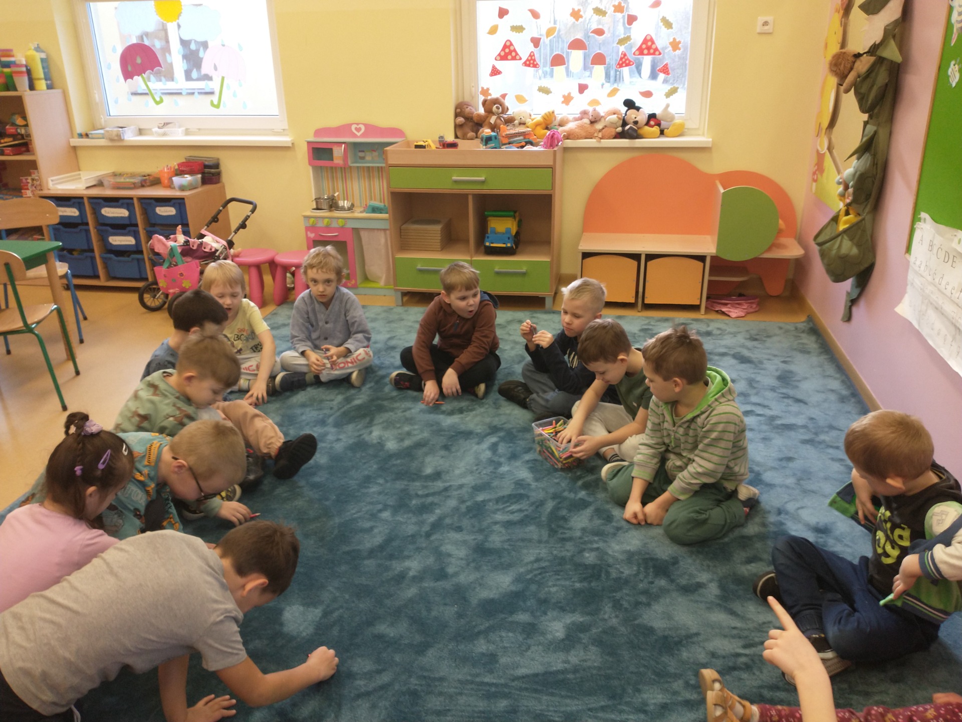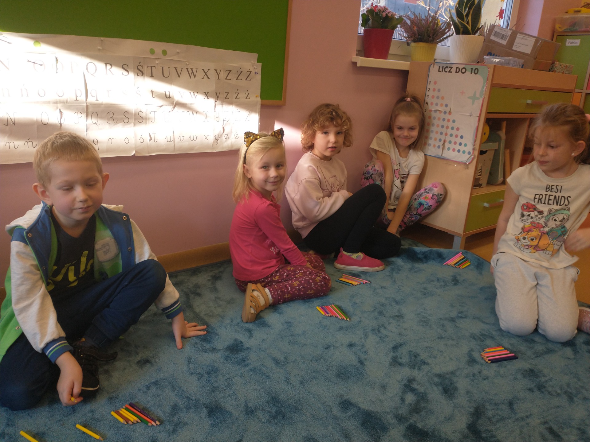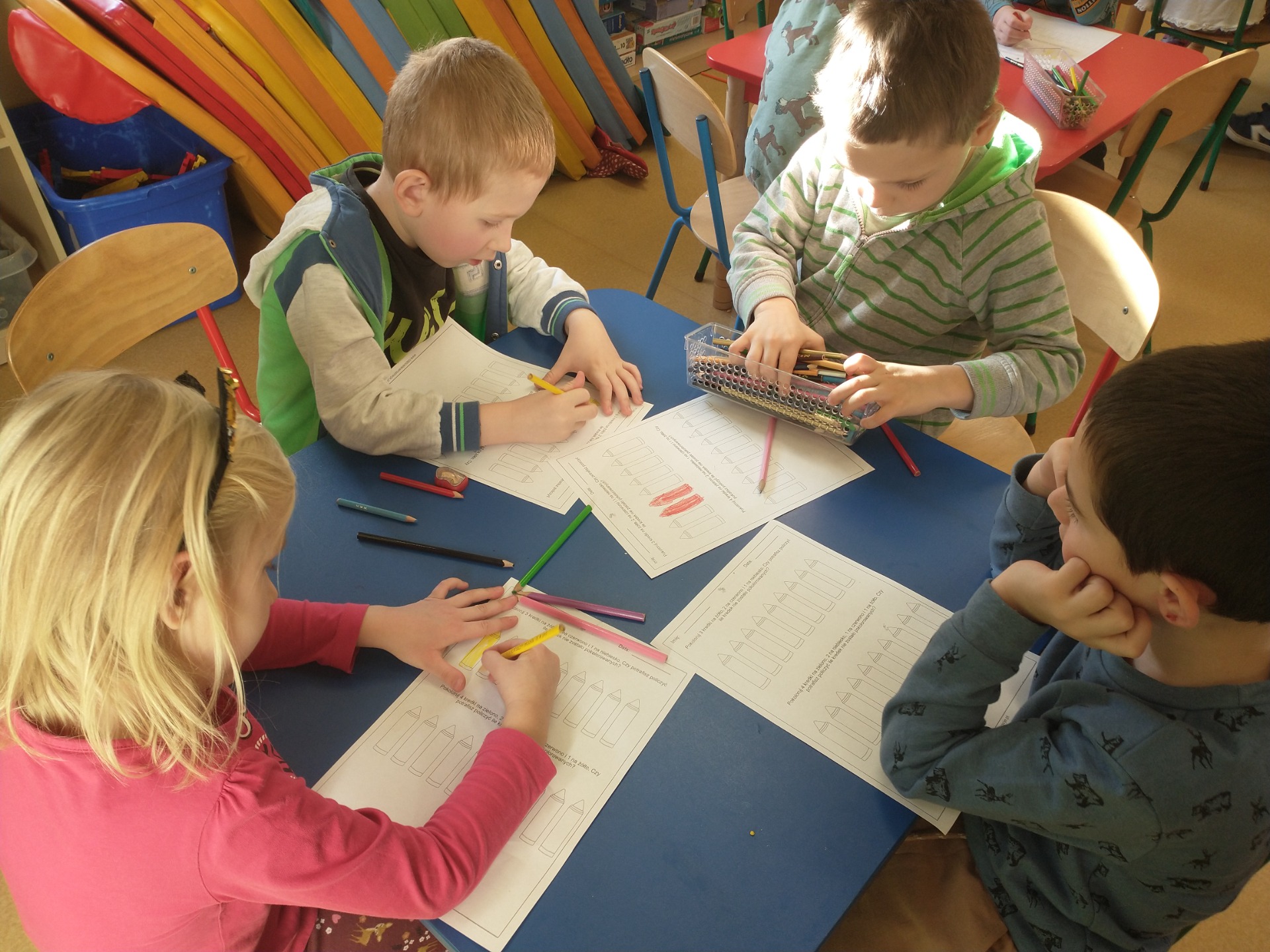 Wycieczka do Muzeum Archeologicznego i Etnograficznego w Łodzi na warsztaty pt. „Dawne zabawy i zabawki” była inspiracją do przeprowadzenia następnego dnia zajęć, których motywem przewodnim było wykorzystanie kredek do różnych zabaw. Dzieci współpracowały przy tworzeniu kredkowych obrazków, motaniu sznurka oraz układaniu kredek według wielkości. Nie zabrakło również zadań matematycznych i plastycznych.