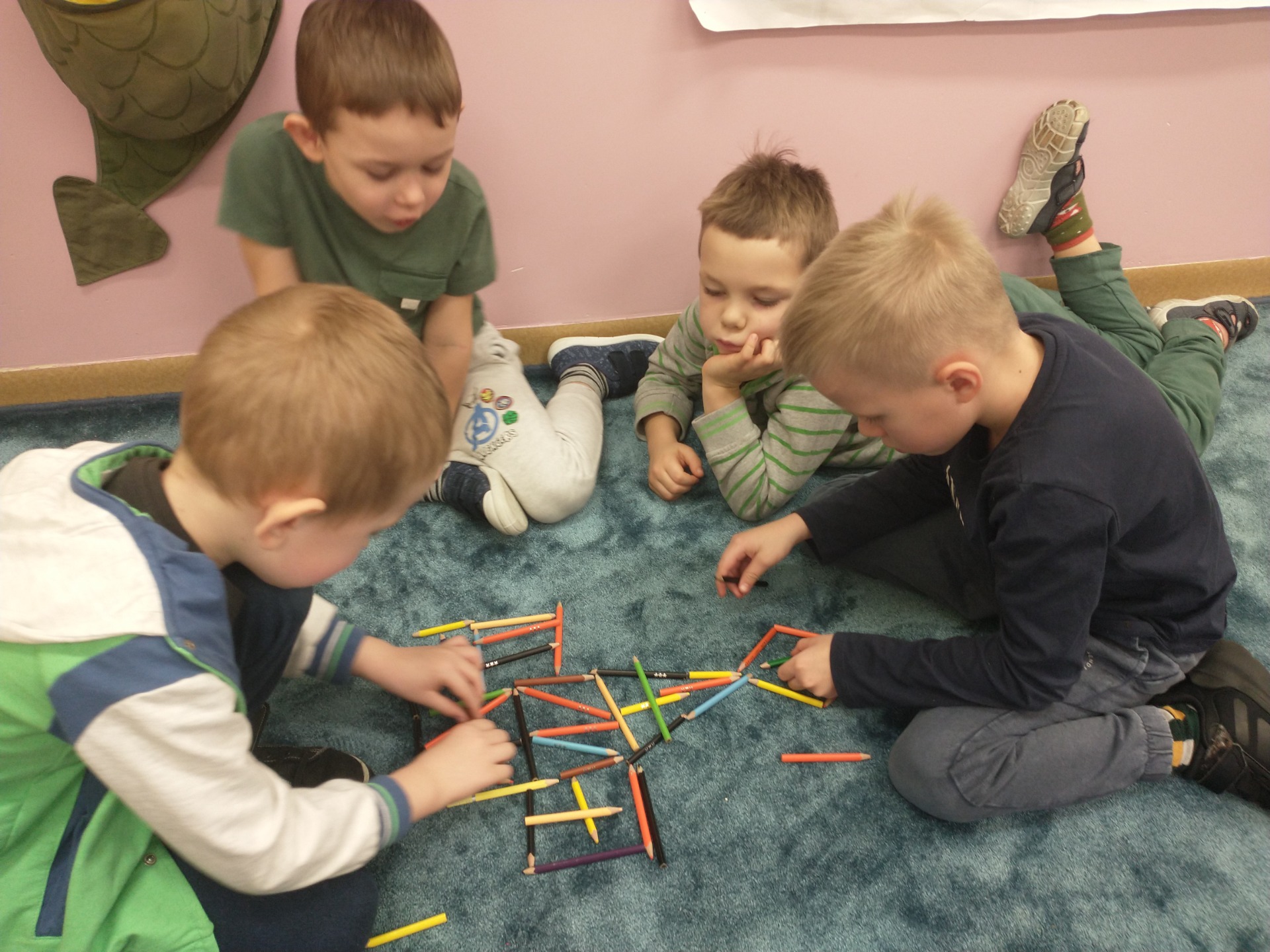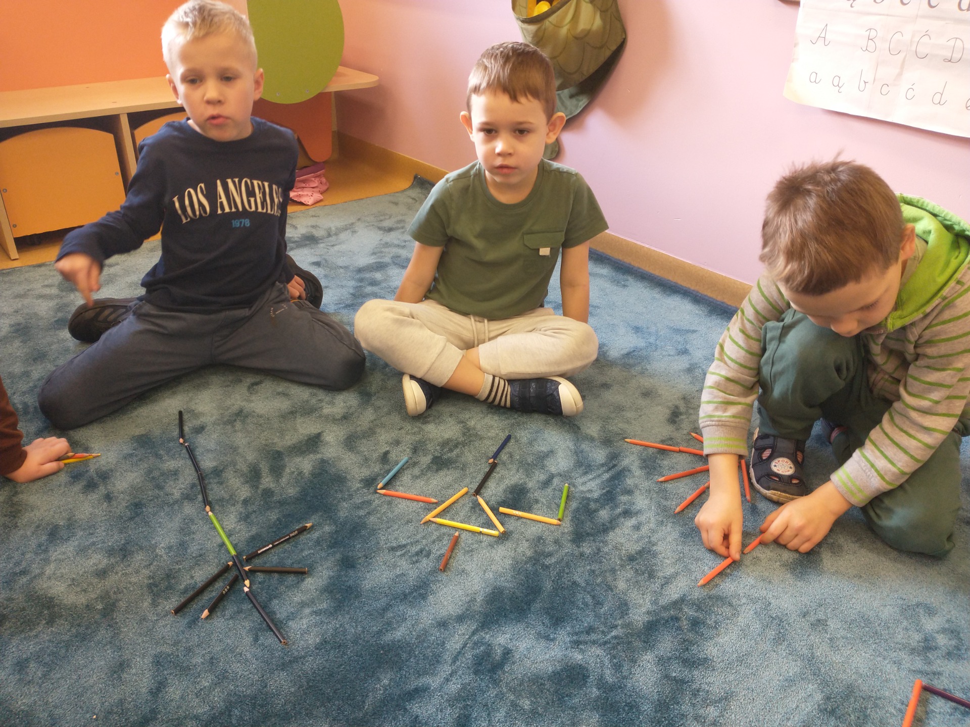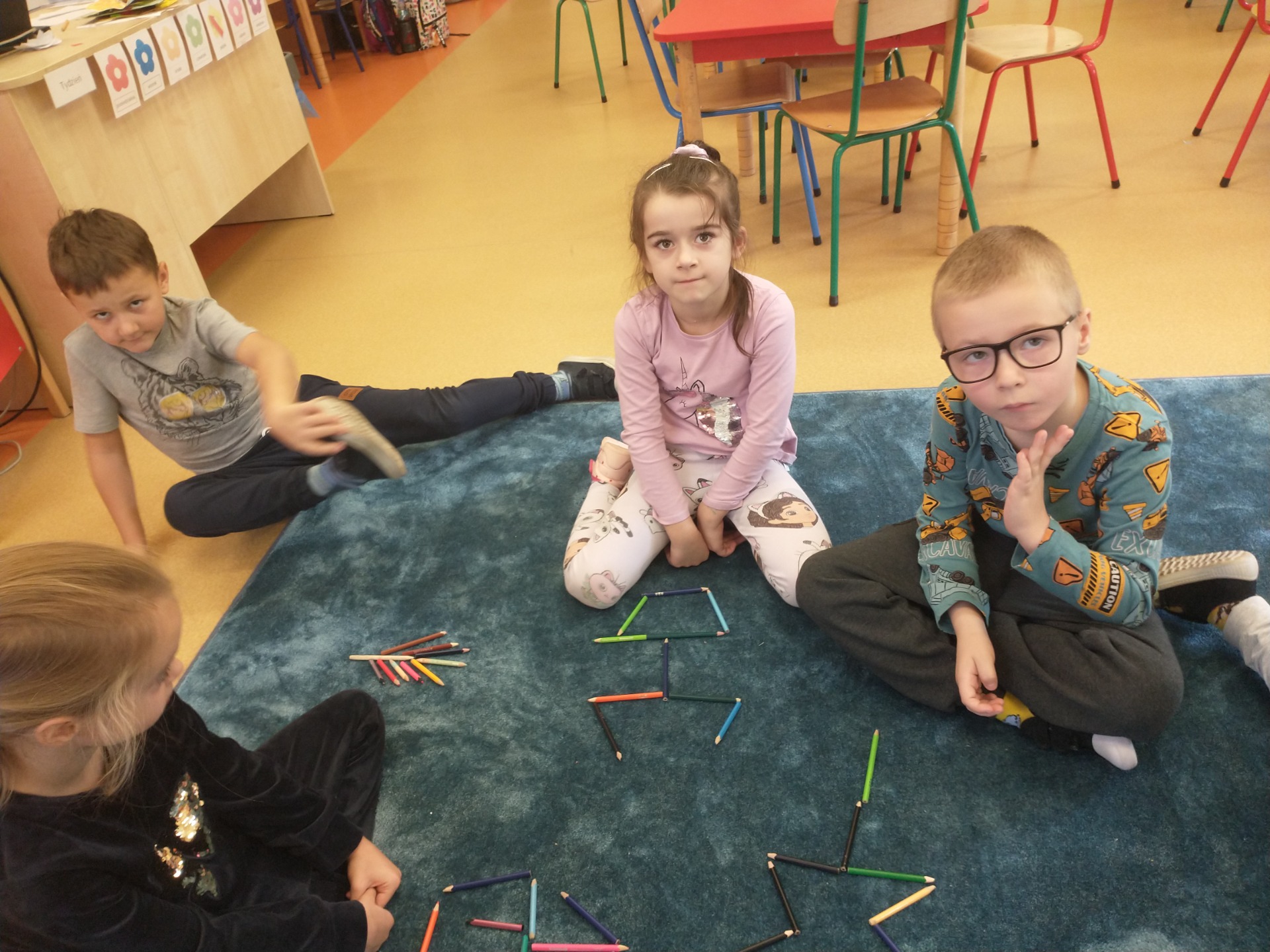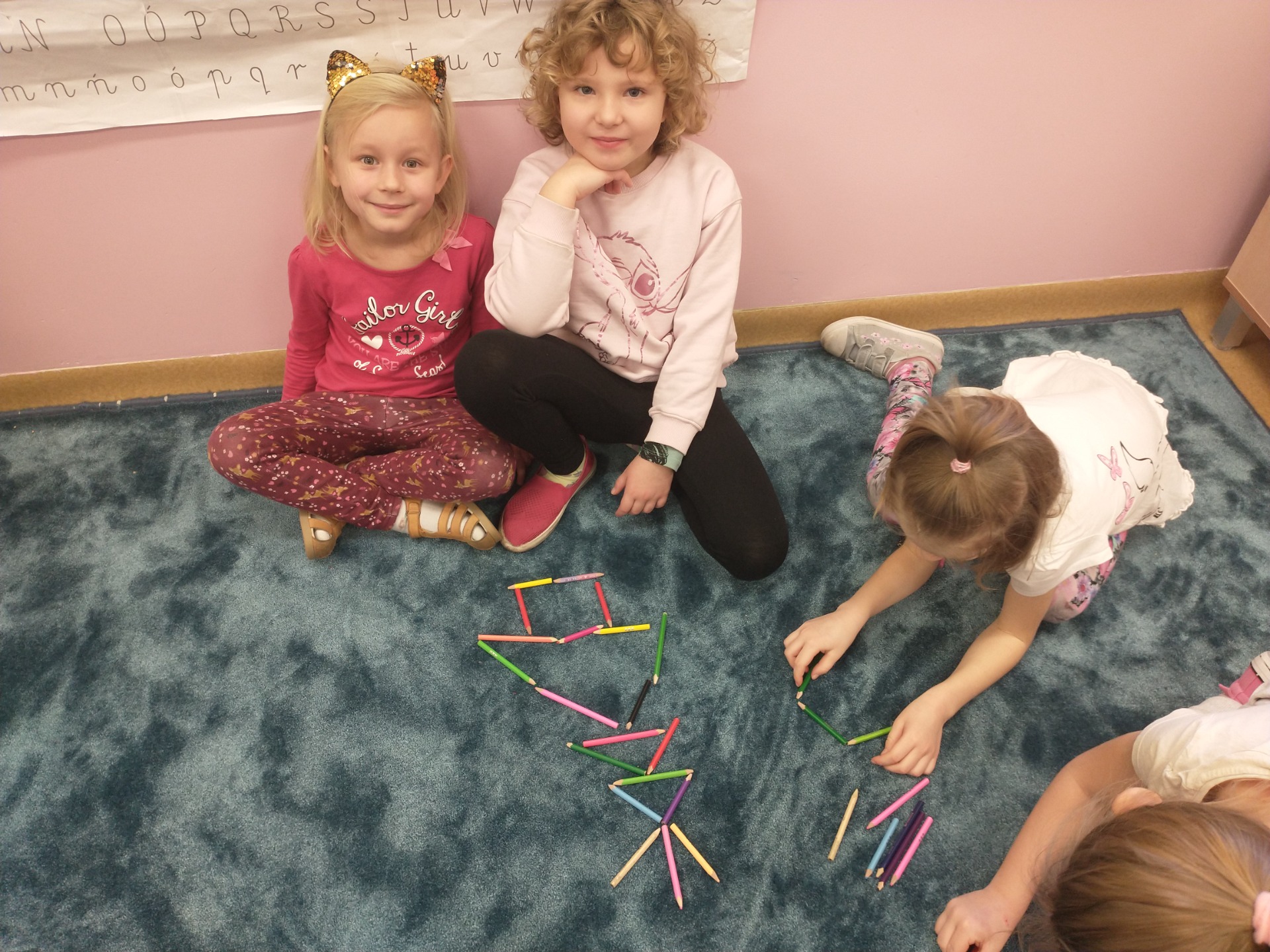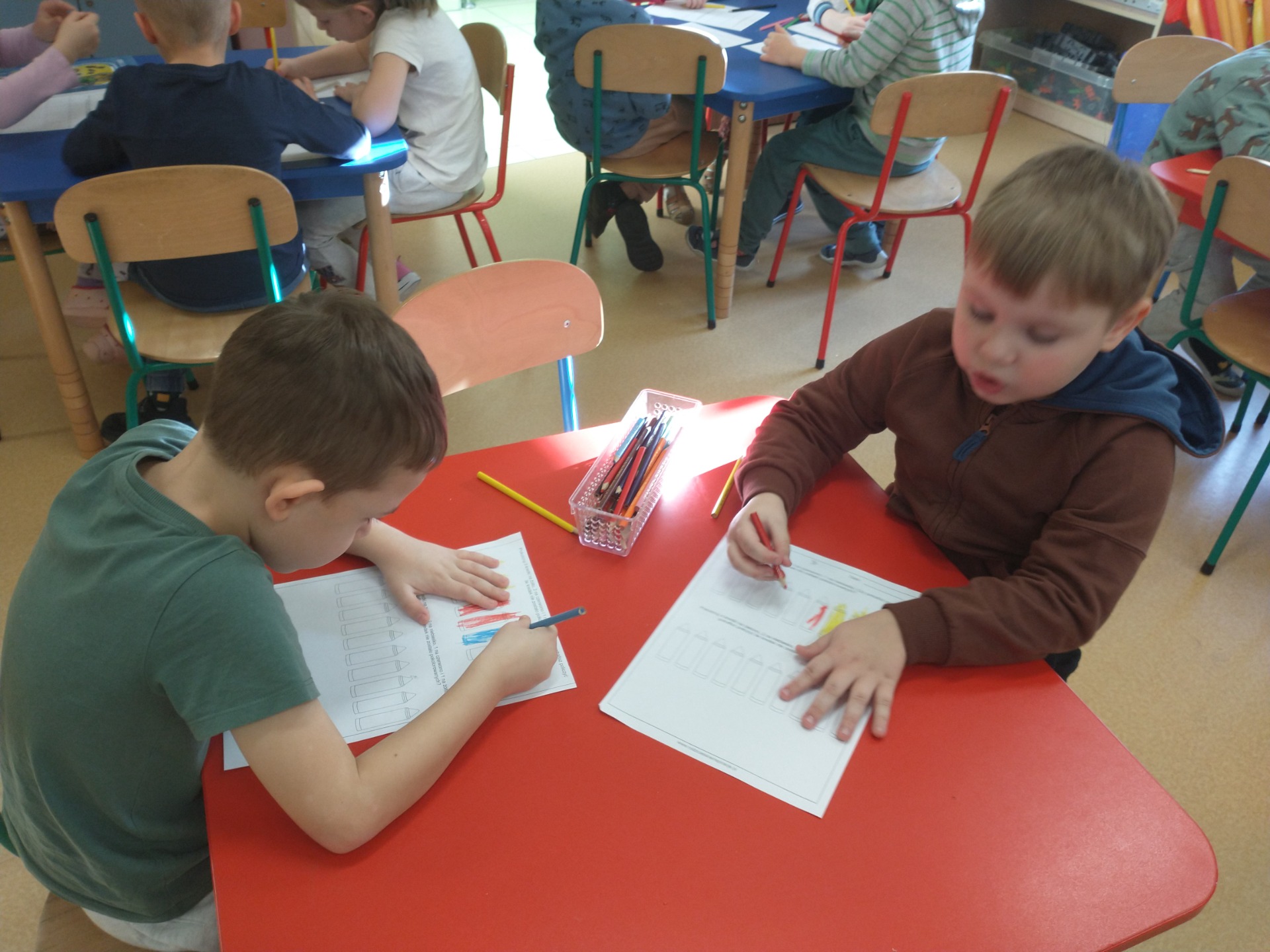 Wycieczka do Muzeum Archeologicznego i Etnograficznego w Łodzi na warsztaty pt. „Dawne zabawy i zabawki” była inspiracją do przeprowadzenia następnego dnia zajęć, których motywem przewodnim było wykorzystanie kredek do różnych zabaw. Dzieci współpracowały przy tworzeniu kredkowych obrazków, motaniu sznurka oraz układaniu kredek według wielkości. Nie zabrakło również zadań matematycznych i plastycznych.