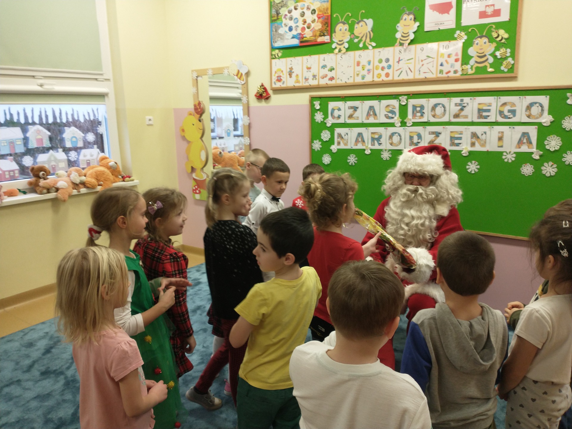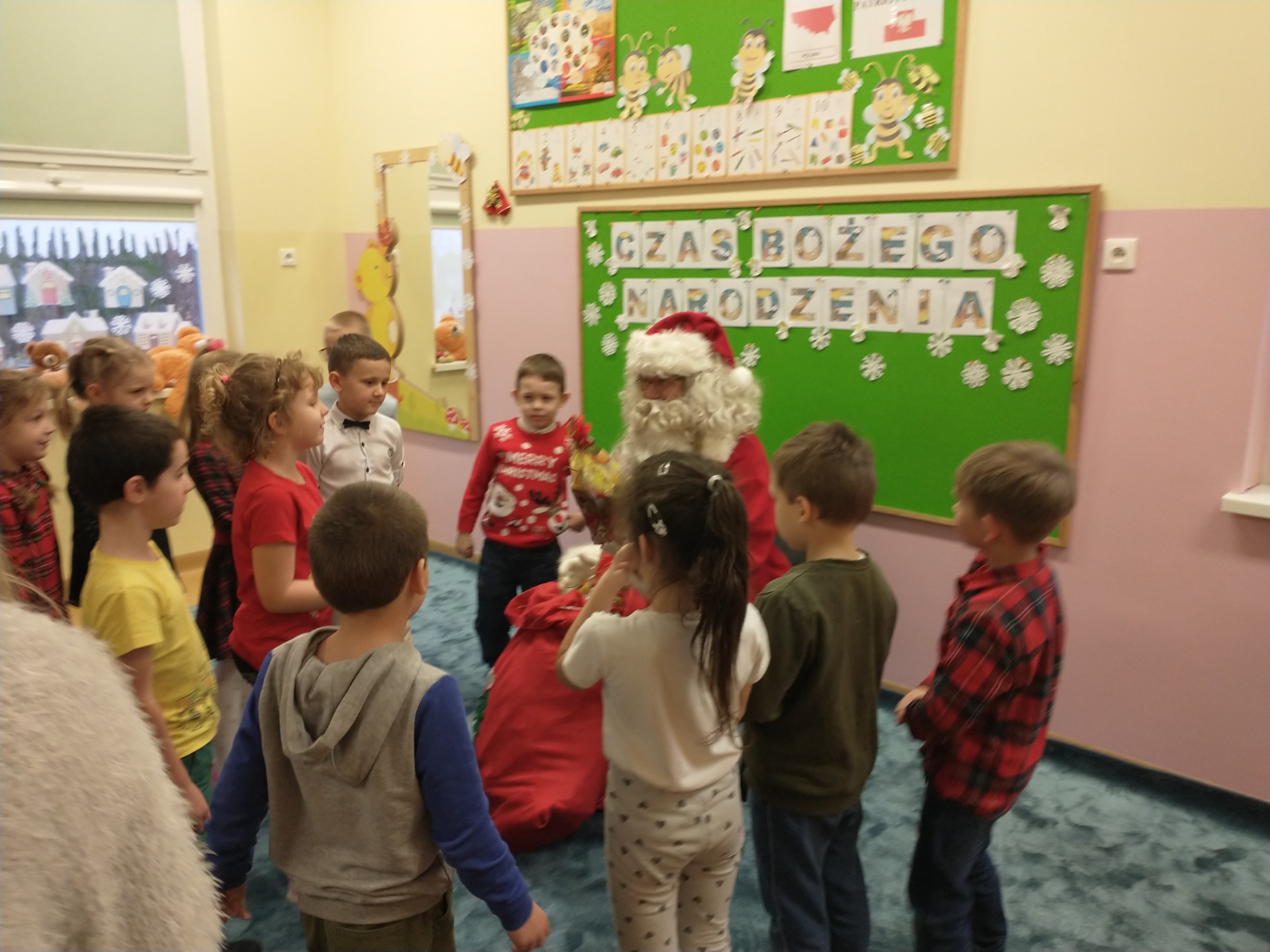 W czwartek -12 grudnia - w grupie ,,Pszczółki” odbyły się warsztaty bożonarodzeniowe, na które zaproszeni byli rodzice. Dzieci wprowadziły przybyłych gości w świąteczny nastrój recytacją wiersza „Wieczór wigilijny” oraz prezentacją piosenki „Santa Claus Is Comin’ To Town”.