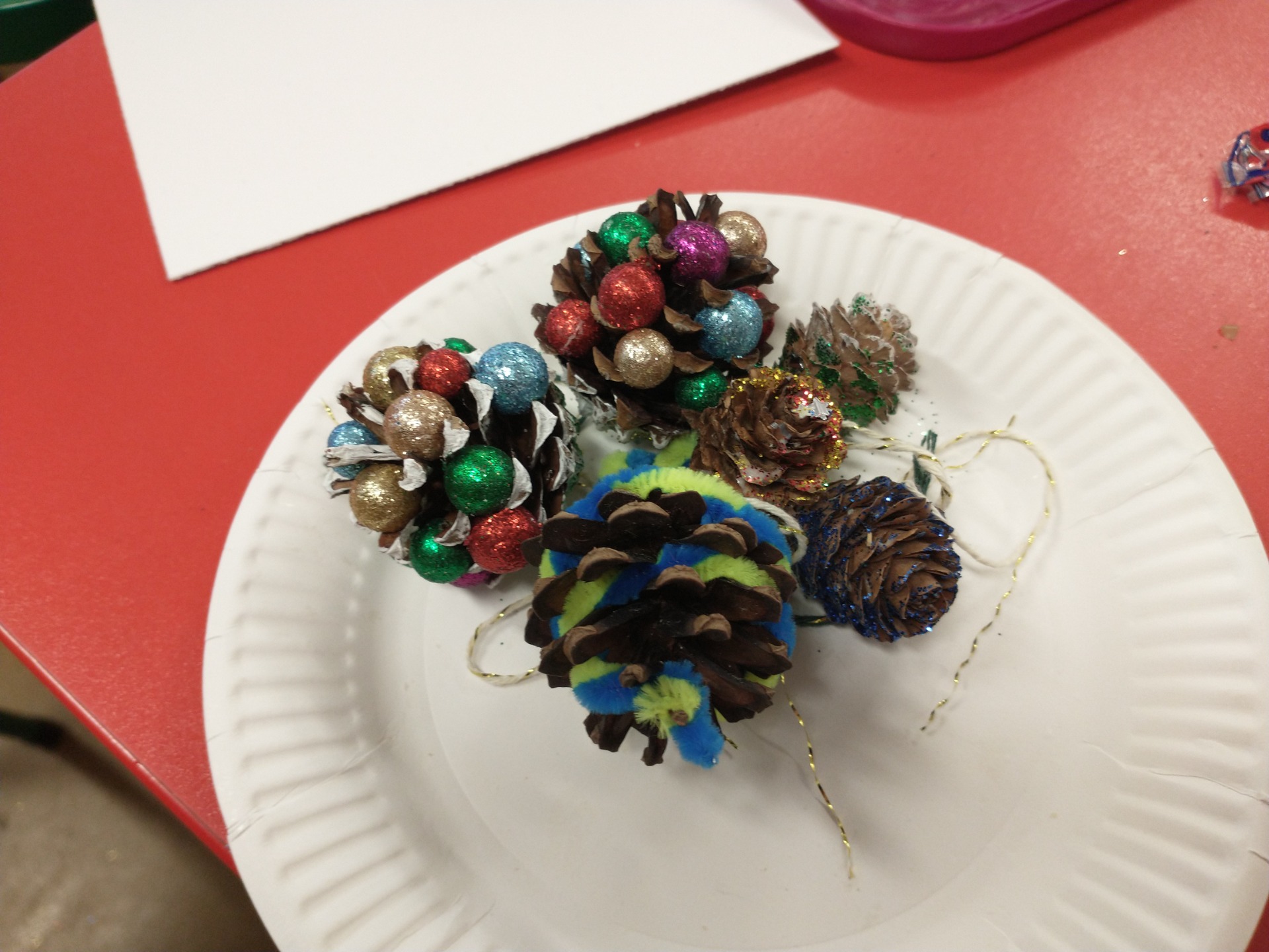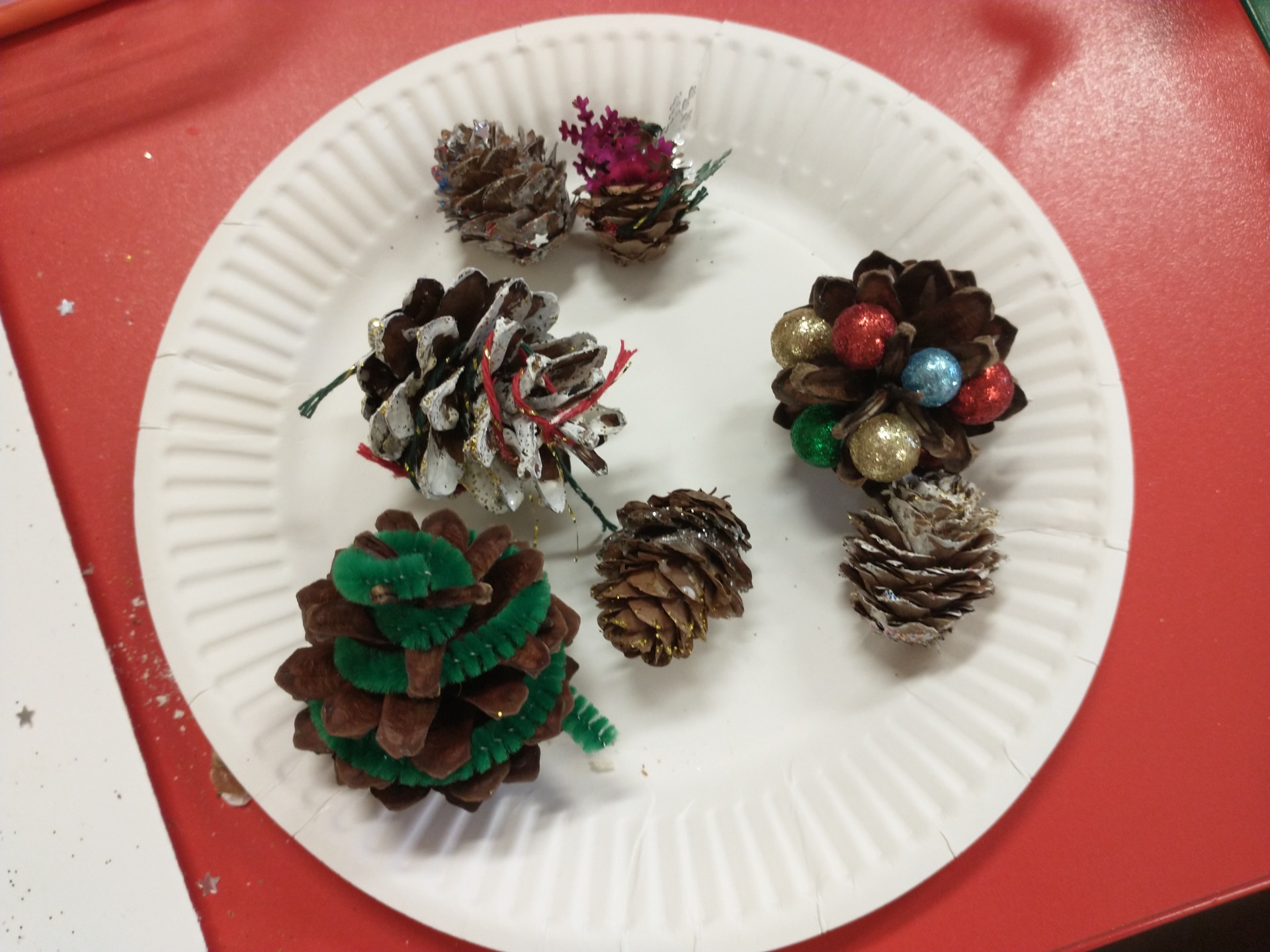 Dzieci wraz z opiekunami wykonywały z szyszek i różnorodnych materiałów plastycznych choinkowe ozdoby. W tym czasie przybył z prezentami święty Mikołaj. Nasza uroczystość zakończyła się słodkim poczęstunkiem.