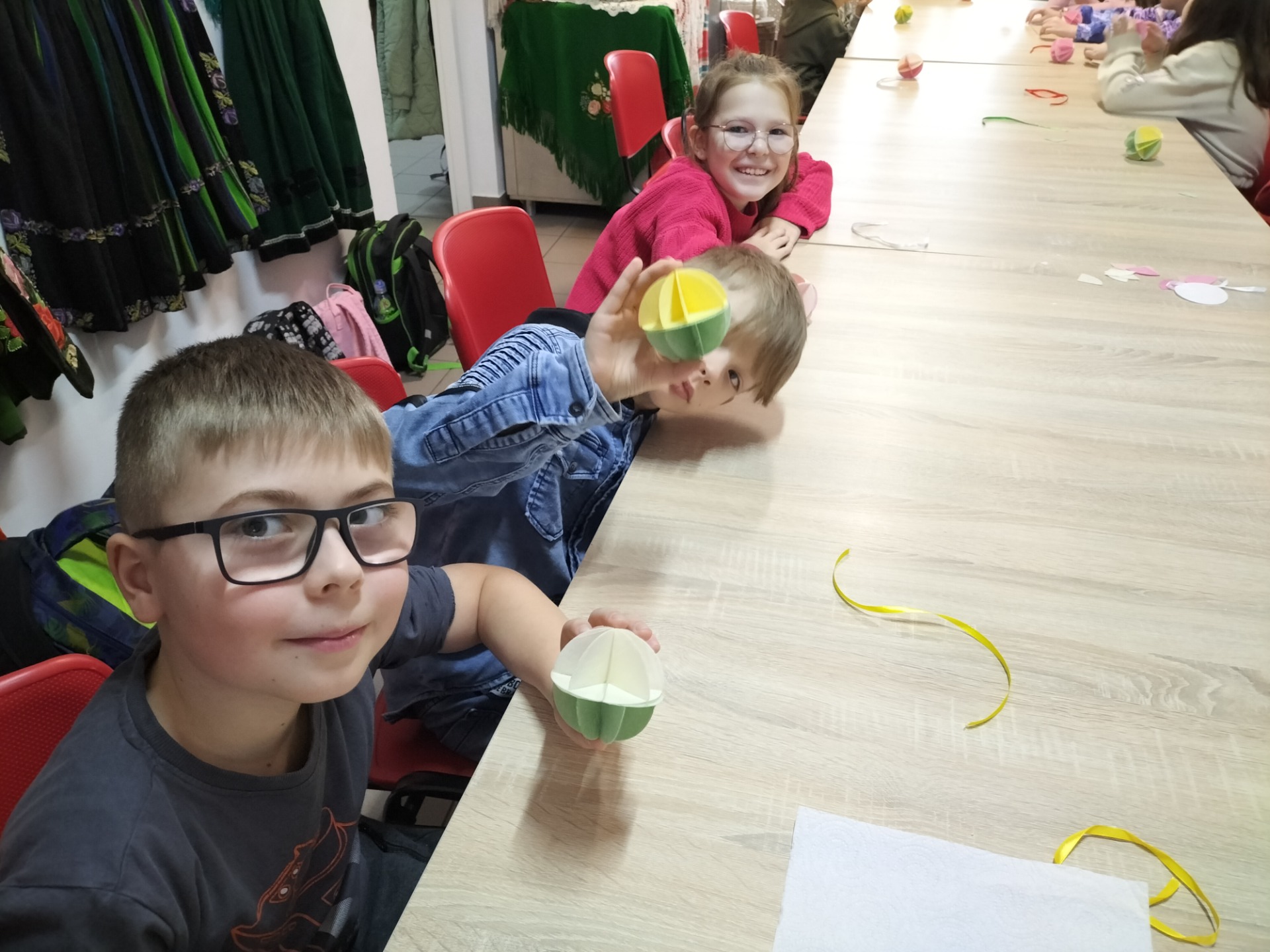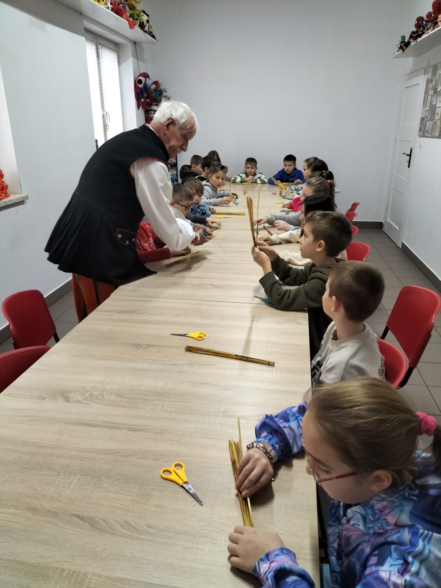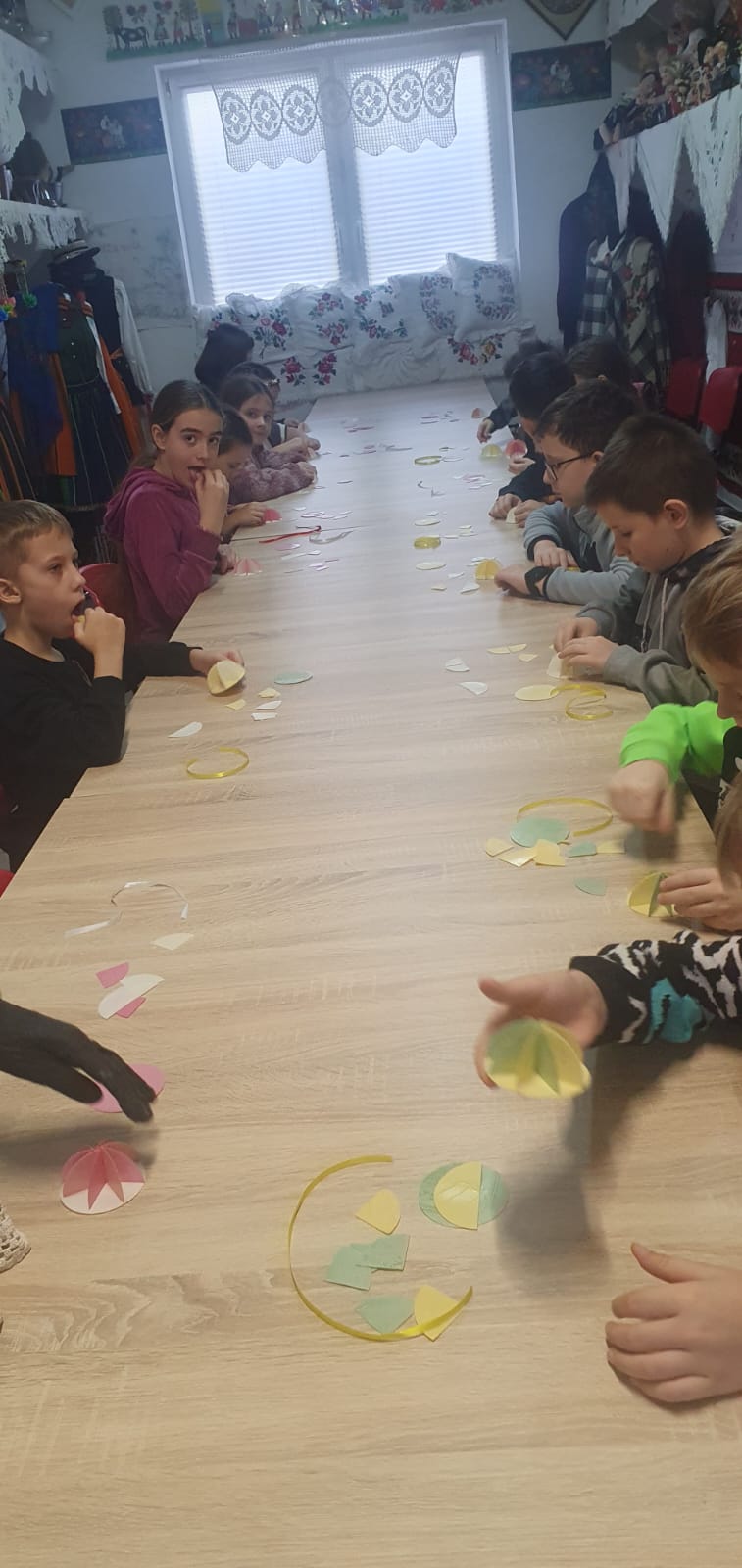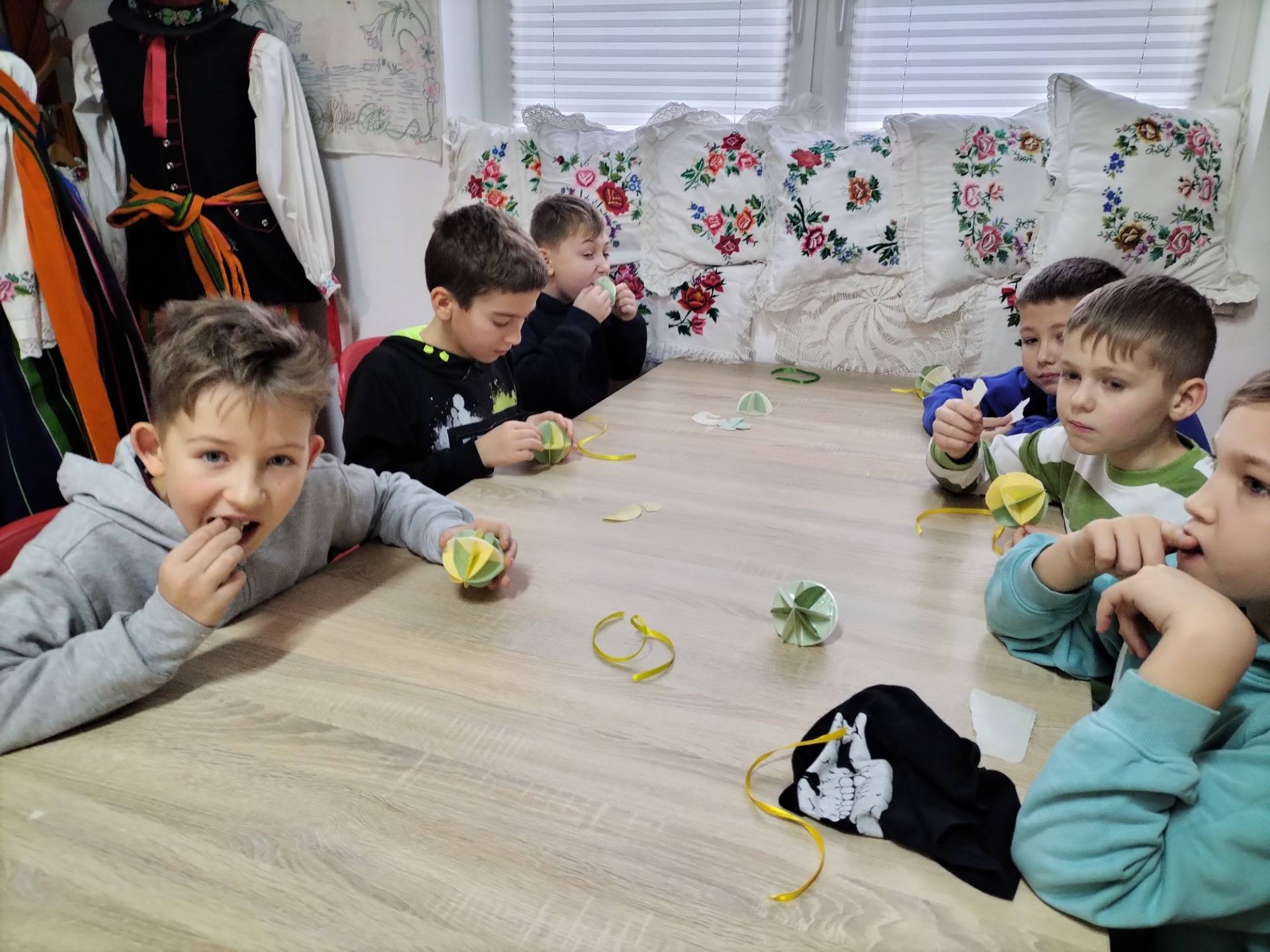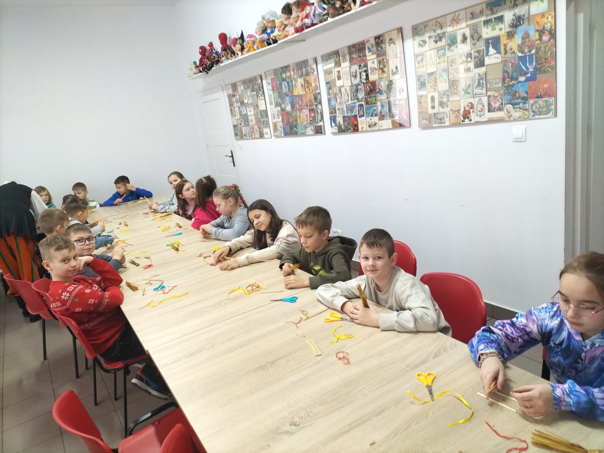 Następnie dzieci wzięły udział w warsztatach z tradycyjnego wyrobu tzw. światów (ozdób przestrzennych z elementów kolorowych opłatków) oraz ozdób świątecznych ze słomy.