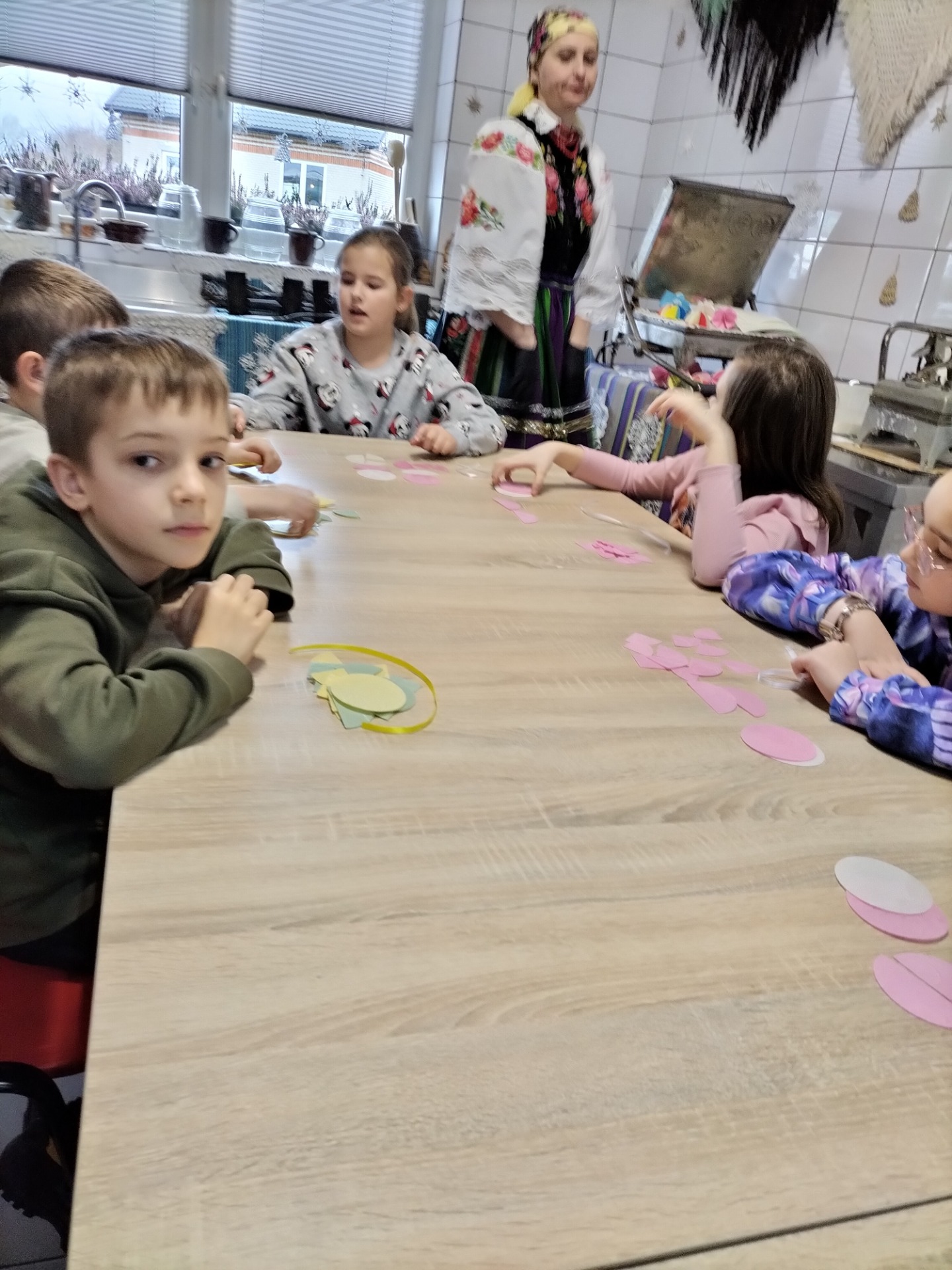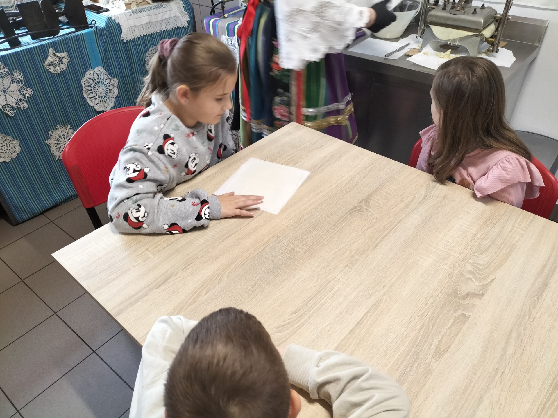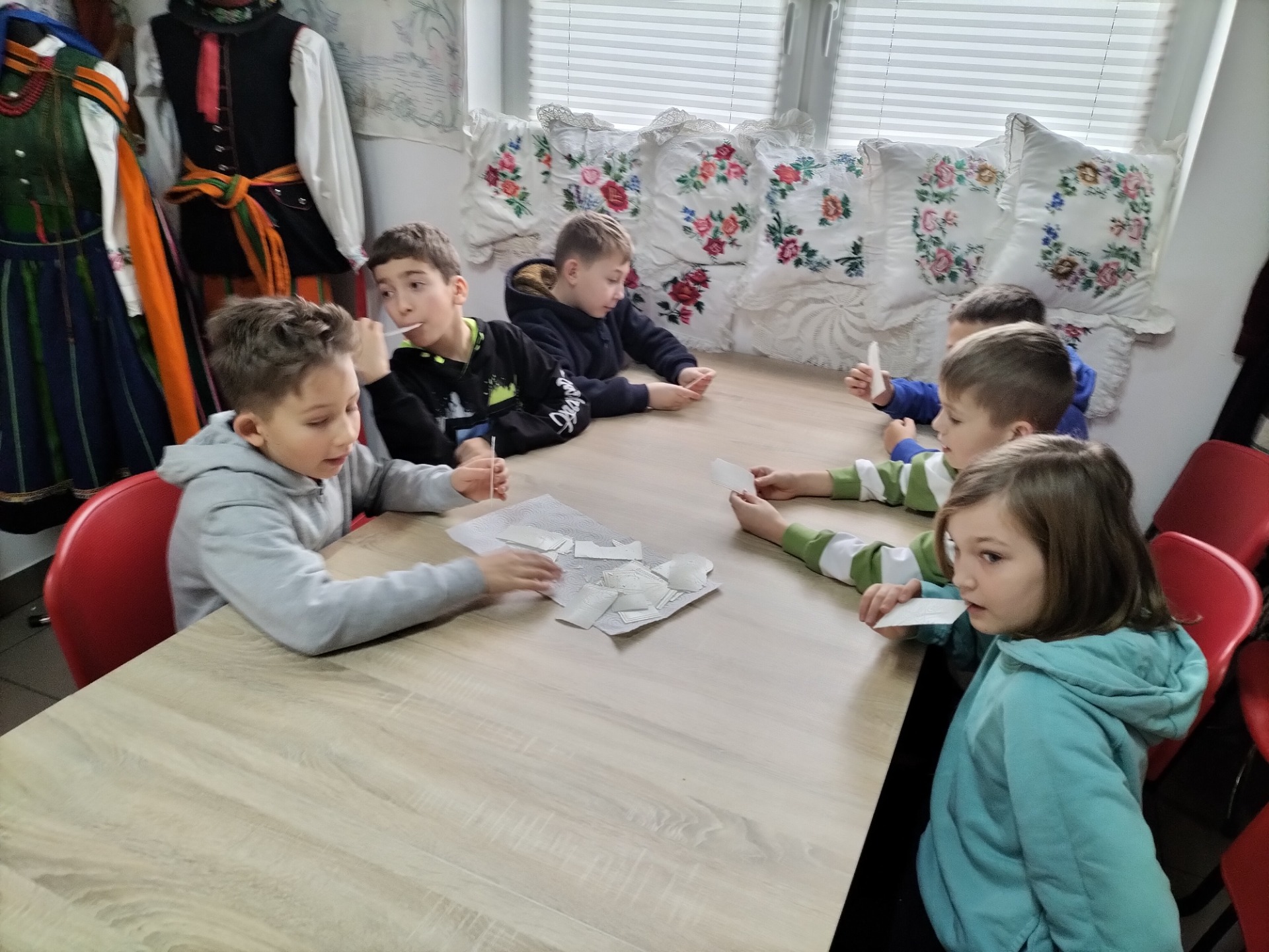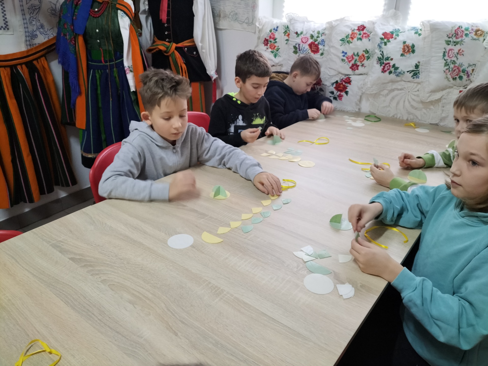 Następnie dzieci wzięły udział w warsztatach z tradycyjnego wyrobu tzw. światów (ozdób przestrzennych z elementów kolorowych opłatków) oraz ozdób świątecznych ze słomy.