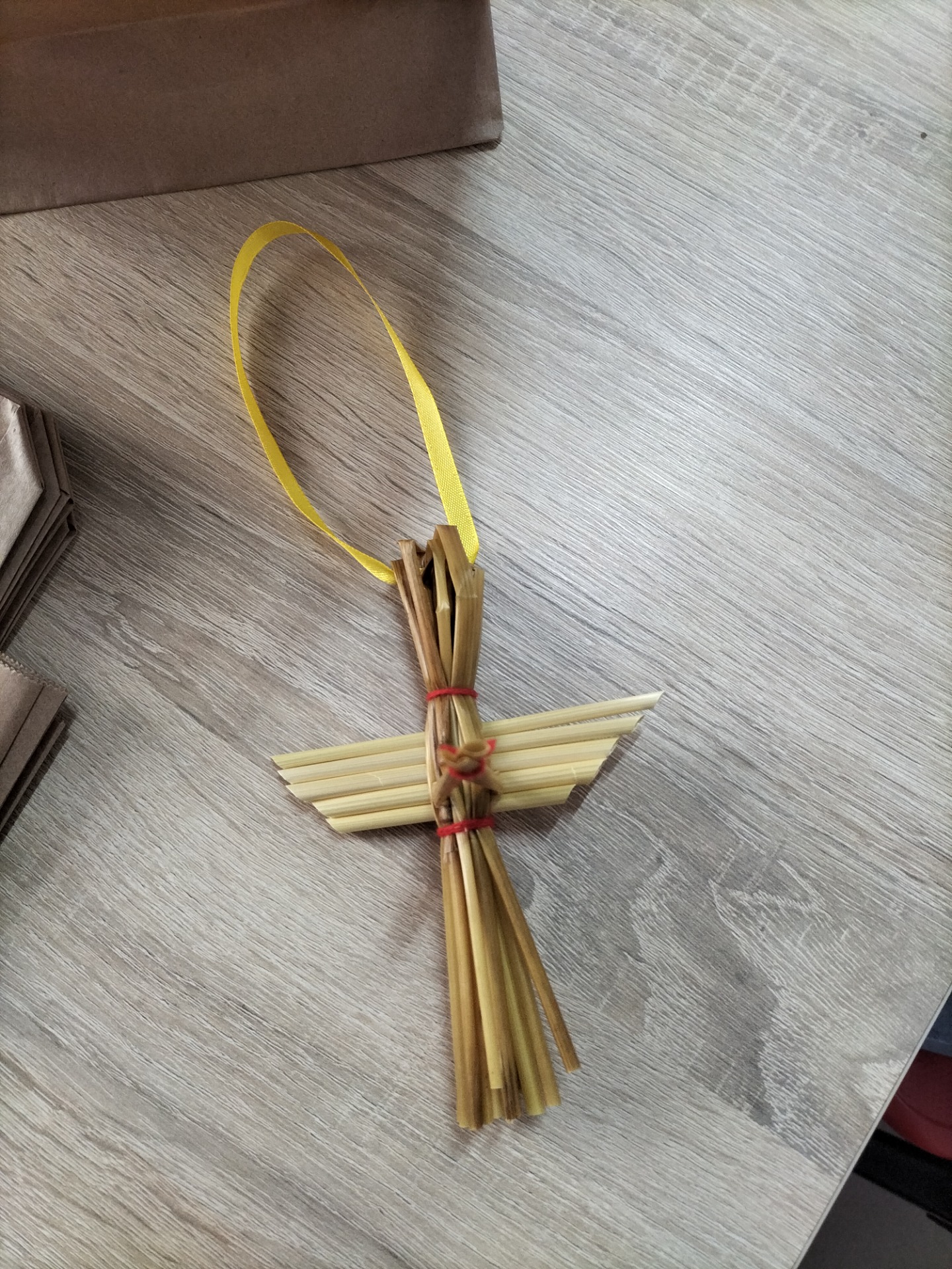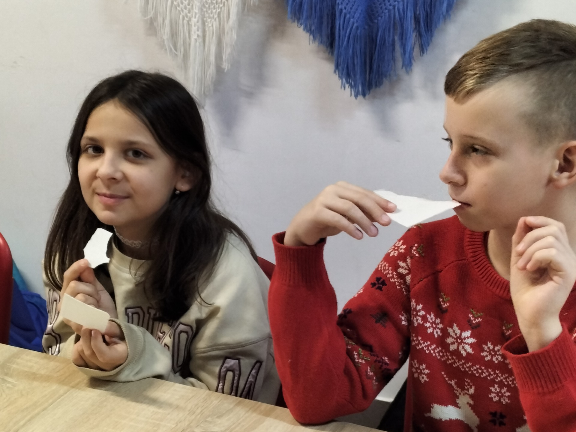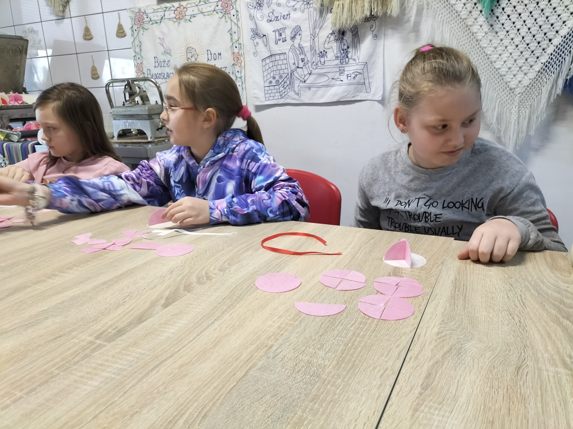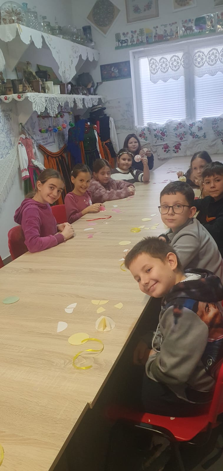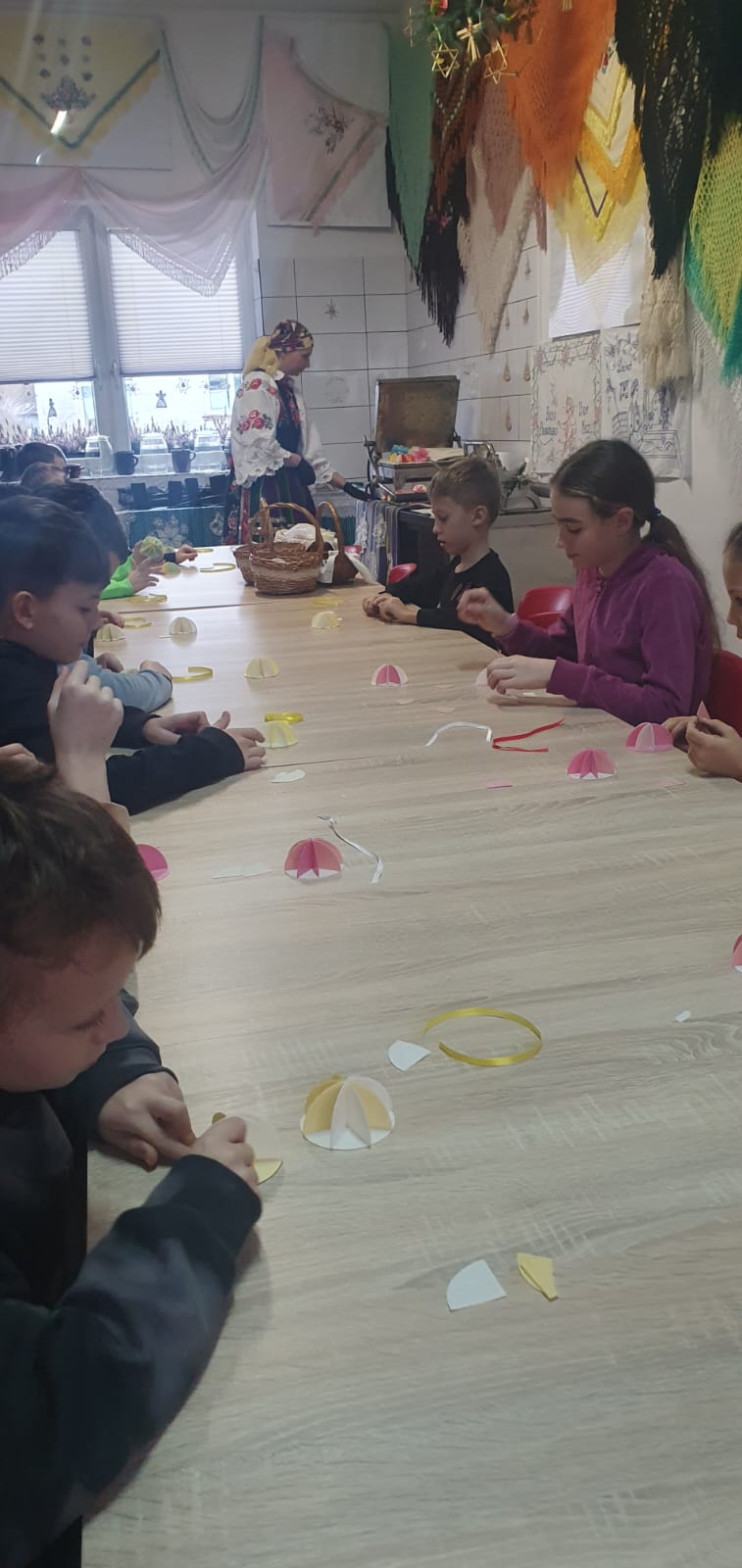 Następnie dzieci wzięły udział w warsztatach z tradycyjnego wyrobu tzw. światów (ozdób przestrzennych z elementów kolorowych opłatków) oraz ozdób świątecznych ze słomy.