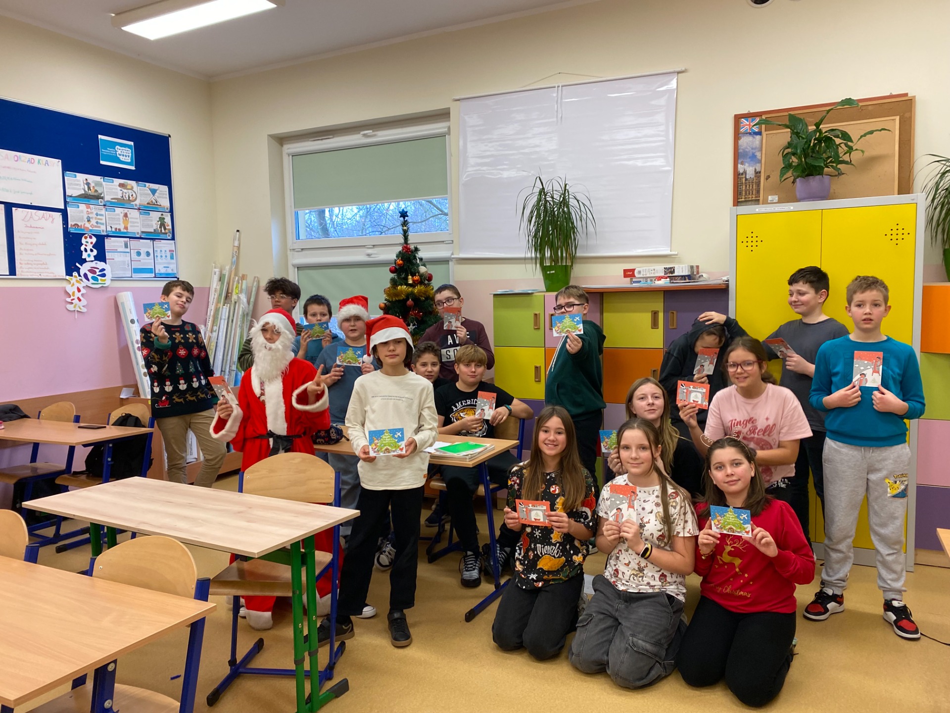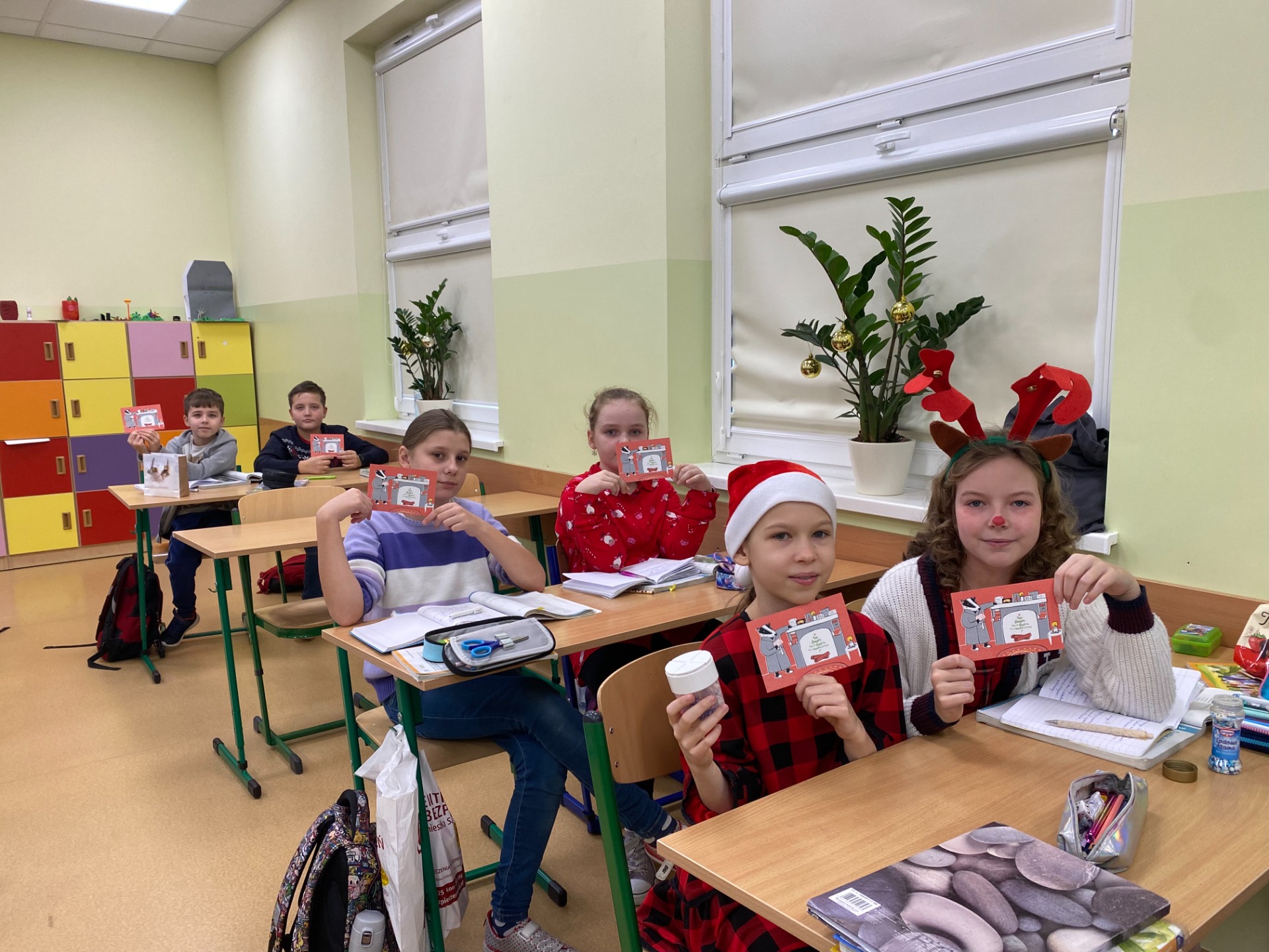 W grudniu, na lekcjach języka polskiego, nasi uczniowie redagowali życzenia świąteczne dla wybranych przez siebie osób. Następnie zapisywali je na kartkach pocztowych z limitowanej edycji zaprojektowanej przez rysowniczkę, panią Joannę Kurowską. 13 grudnia, podczas występu świątecznego członkowie Samorządu Uczniowskiego przekazali pocztówki z życzeniami podopiecznym Hospicjum im. Jana Pawła II w Zgierzu.