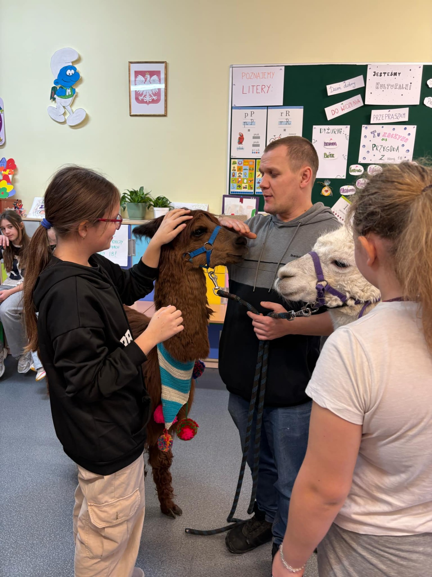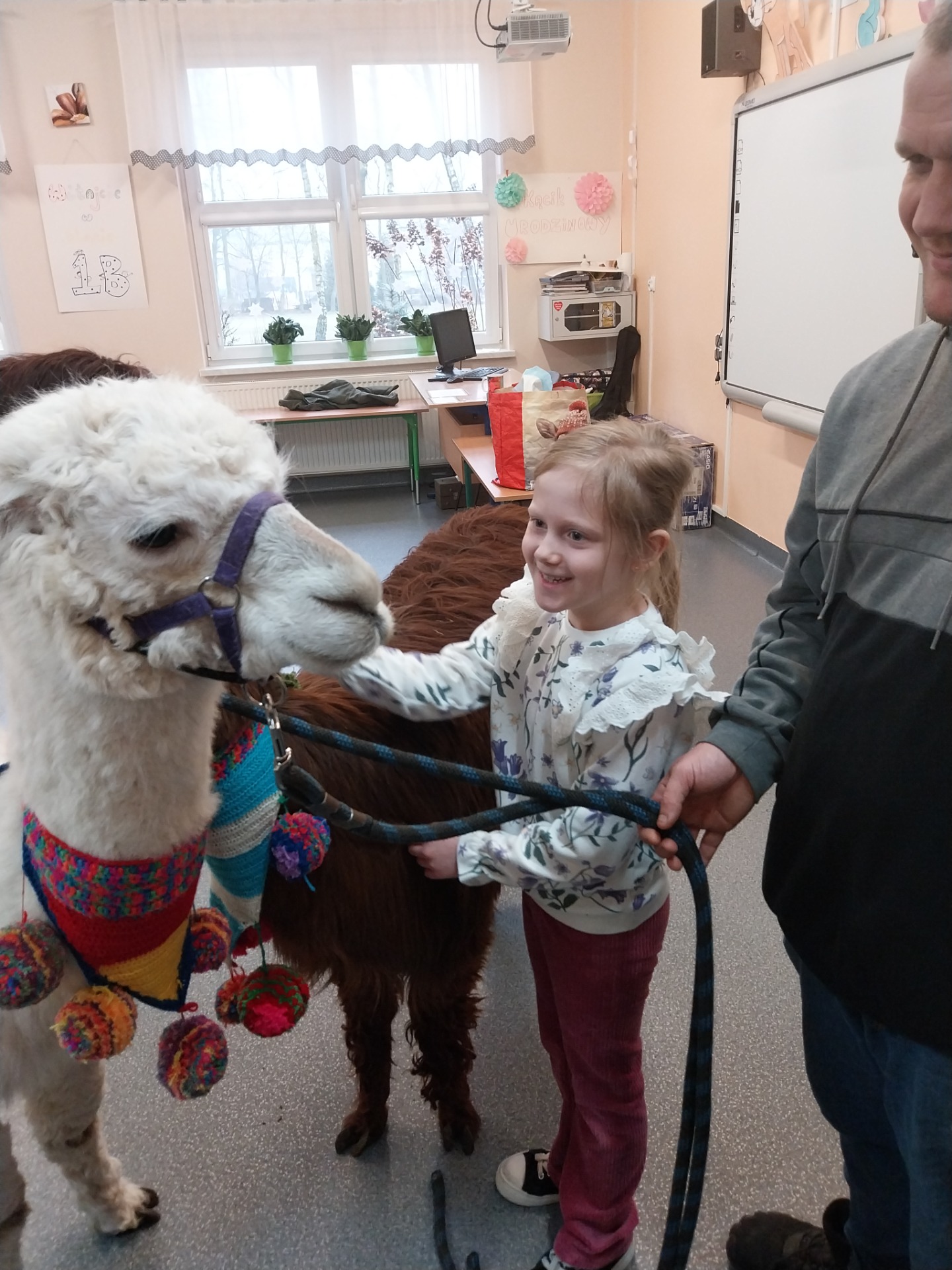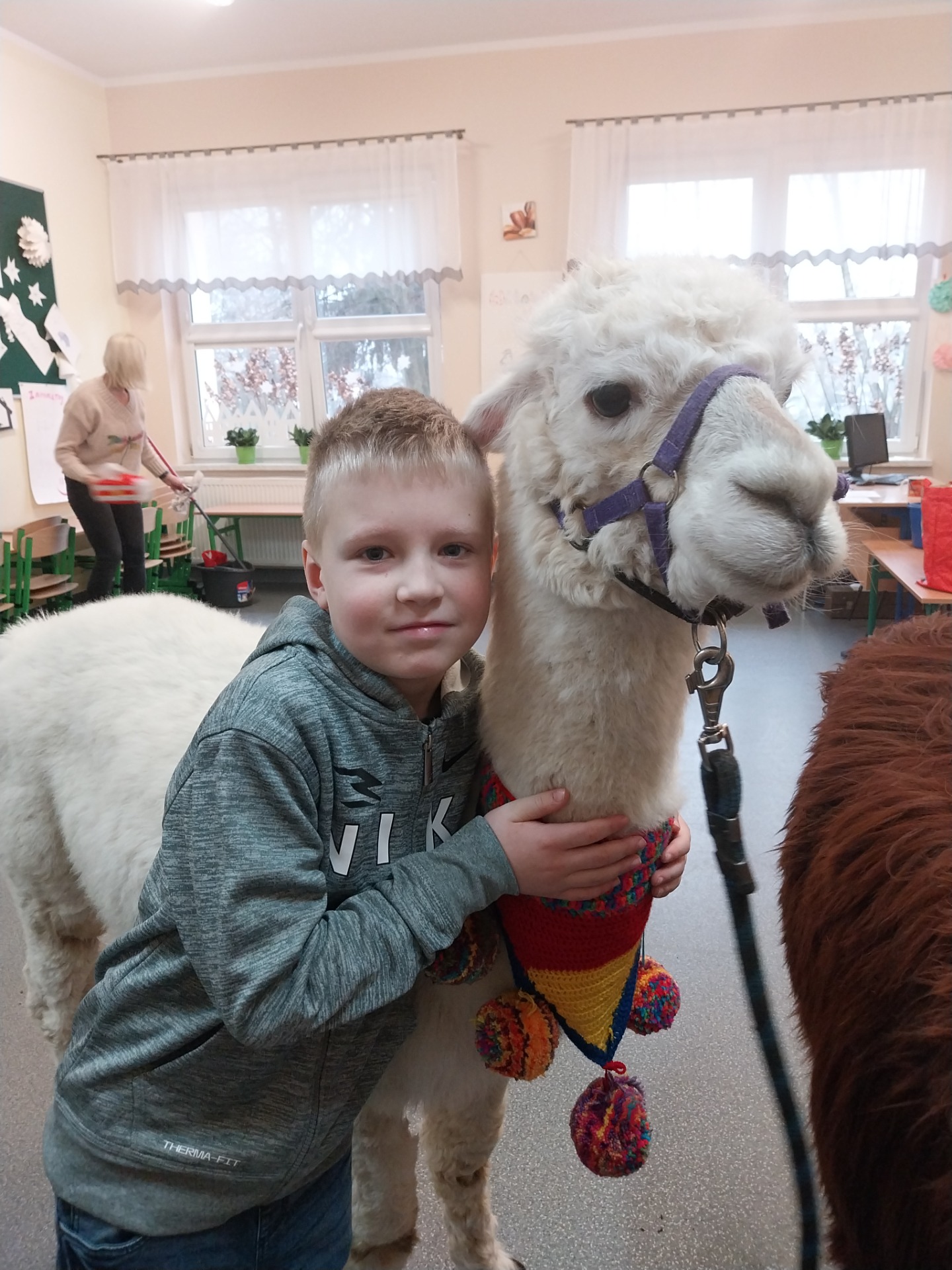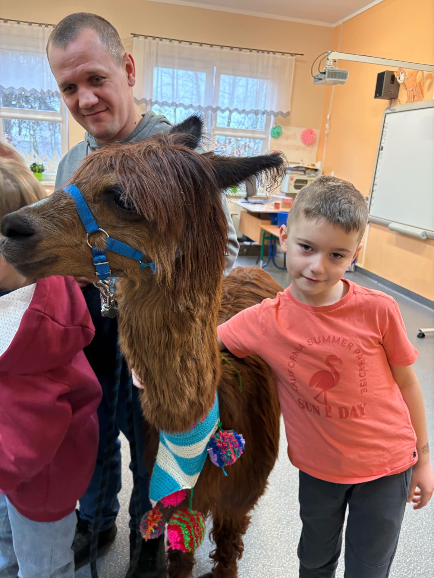 Czy alpaki można spotkać w lesie? Skąd pochodzą? Czy dużo jedzą? Jak długo żyją? Czego się boją? Te i inne pytania mogły zadać dzieci z klas 1-3 oraz z klasy 5 na warsztatach z alpakami. Okazało się, że Kropek i Kamiś to niezwykle przyjazne zwierzęta. Cierpliwie pozwalały się przytulać oraz karmić naszym uczniom. Od właściciela i instruktora Alpaki Cudaki uczniowie dowiedzieli się, że są one wykorzystywane w terapii chorych dzieci. Kontakt z tymi niezwykłymi zwierzętami pozwala przeżywać emocje, jakie trudno wyzwolić poprzez rozmowę. Dotykanie, głaskanie, wyprowadzanie na spacer tych pięknych stworzeń daje poczucie ogromnego relaksu. To było bardzo miłe i pouczające spotkanie!