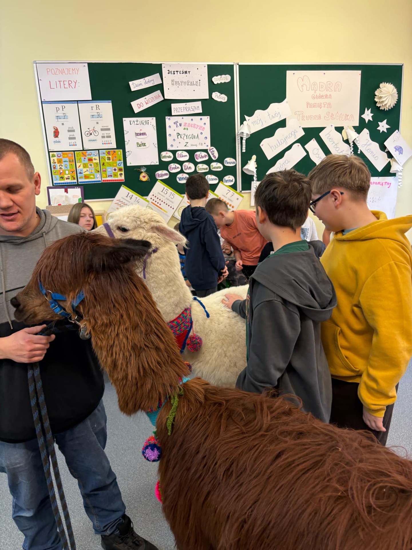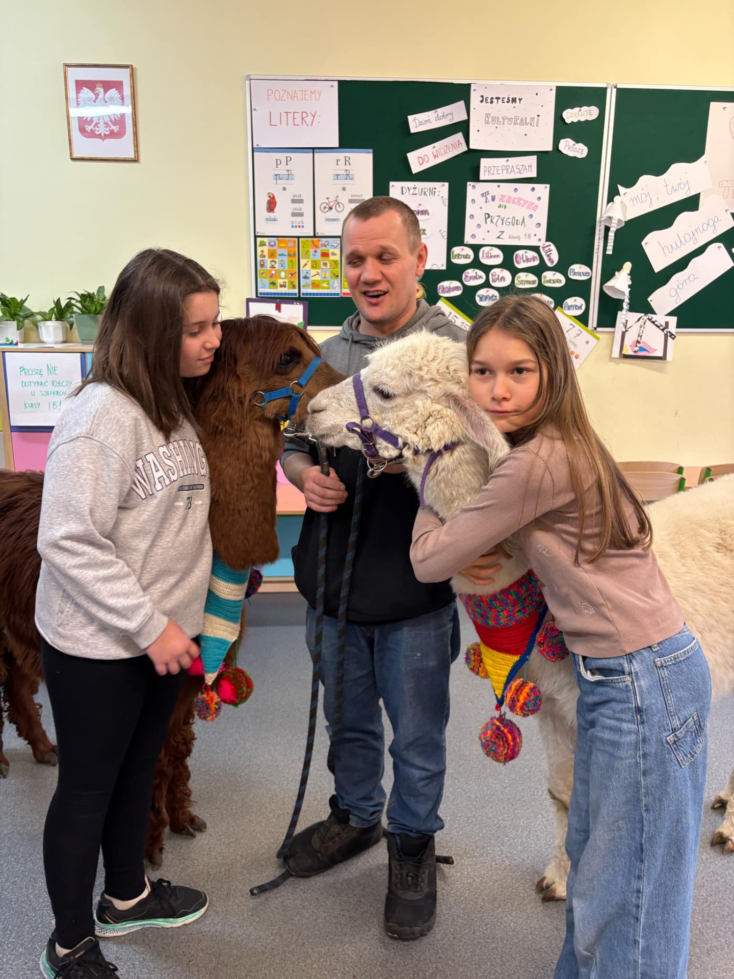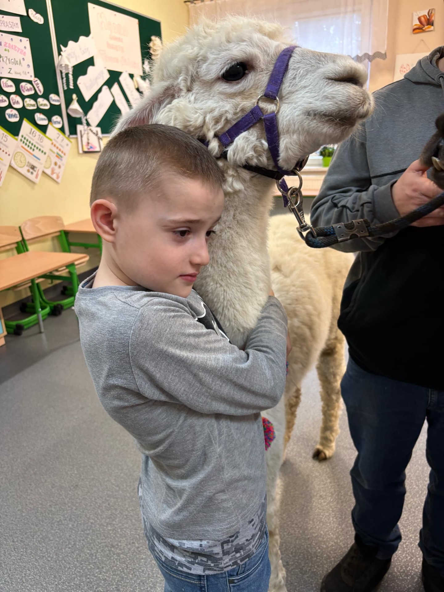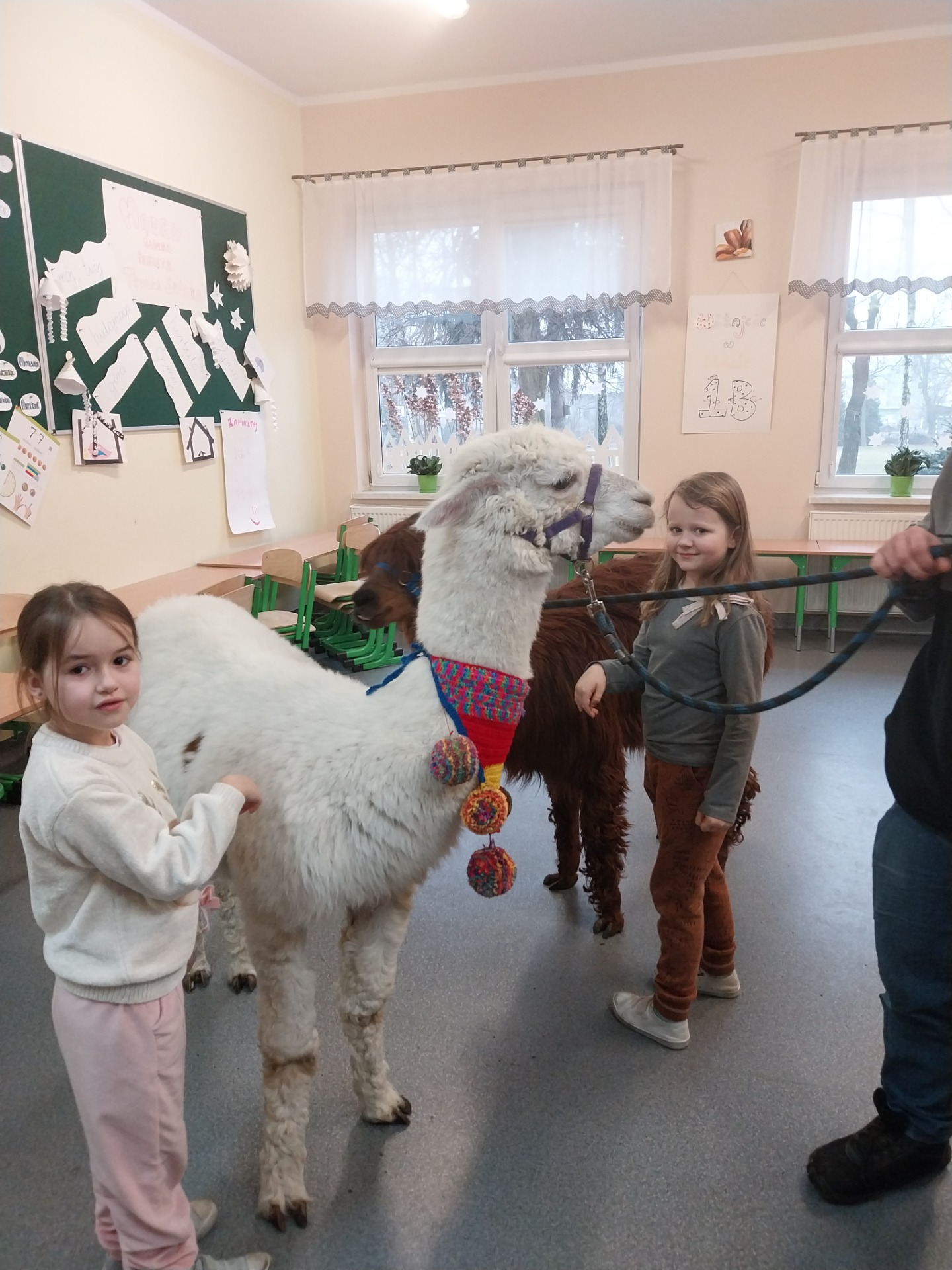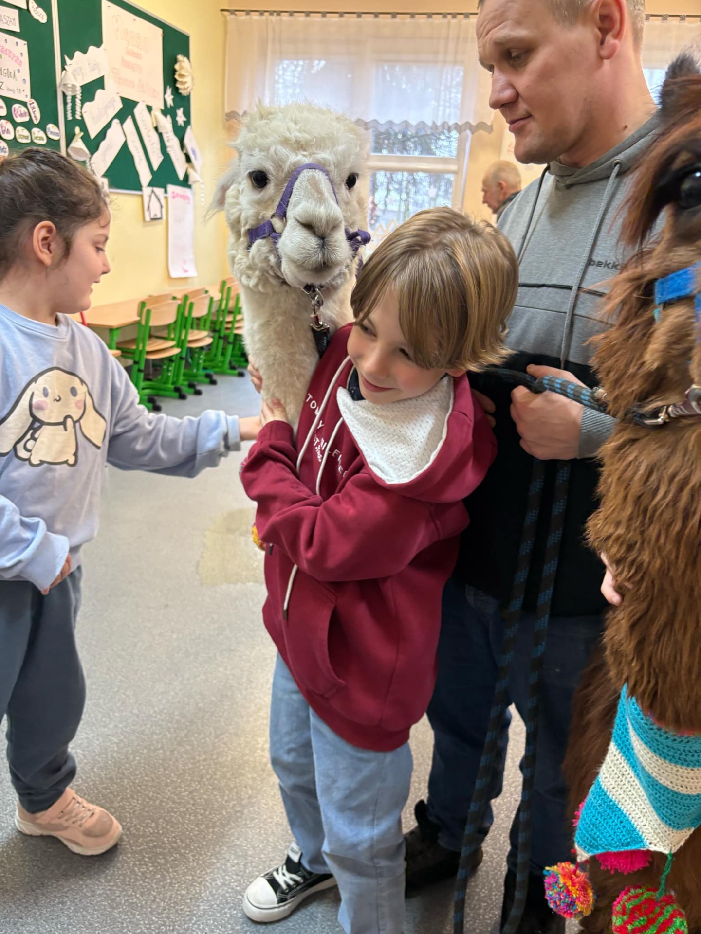 Czy alpaki można spotkać w lesie? Skąd pochodzą? Czy dużo jedzą? Jak długo żyją? Czego się boją? Te i inne pytania mogły zadać dzieci z klas 1-3 oraz z klasy 5 na warsztatach z alpakami. Okazało się, że Kropek i Kamiś to niezwykle przyjazne zwierzęta. Cierpliwie pozwalały się przytulać oraz karmić naszym uczniom. Od właściciela i instruktora Alpaki Cudaki uczniowie dowiedzieli się, że są one wykorzystywane w terapii chorych dzieci. Kontakt z tymi niezwykłymi zwierzętami pozwala przeżywać emocje, jakie trudno wyzwolić poprzez rozmowę. Dotykanie, głaskanie, wyprowadzanie na spacer tych pięknych stworzeń daje poczucie ogromnego relaksu. To było bardzo miłe i pouczające spotkanie!