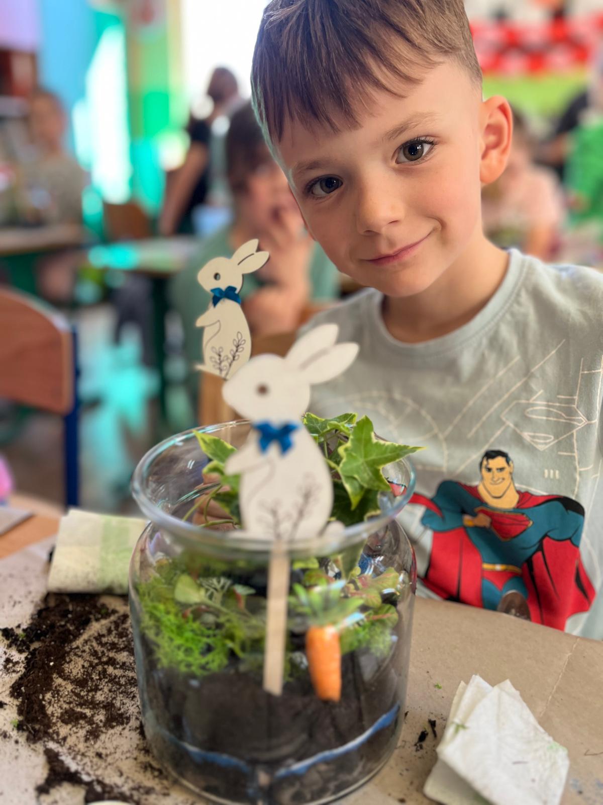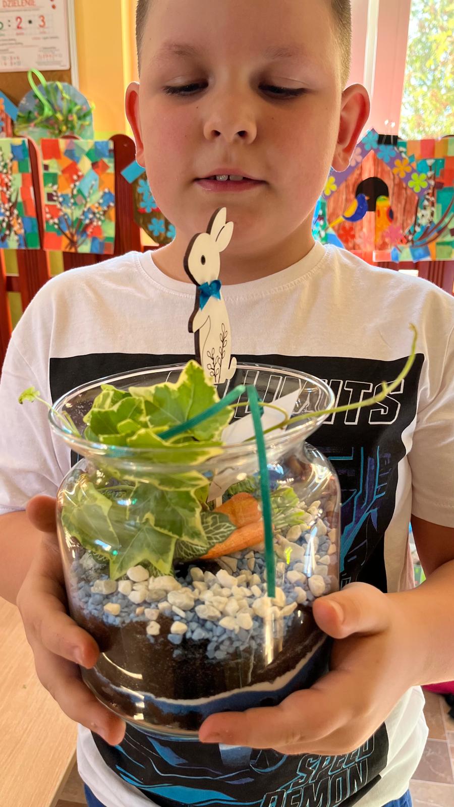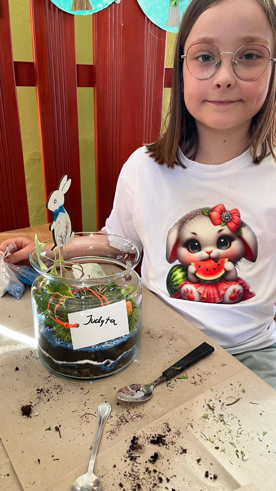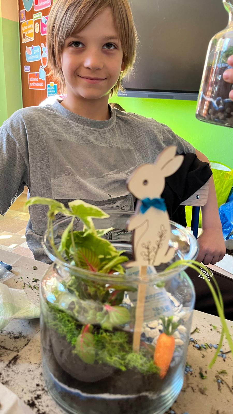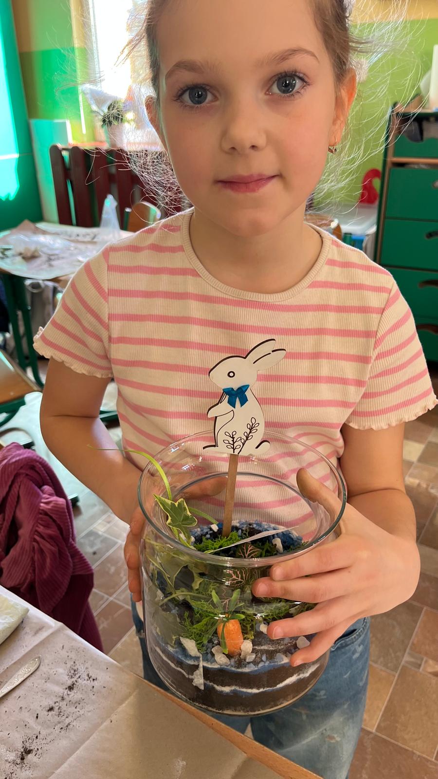 W czwartkowy poranek - 3 kwietnia - dzieci z klas drugich uczestniczyły w niezwykłych warsztatach, podczas których wykonały piękne dekoracje w szklanych naczyniach. Każdy uczestnik otrzymał słoik, który stał się bazą do stworzenia wiosenno-wielkanocnej dekoracji. Wewnątrz niego dzieci układały różnorodne materiały, takie jak: kolorowe kamyczki, kwiaty, a także miniaturowe figurki zajączków i sztuczny mech. Zadanie wymagało od dzieci nie tylko kreatywności, ale także precyzji w układaniu elementów, co było świetnym ćwiczeniem na rozwijanie zdolności manualnych oraz wyobraźni przestrzennej.