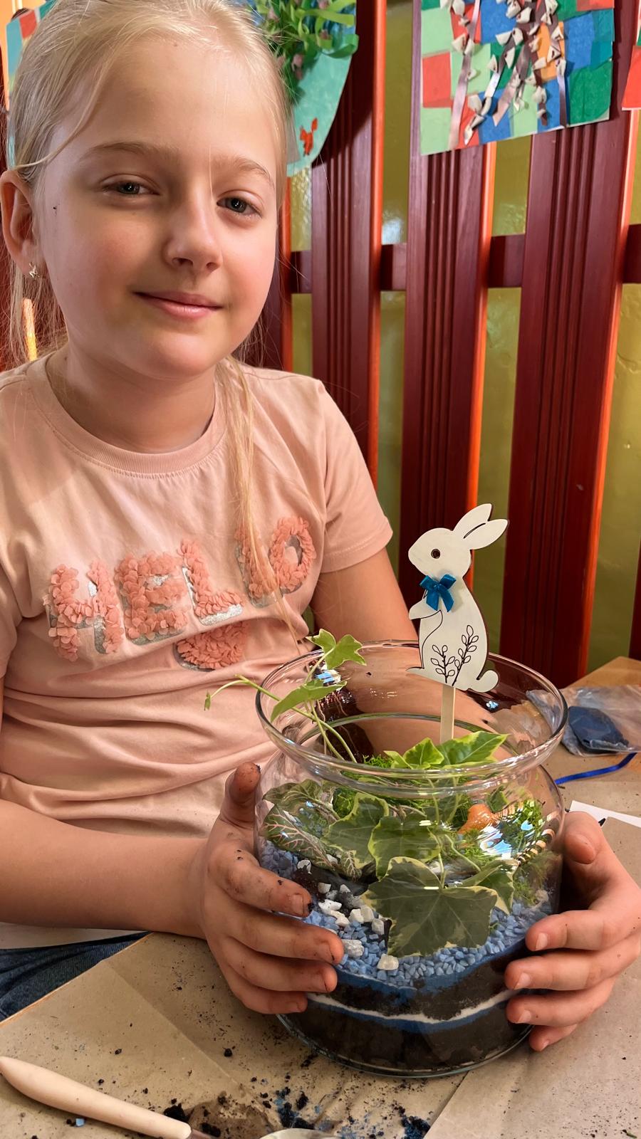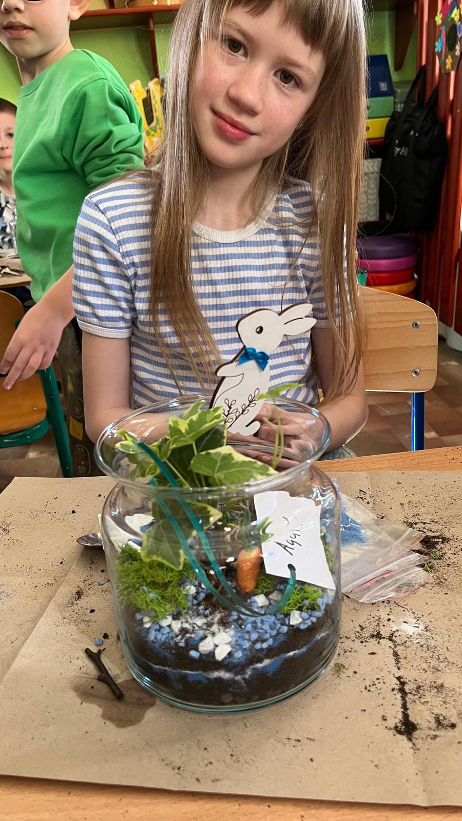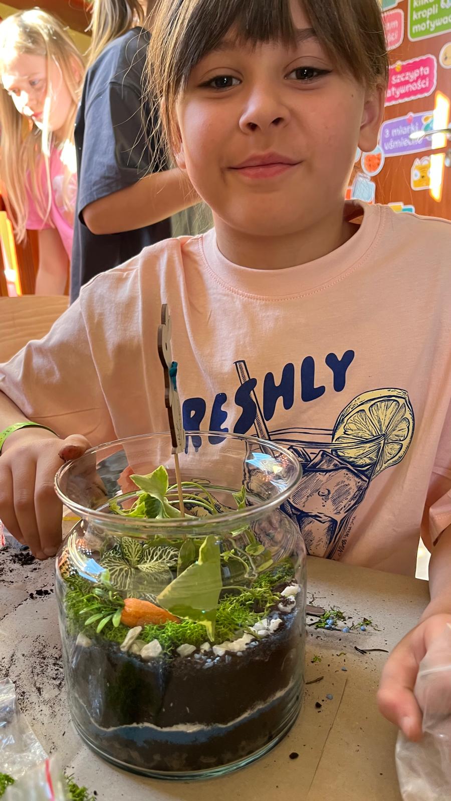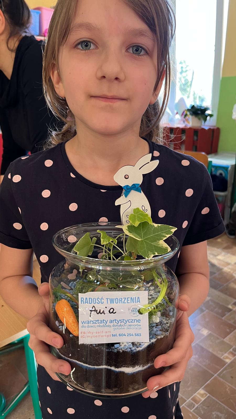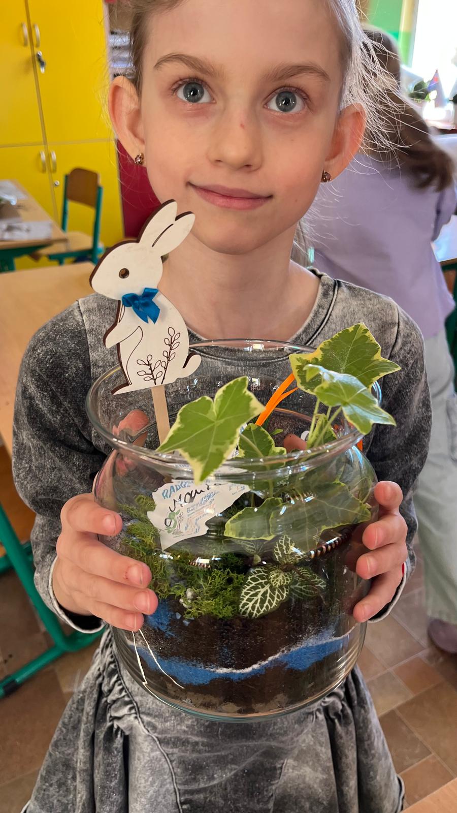W czwartkowy poranek - 3 kwietnia - dzieci z klas drugich uczestniczyły w niezwykłych warsztatach, podczas których wykonały piękne dekoracje w szklanych naczyniach. Każdy uczestnik otrzymał słoik, który stał się bazą do stworzenia wiosenno-wielkanocnej dekoracji. Wewnątrz niego dzieci układały różnorodne materiały, takie jak: kolorowe kamyczki, kwiaty, a także miniaturowe figurki zajączków i sztuczny mech. Zadanie wymagało od dzieci nie tylko kreatywności, ale także precyzji w układaniu elementów, co było świetnym ćwiczeniem na rozwijanie zdolności manualnych oraz wyobraźni przestrzennej.