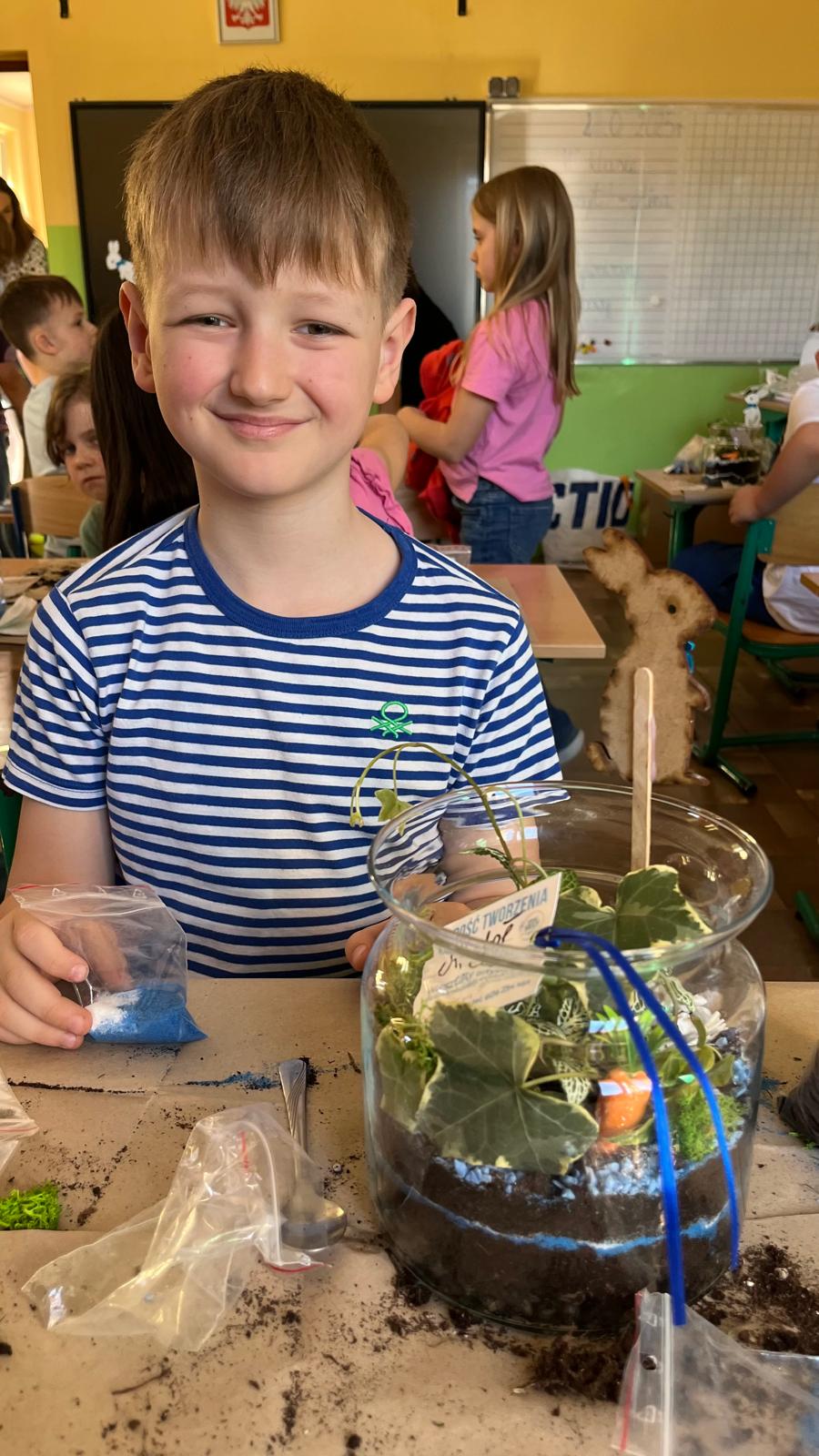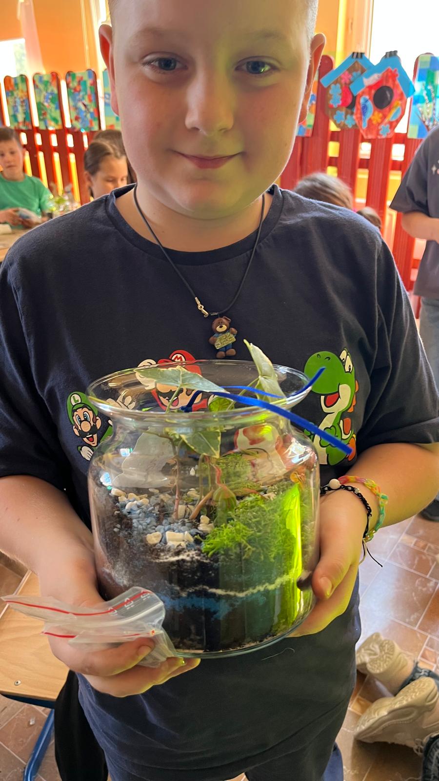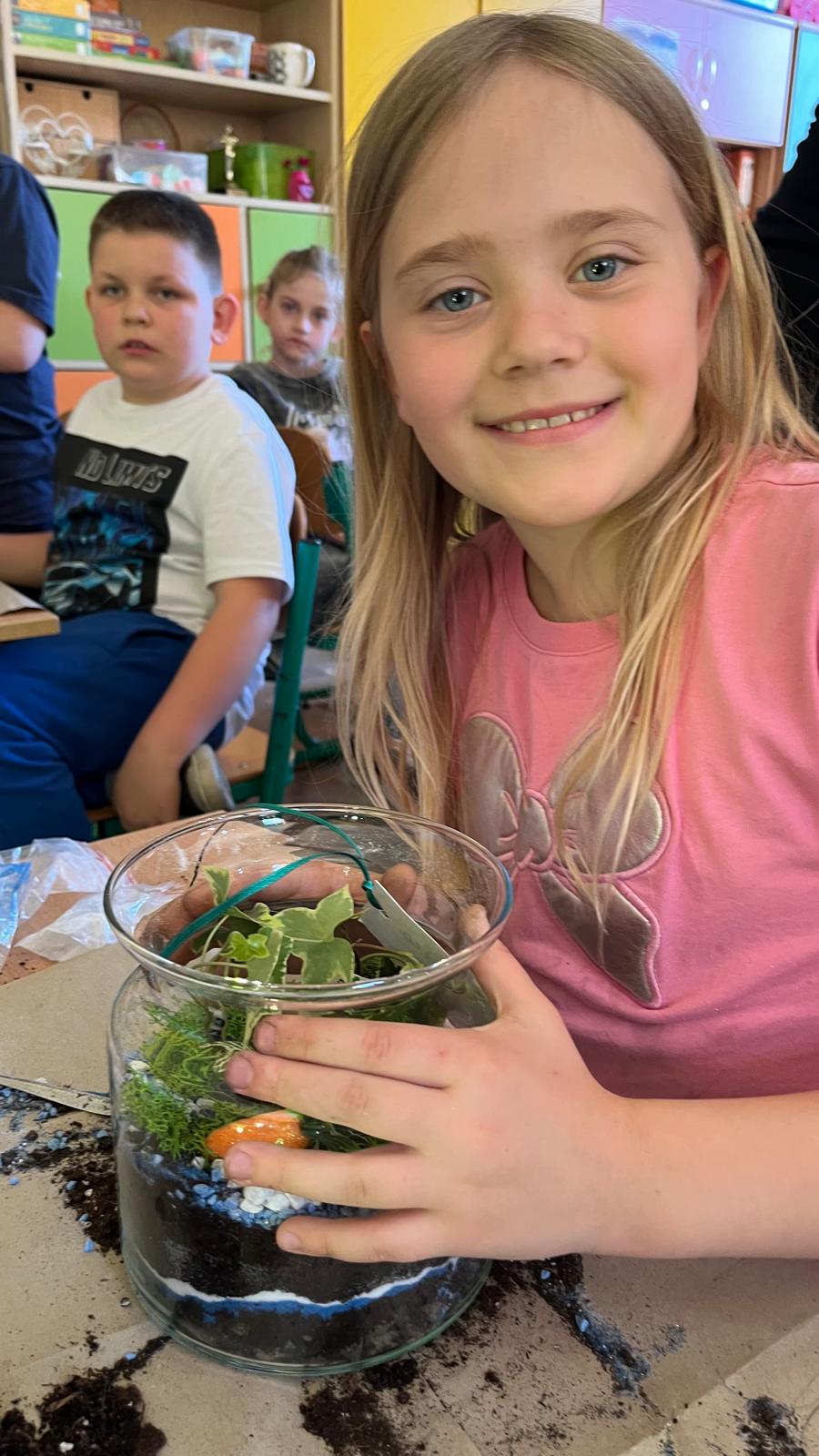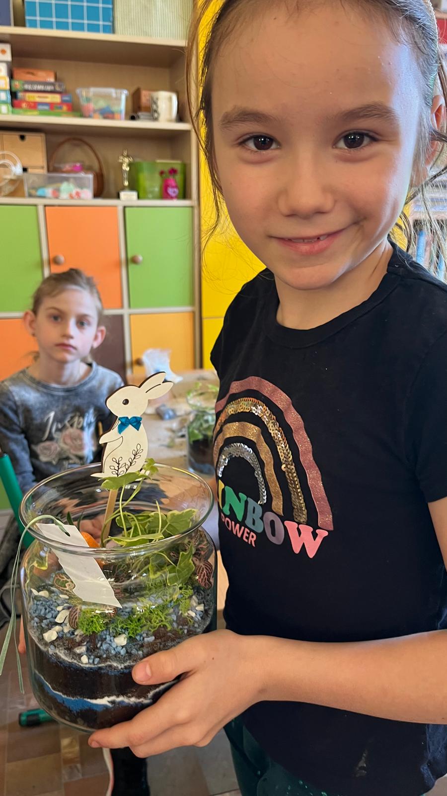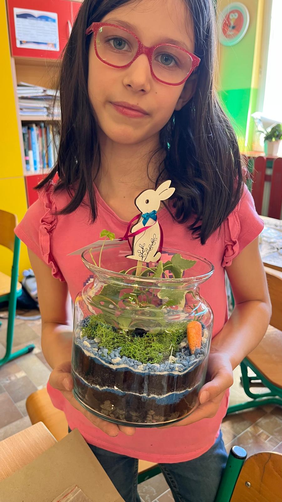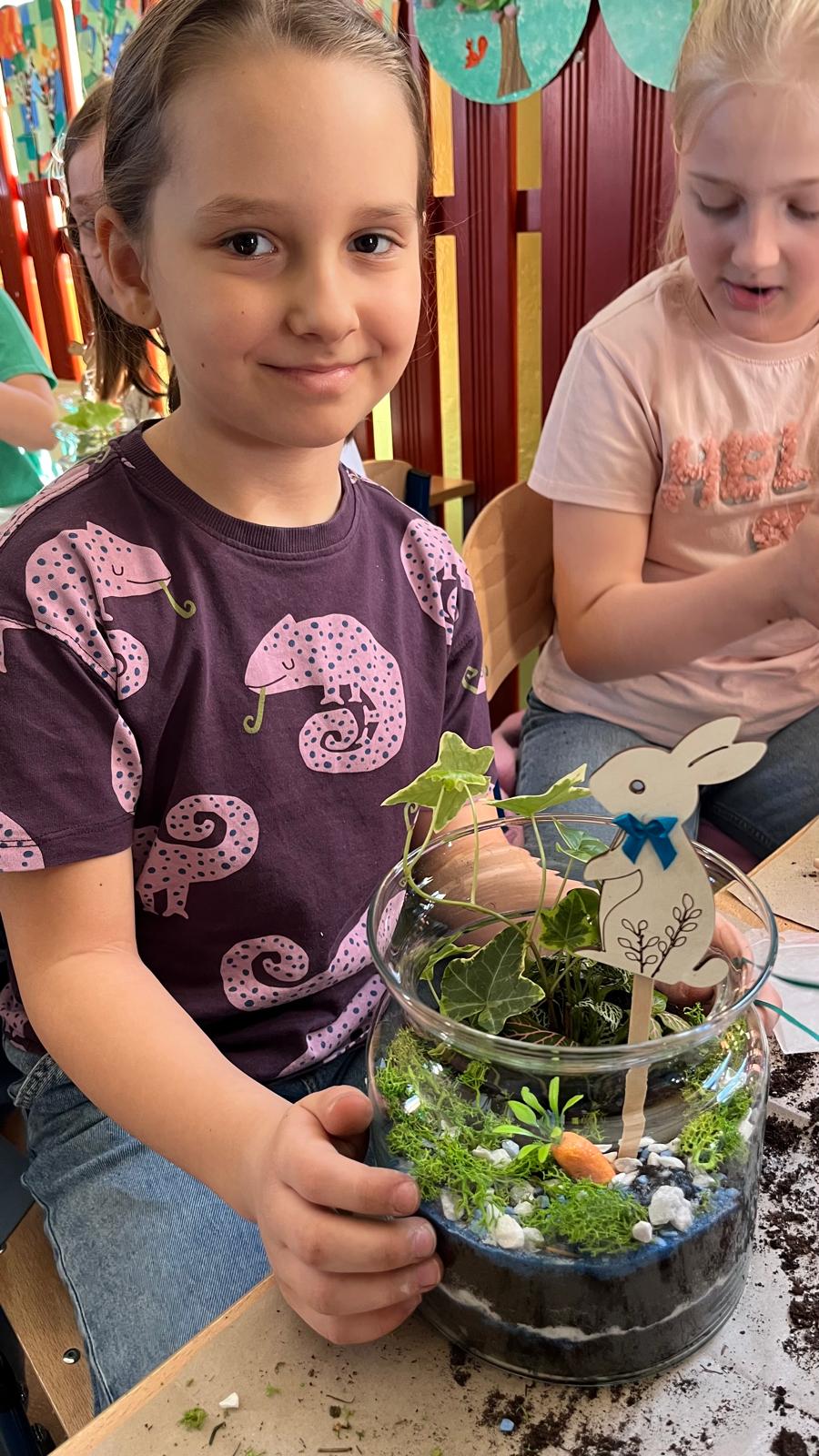 W czwartkowy poranek - 3 kwietnia - dzieci z klas drugich uczestniczyły w niezwykłych warsztatach, podczas których wykonały piękne dekoracje w szklanych naczyniach. Każdy uczestnik otrzymał słoik, który stał się bazą do stworzenia wiosenno-wielkanocnej dekoracji. Wewnątrz niego dzieci układały różnorodne materiały, takie jak: kolorowe kamyczki, kwiaty, a także miniaturowe figurki zajączków i sztuczny mech. Zadanie wymagało od dzieci nie tylko kreatywności, ale także precyzji w układaniu elementów, co było świetnym ćwiczeniem na rozwijanie zdolności manualnych oraz wyobraźni przestrzennej.