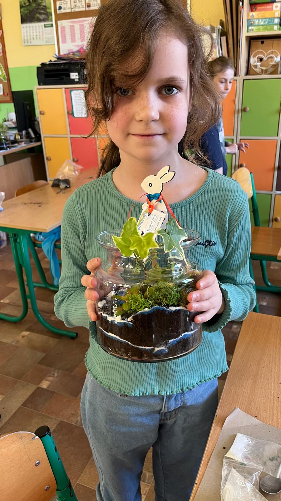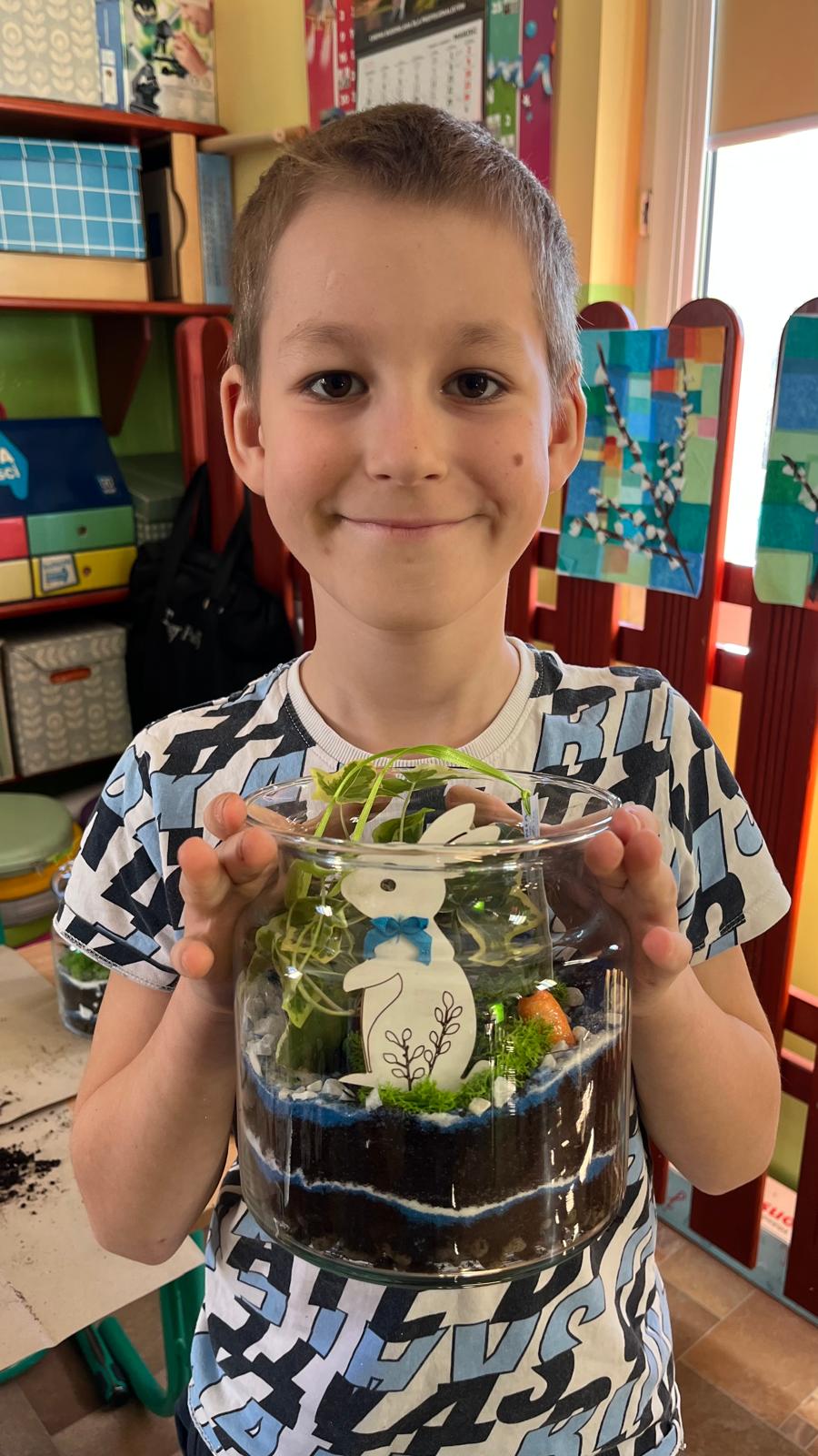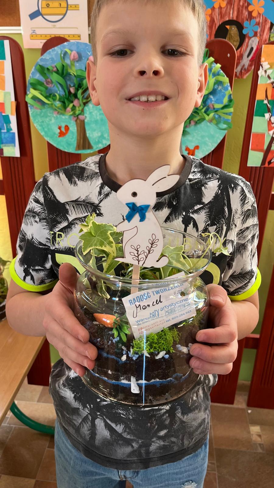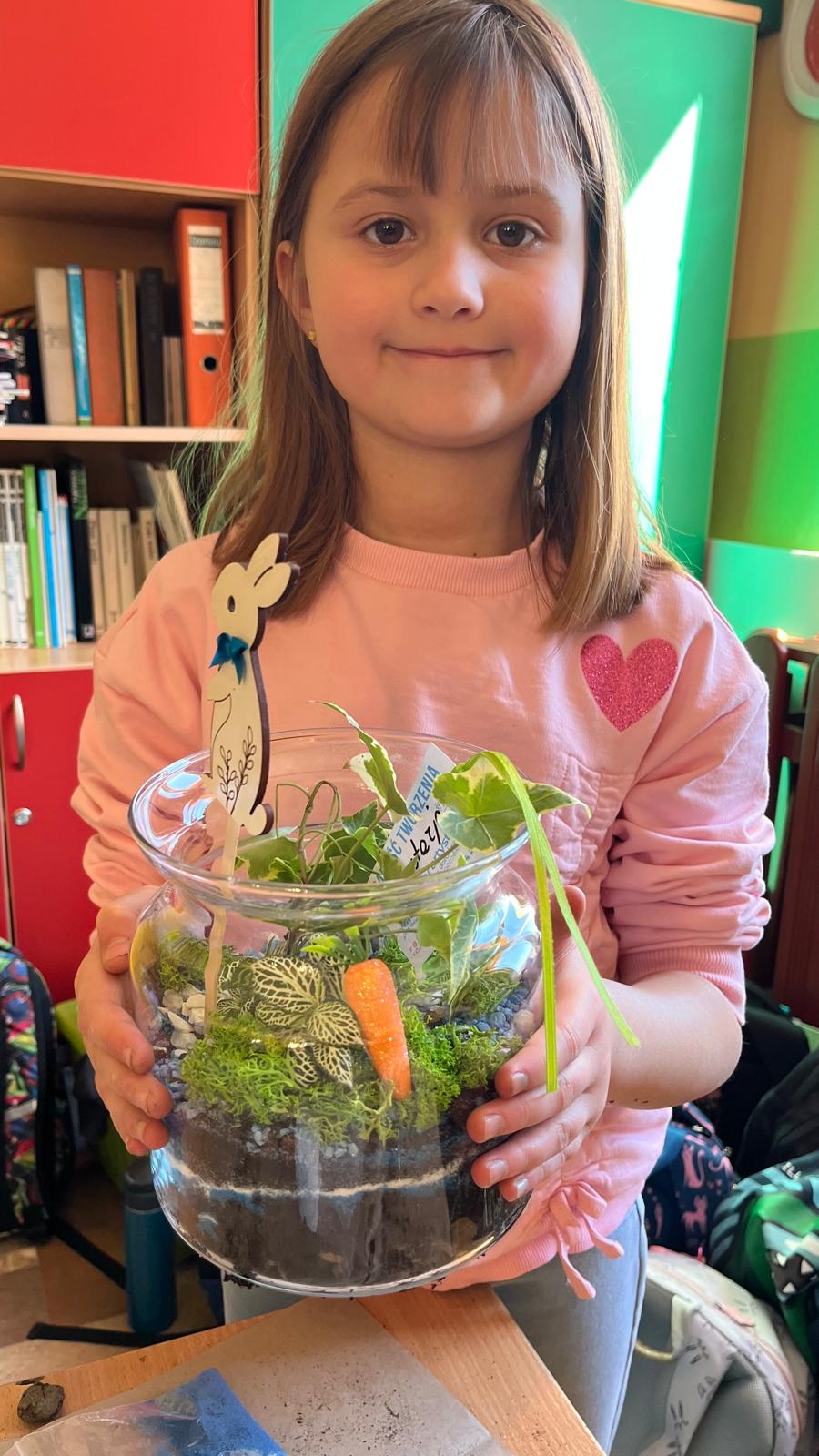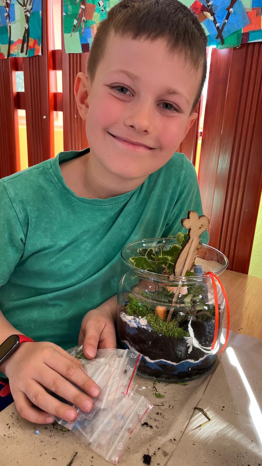 W czwartkowy poranek - 3 kwietnia - dzieci z klas drugich uczestniczyły w niezwykłych warsztatach, podczas których wykonały piękne dekoracje w szklanych naczyniach. Każdy uczestnik otrzymał słoik, który stał się bazą do stworzenia wiosenno-wielkanocnej dekoracji. Wewnątrz niego dzieci układały różnorodne materiały, takie jak: kolorowe kamyczki, kwiaty, a także miniaturowe figurki zajączków i sztuczny mech. Zadanie wymagało od dzieci nie tylko kreatywności, ale także precyzji w układaniu elementów, co było świetnym ćwiczeniem na rozwijanie zdolności manualnych oraz wyobraźni przestrzennej.