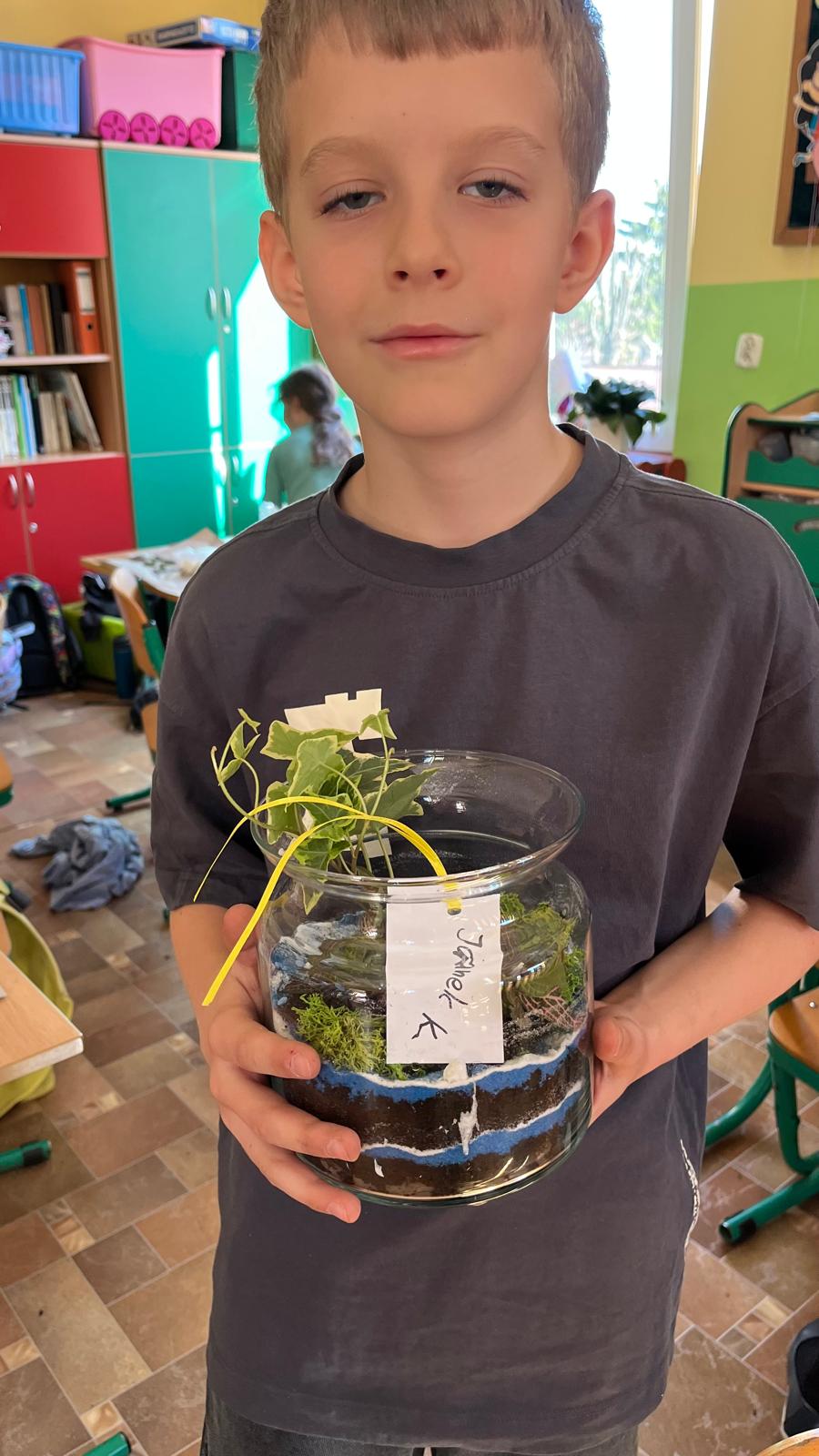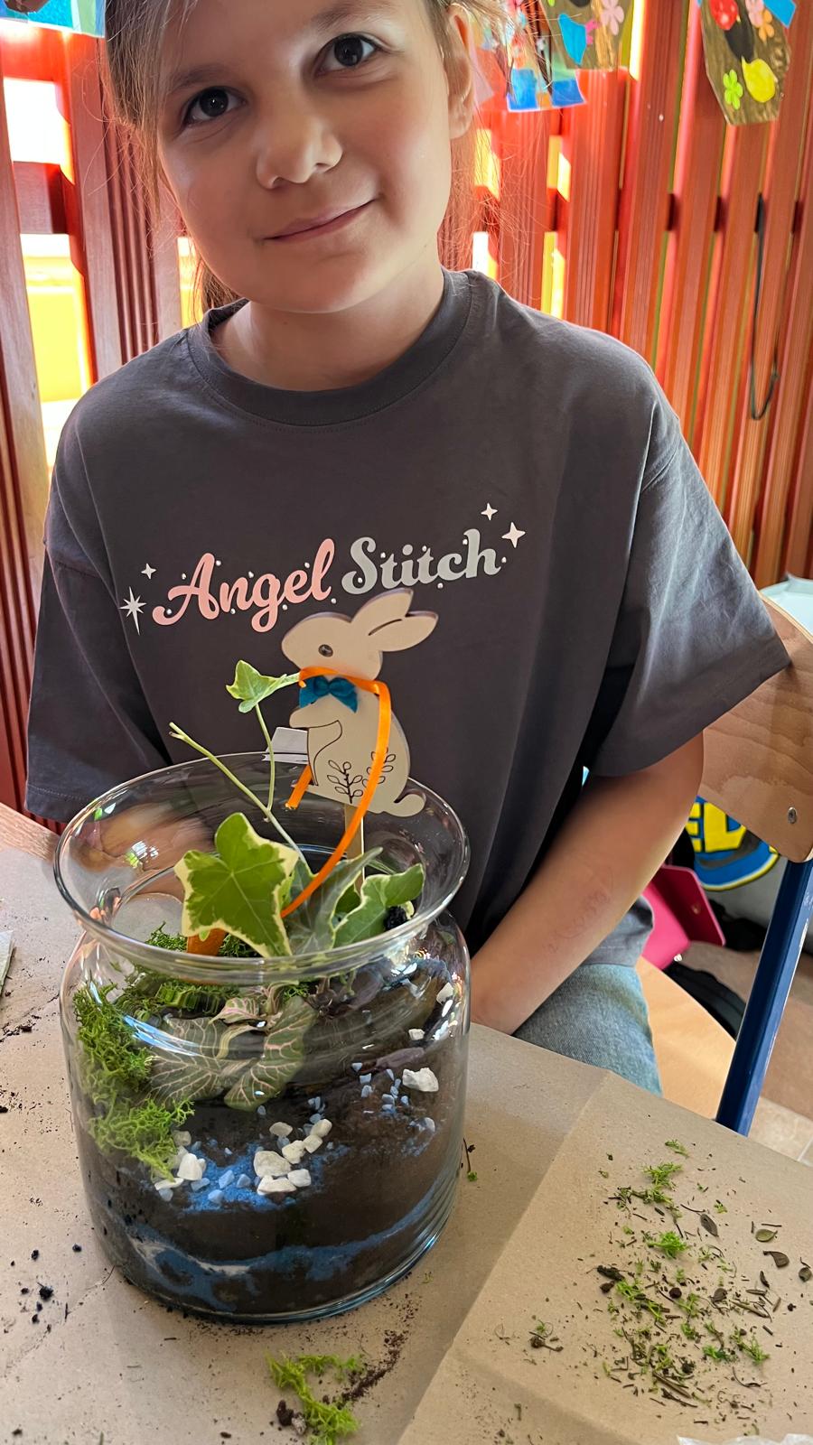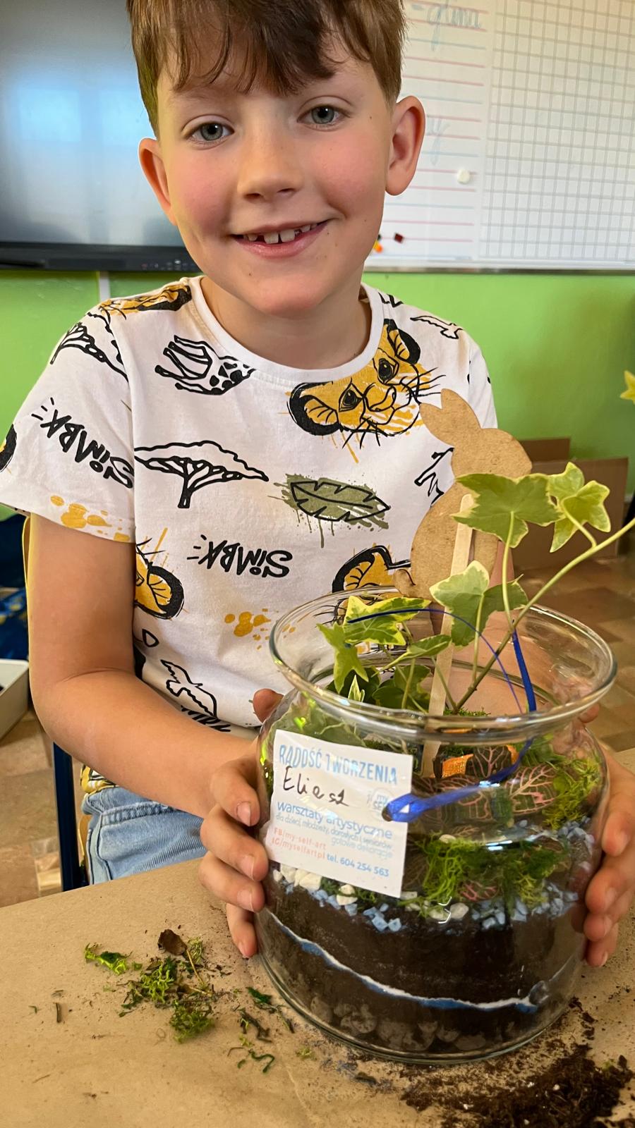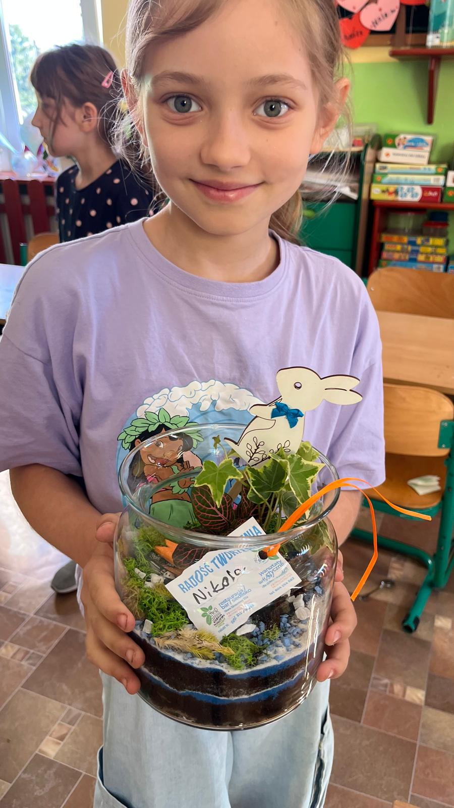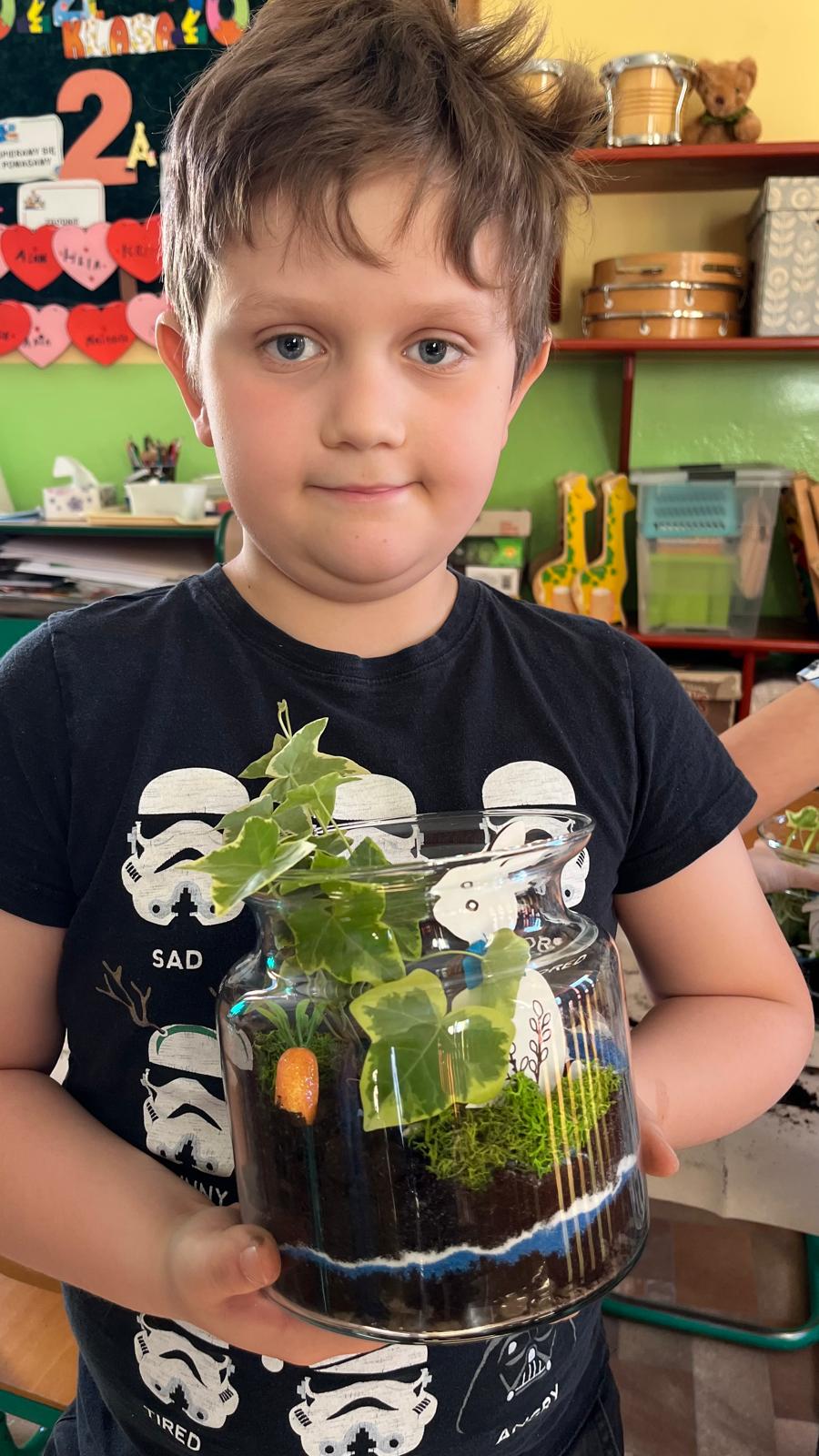 W czwartkowy poranek - 3 kwietnia - dzieci z klas drugich uczestniczyły w niezwykłych warsztatach, podczas których wykonały piękne dekoracje w szklanych naczyniach. Każdy uczestnik otrzymał słoik, który stał się bazą do stworzenia wiosenno-wielkanocnej dekoracji. Wewnątrz niego dzieci układały różnorodne materiały, takie jak: kolorowe kamyczki, kwiaty, a także miniaturowe figurki zajączków i sztuczny mech. Zadanie wymagało od dzieci nie tylko kreatywności, ale także precyzji w układaniu elementów, co było świetnym ćwiczeniem na rozwijanie zdolności manualnych oraz wyobraźni przestrzennej.