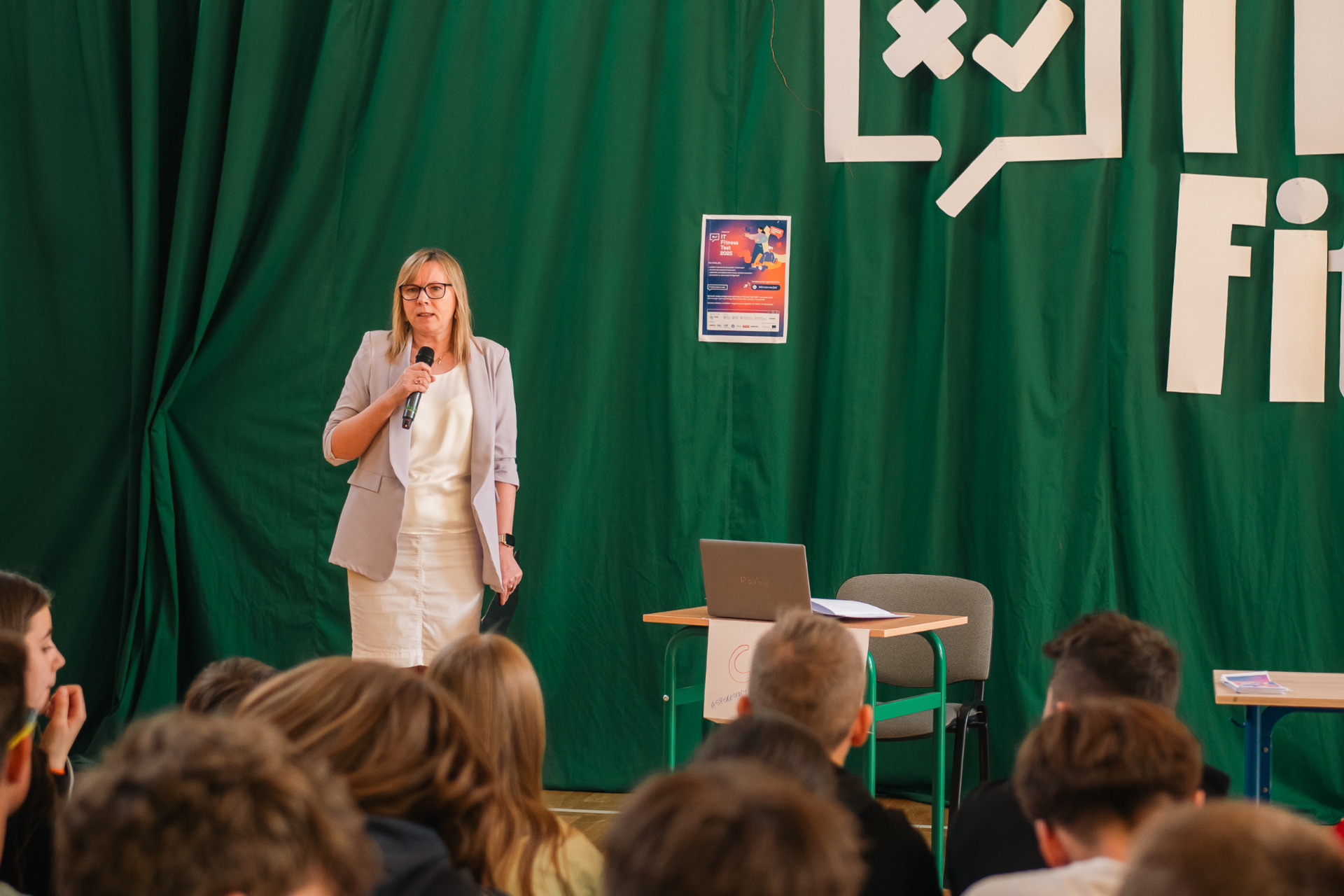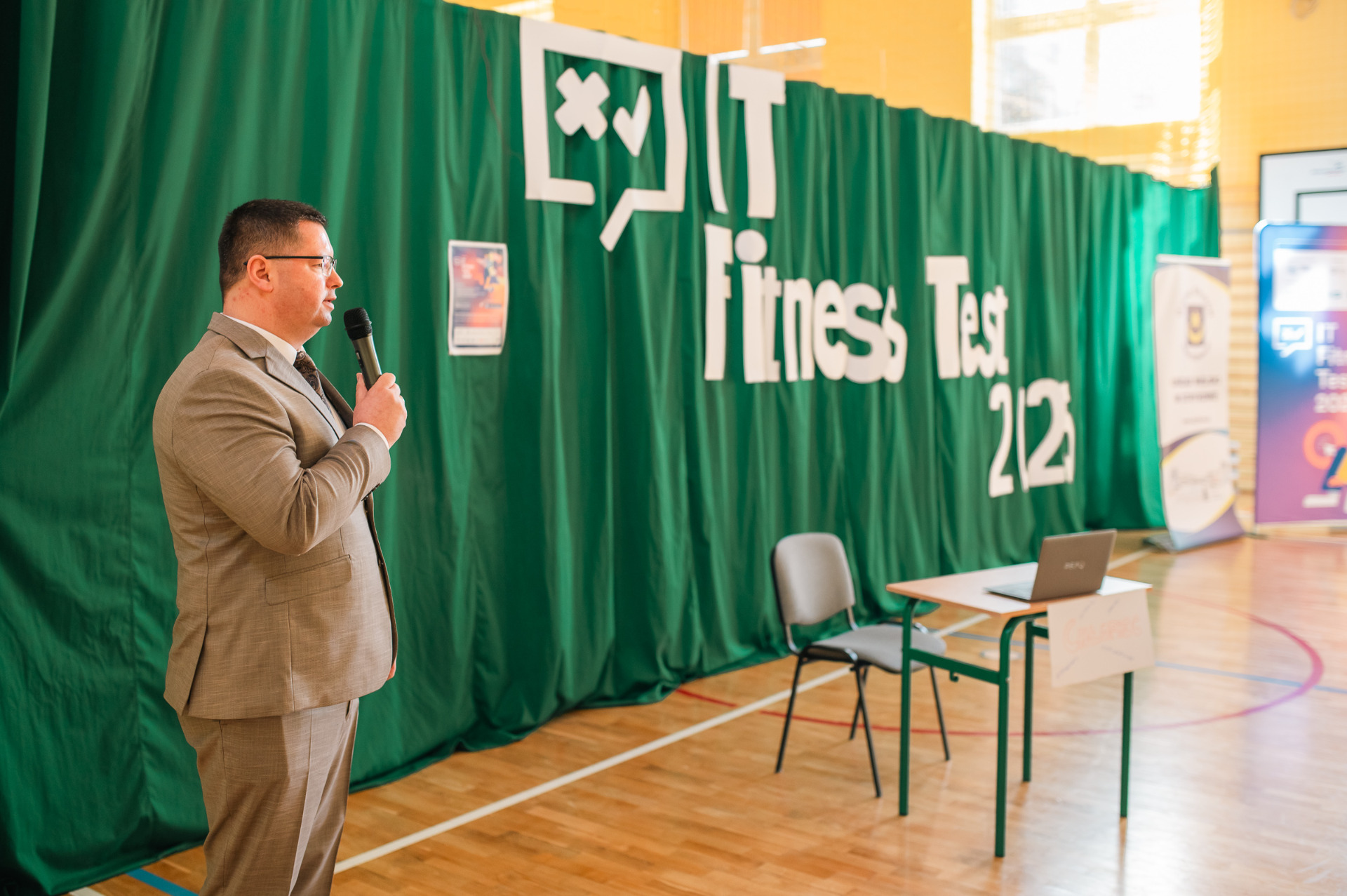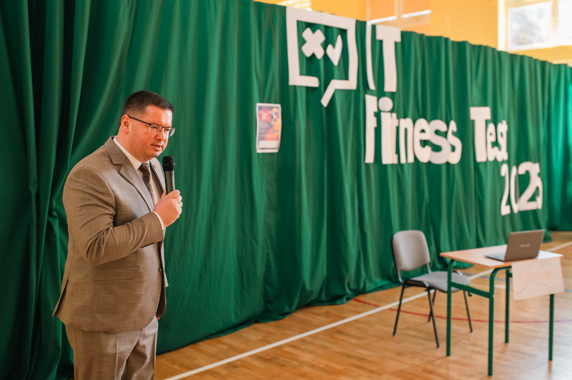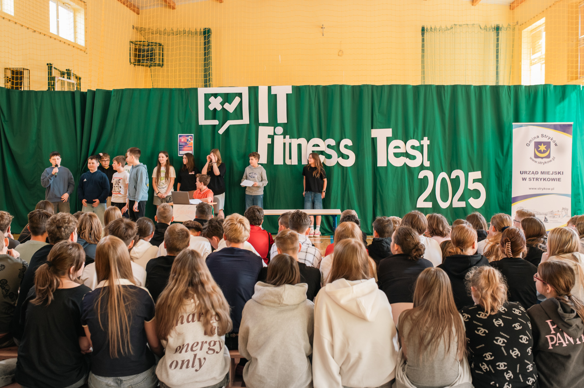 Na początku Pani Dyrektor Małgorzata Wielgus powitała wszystkich zebranych. Następnie zgromadzeni wysłuchali wystąpień osób odpowiedzialnych za organizację wydarzenia. Zastępca Burmistrza Strykowa Adam Kaźmierczak wygłosił krótkie przemówienie skierowane do uczniów, wyjaśniając znaczenie testu oraz zachęcając do aktywnego w nim udziału. Kolejnym mówcą był Michał Kanownik, Prezes Zarządu Cyfrowej Polski, który przedstawił uczniom, czym jest IT Fitness Test i jakie korzyści płyną z jego rozwiązywania.