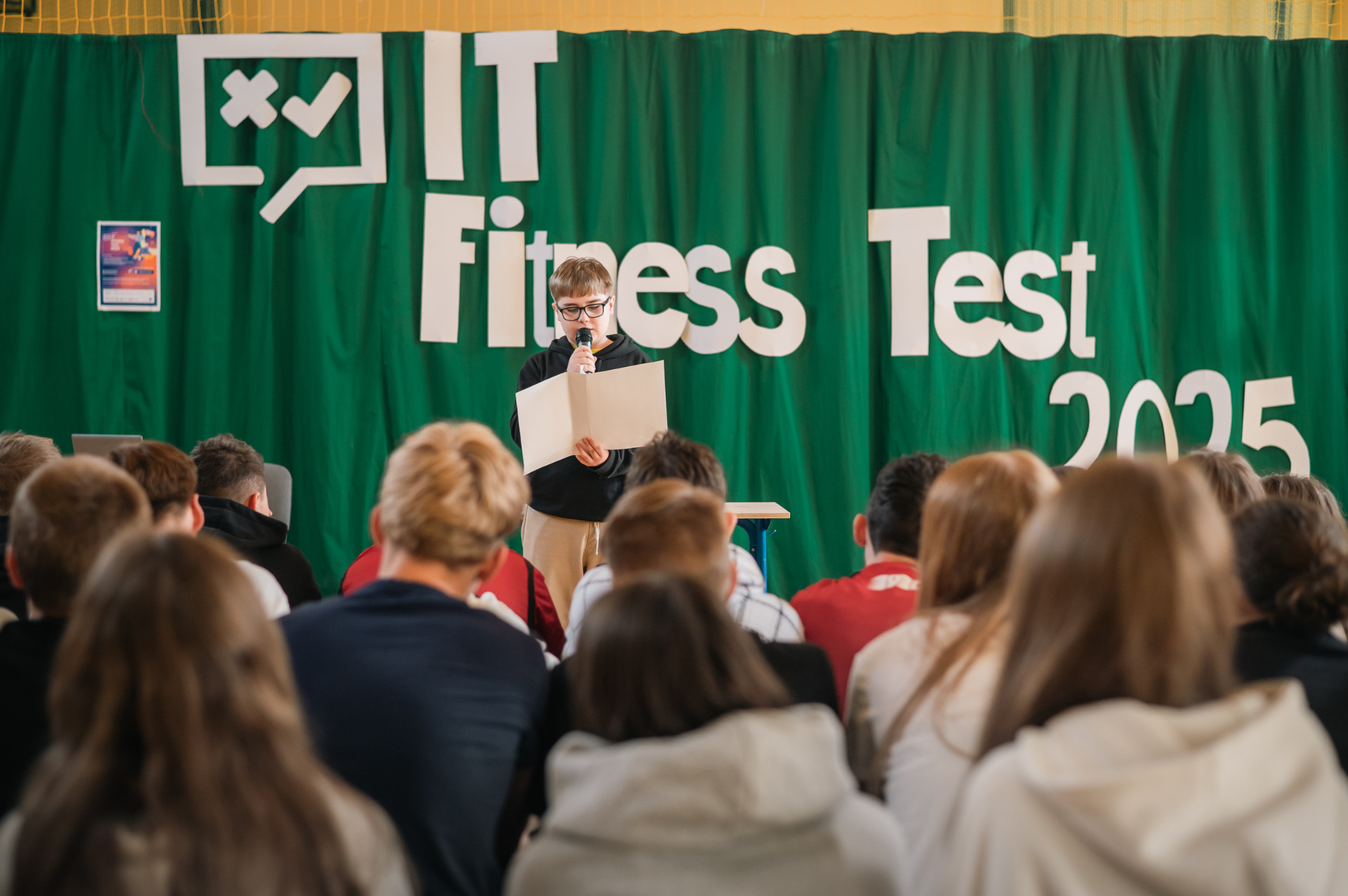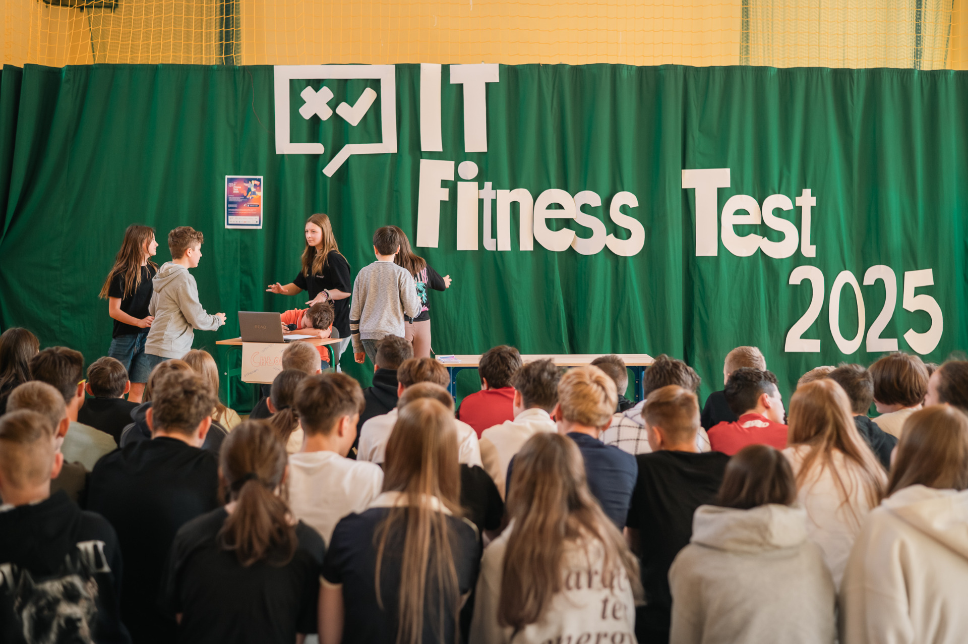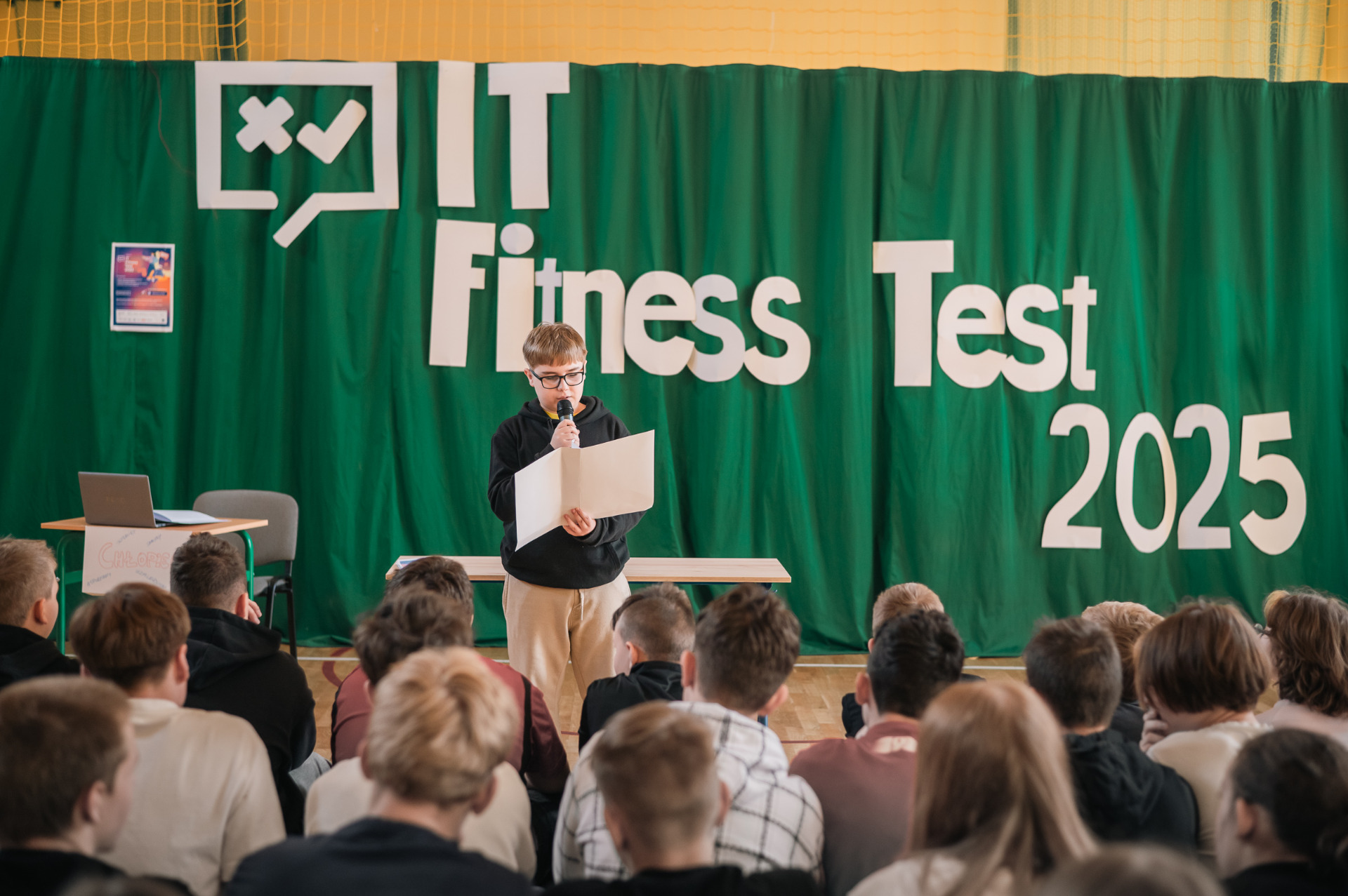 W dniu 14 kwietnia uczniowie naszej szkoły przystąpili do IT Fitness Test 2025, który miał na celu sprawdzenie ich umiejętności z zakresu technologii informacyjnych. Inauguracja wydarzenia miała miejsce w sali gimnastycznej, gdzie zgromadzili się zaproszeni goście, nauczyciele oraz uczniowie.