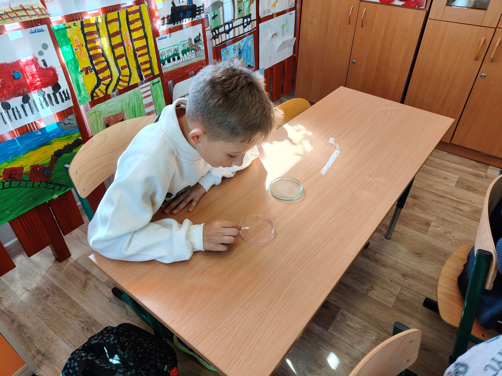 Następnie uczniowie przeprowadzili doświadczenie, którego celem było zebranie materiału biologicznego, z którego zostaną wyhodowane preparaty zawierające grzyby i bakterie.