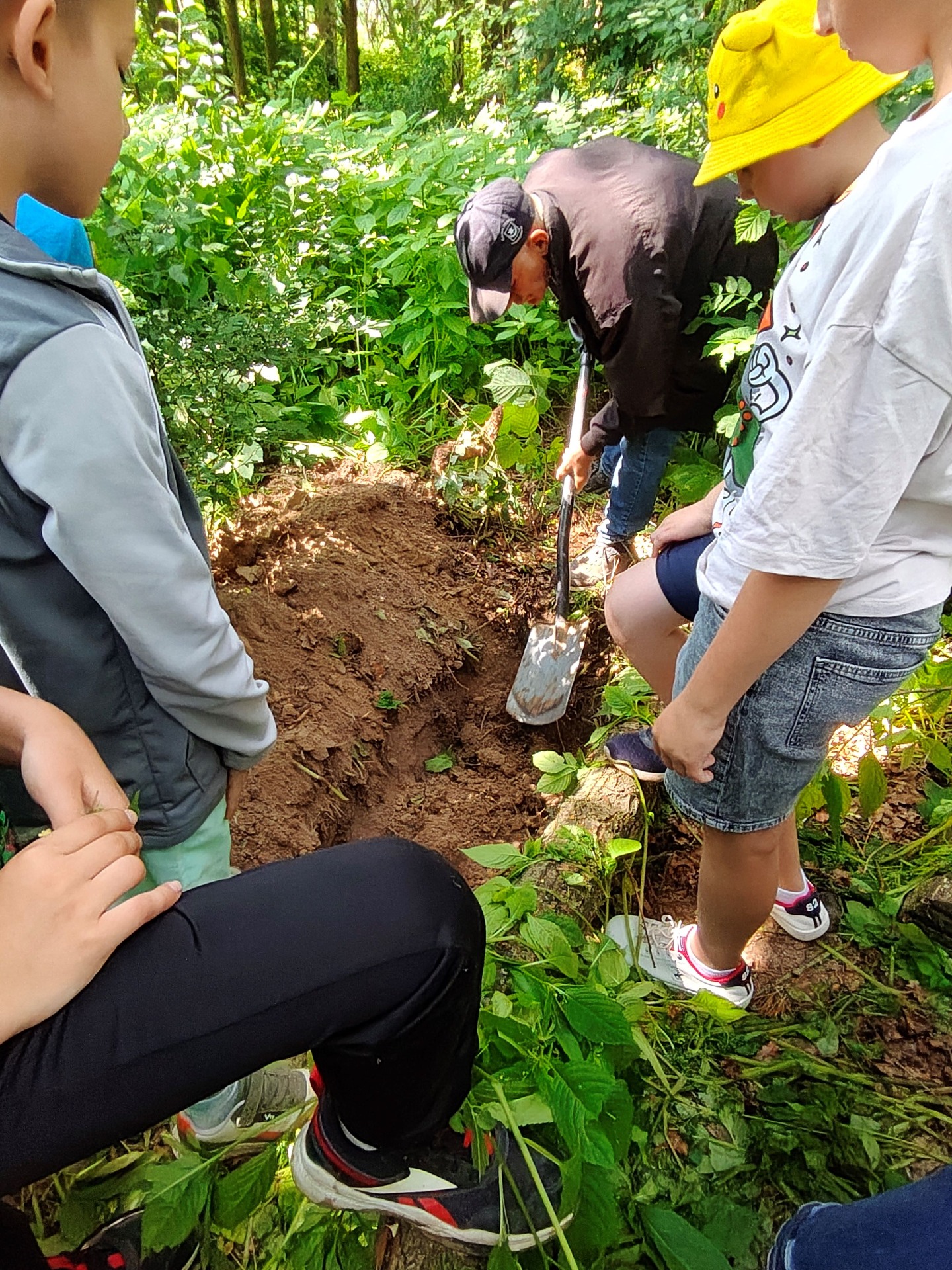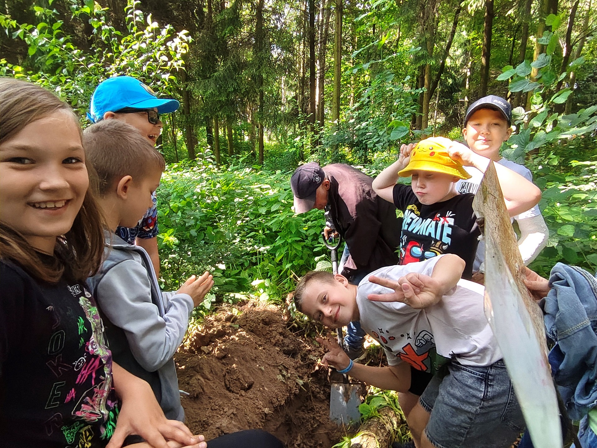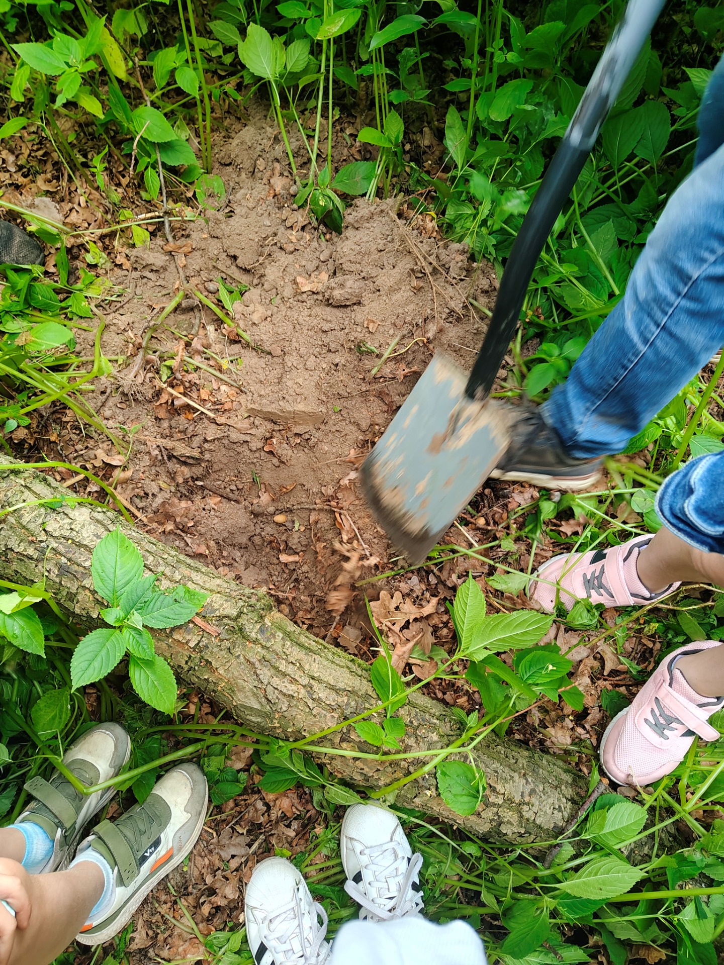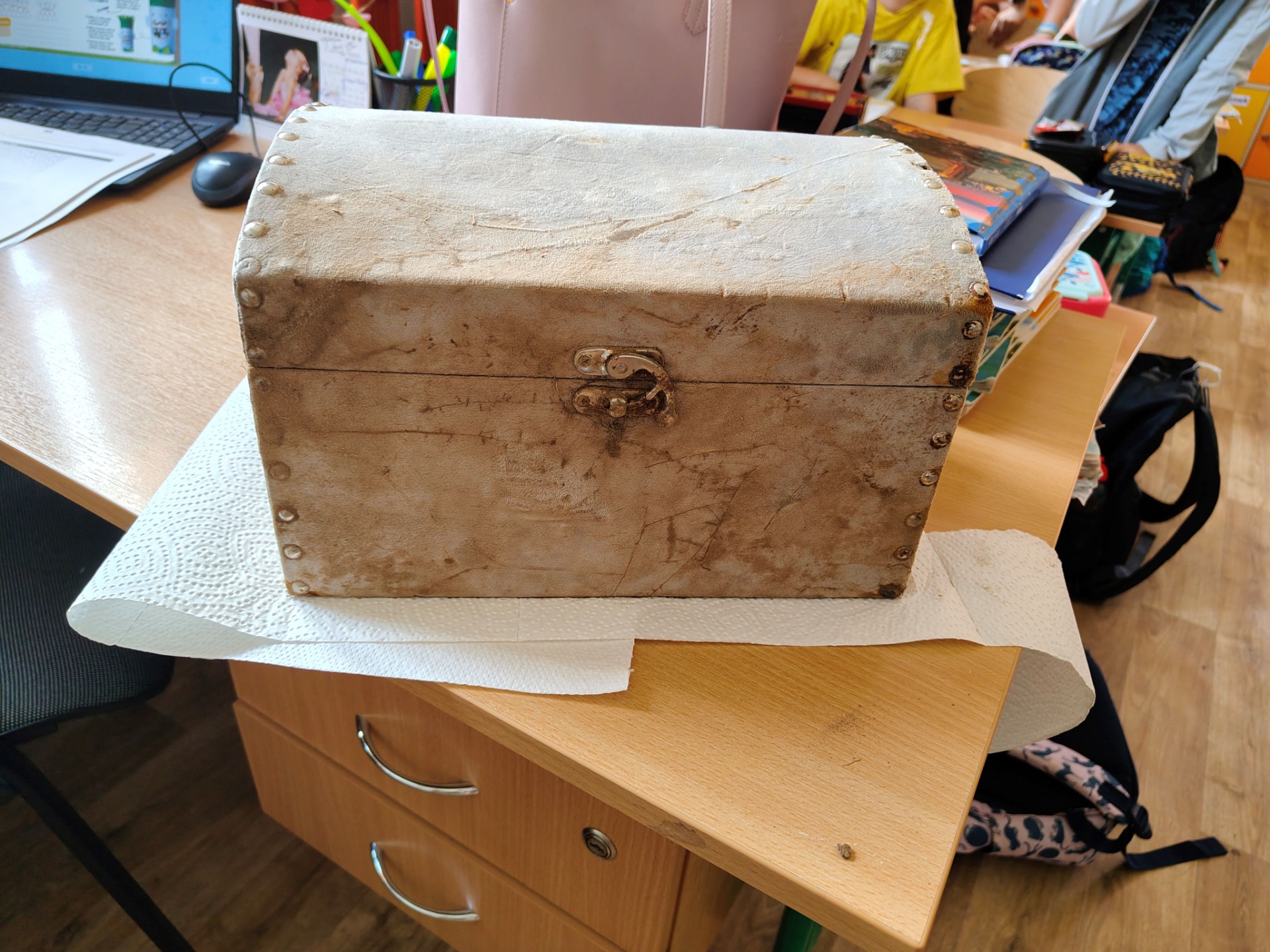 Przyszedł czas na wykopanie Skrzyni Skarbów... Jesienią, w pierwszej klasie, uczniowie zakopali skrzynię, w której umieścili cenne rzeczy: maskotki, zabawki, zdjęcia oraz rysunki.