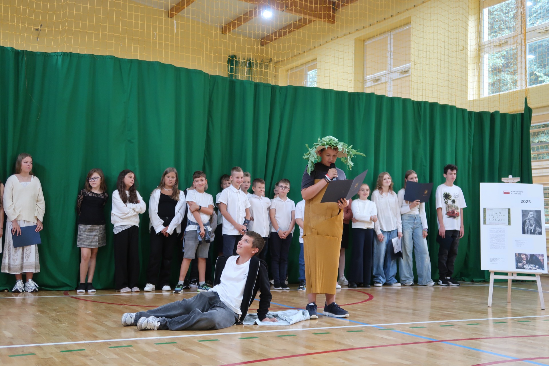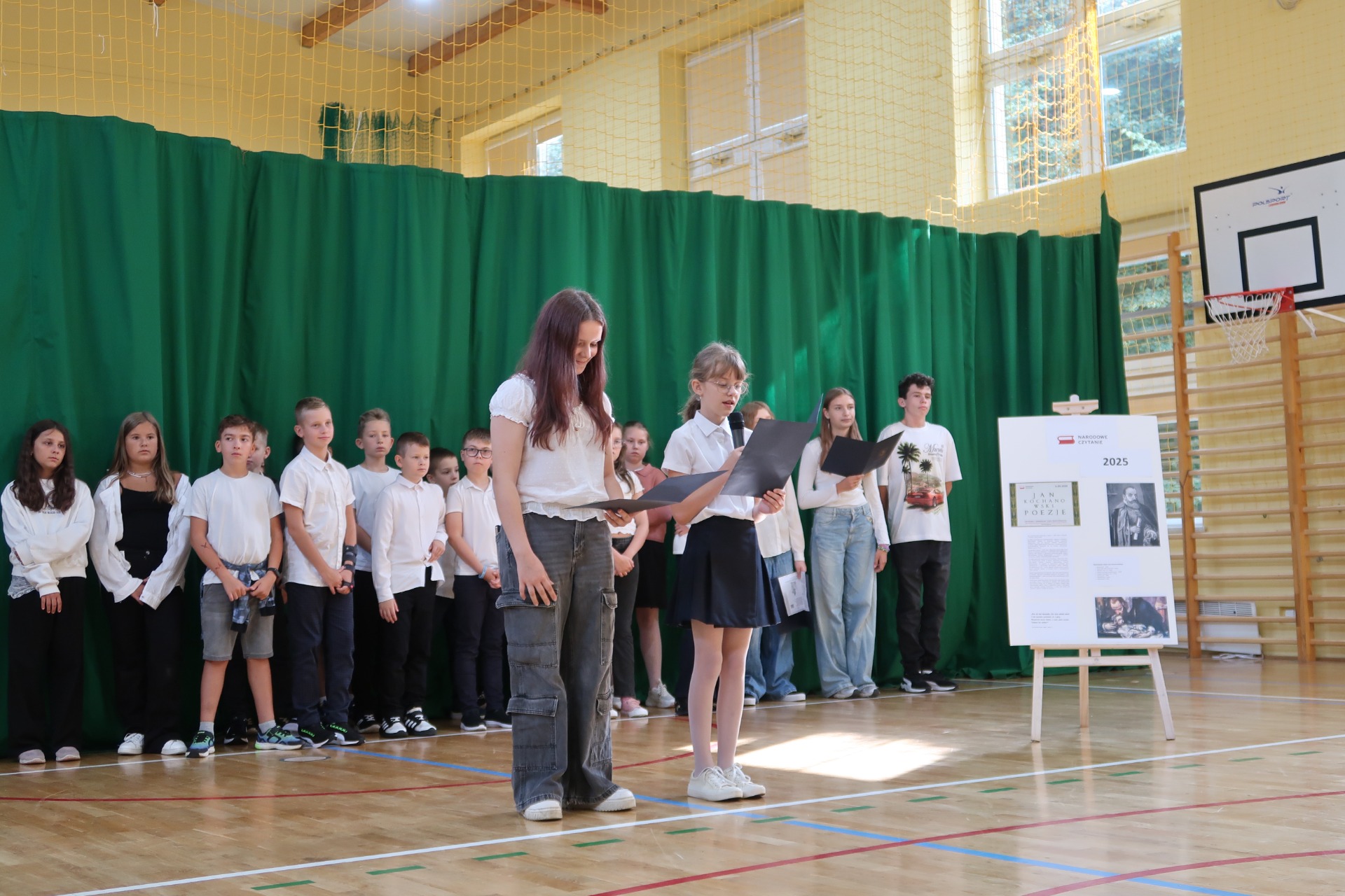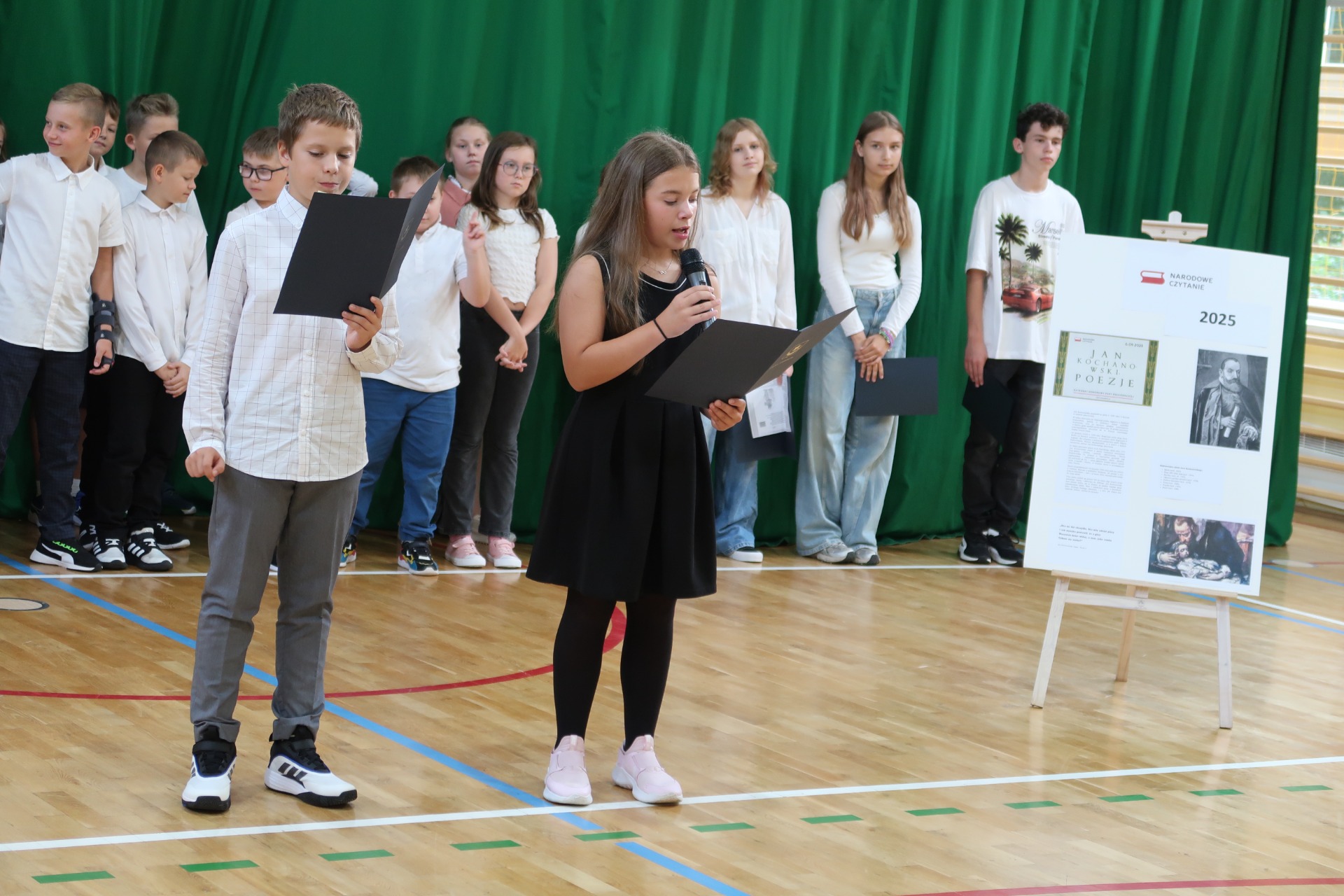 W pierwszej części wydarzenia uczniowie klasy V przedstawili sylwetkę Mistrza z Czarnolasu, przybliżając najważniejsze fakty z jego życia oraz wskazując najbardziej znane tytuły dzieł. Następnie nasi szkolni artyści z klas IV b, V, VI i VIII przeczytali wybrane fraszki, pieśni i treny z bogatej spuścizny literackiej Kochanowskiego.