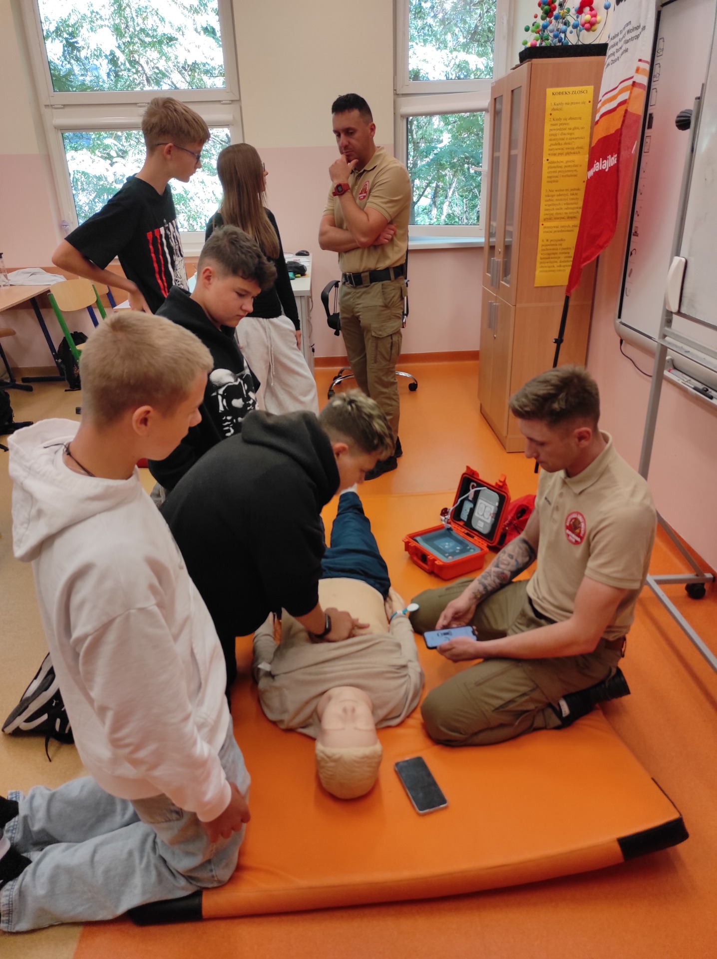 Następnie strażacy omówili zasady udzielania pierwszej pomocy, zaś uczniowie otrzymywali zadania m.in. musieli poprawnie poinformować telefonicznie dyspozytora o niebezpiecznym zdarzeniu oraz samodzielnie przeprowadzić resuscytację na manekinie.