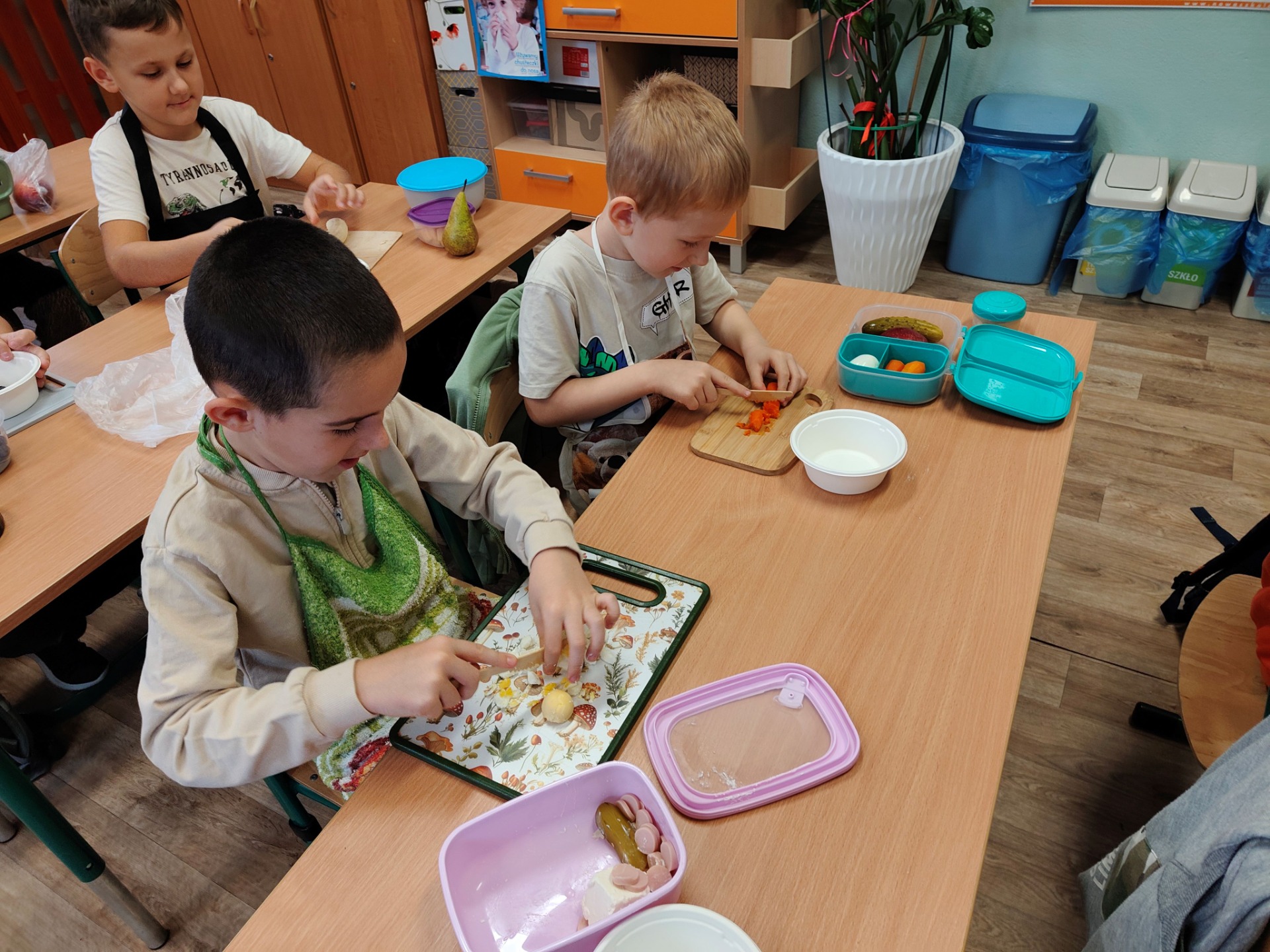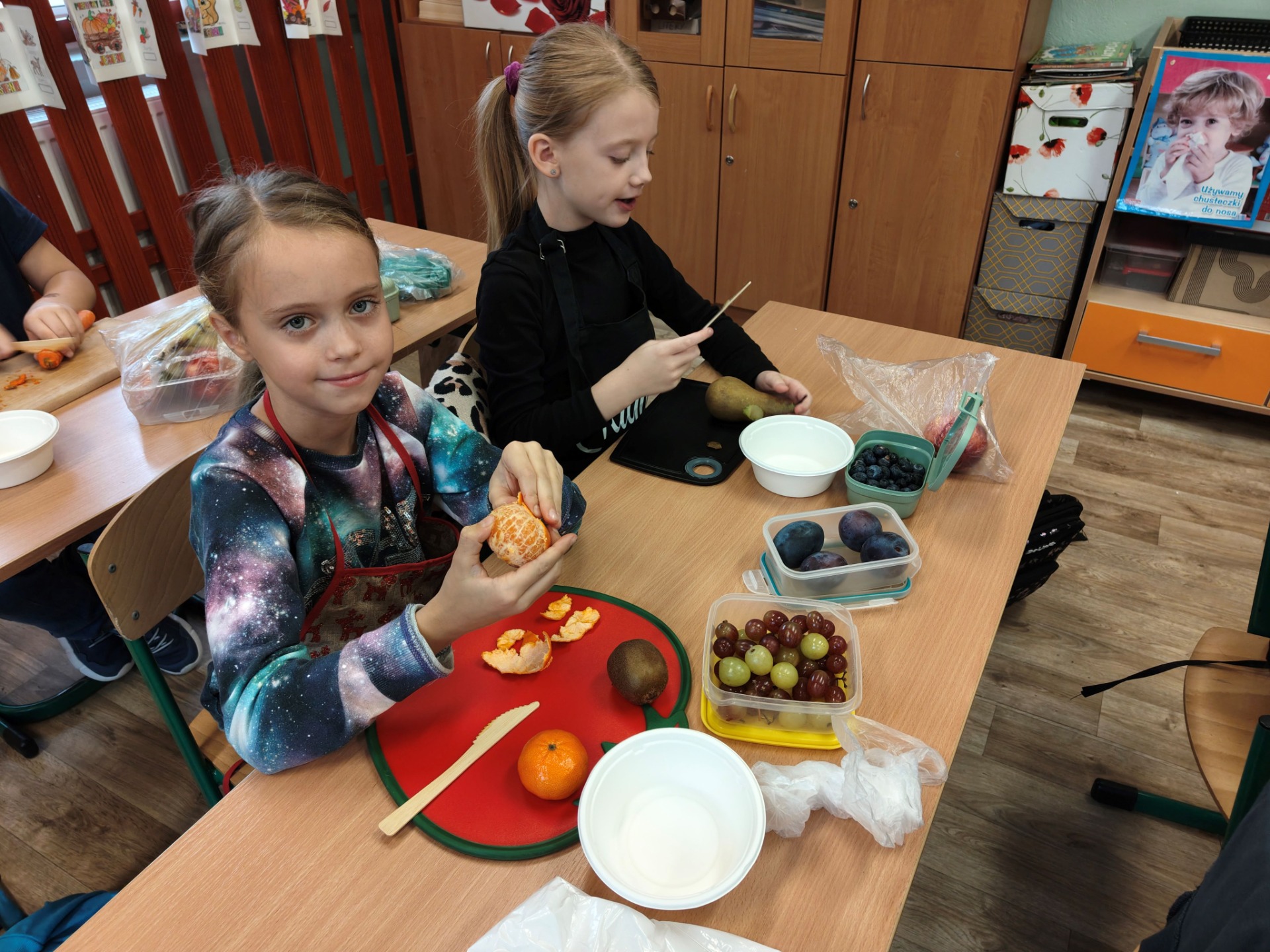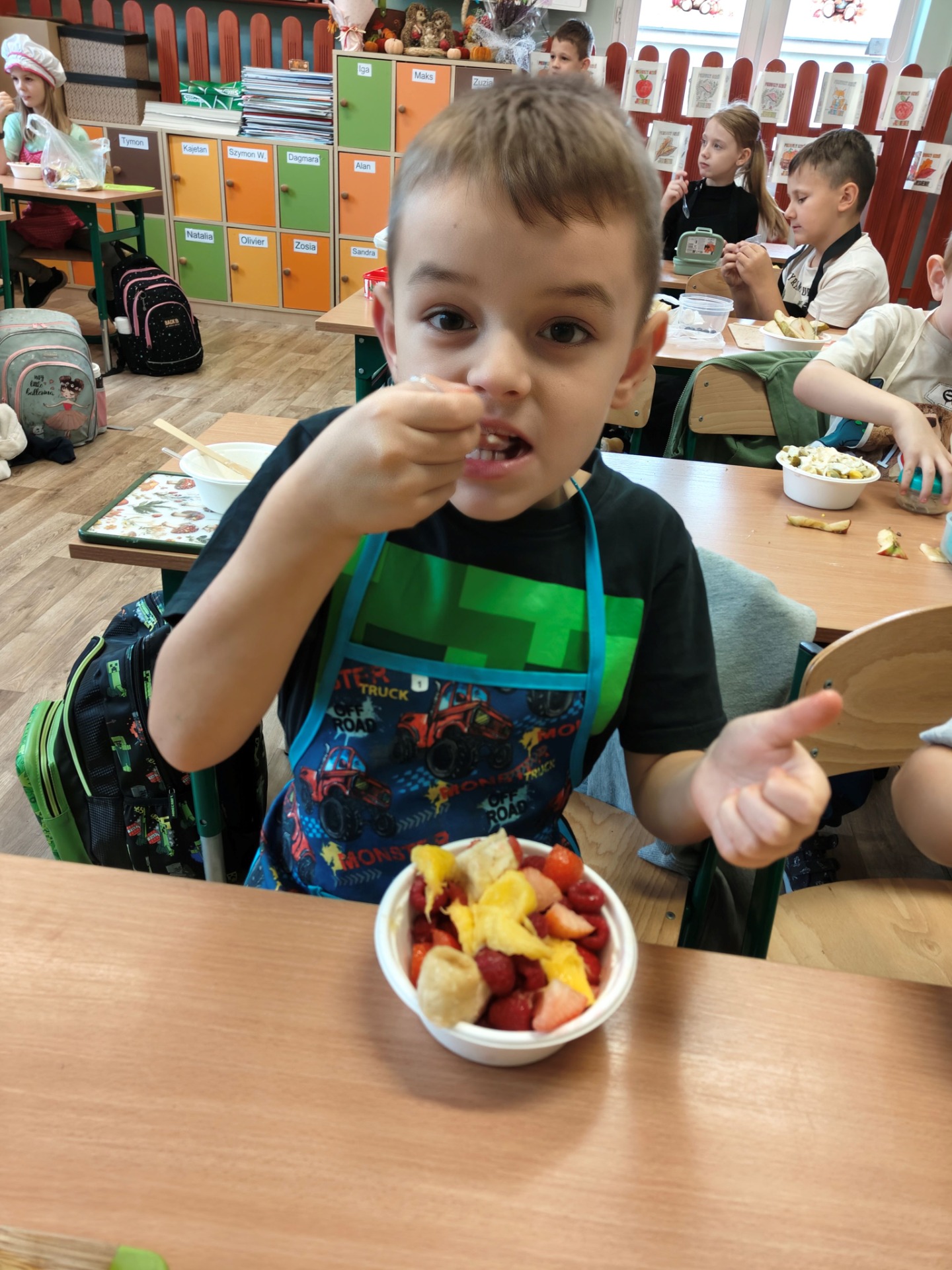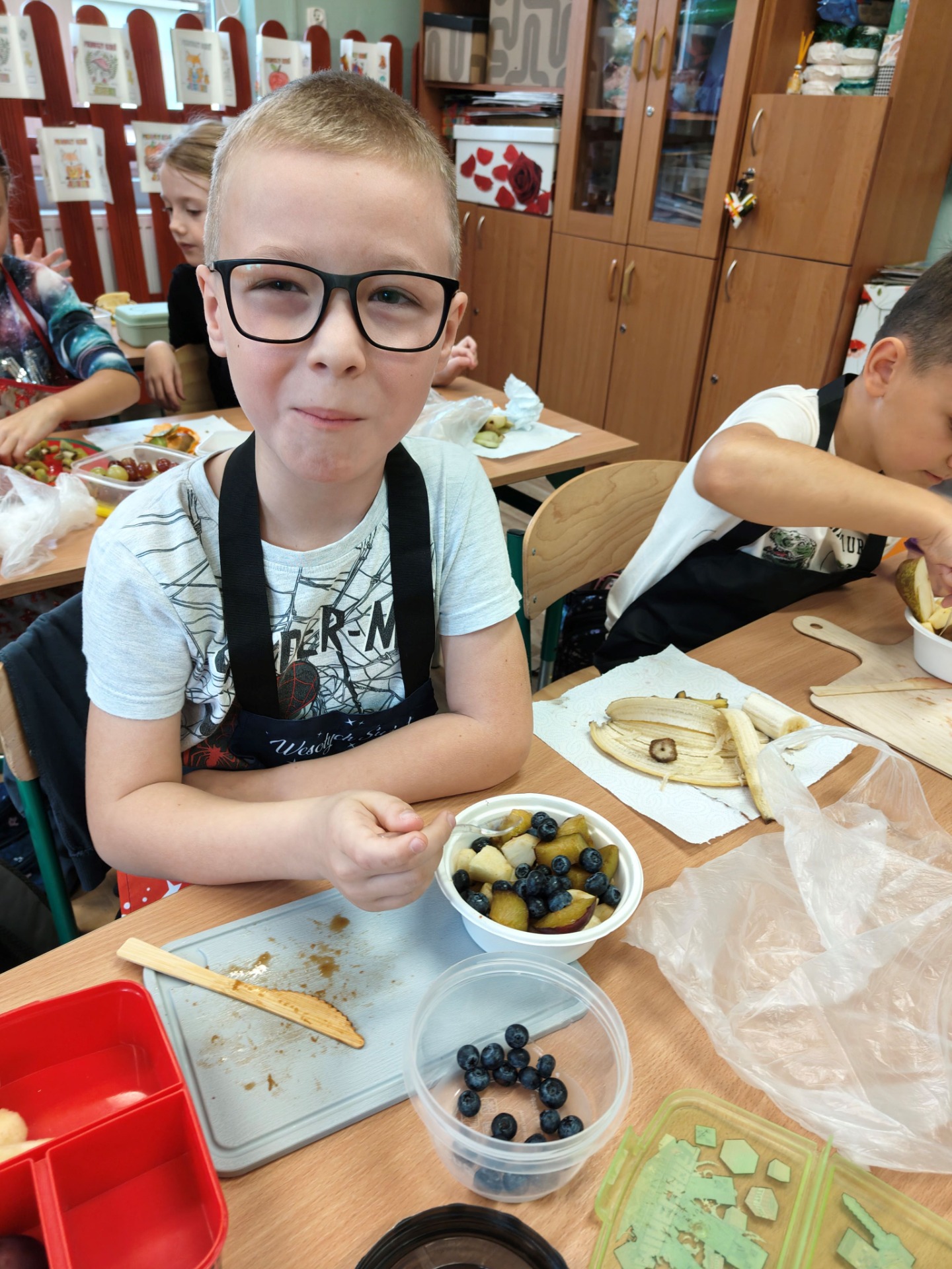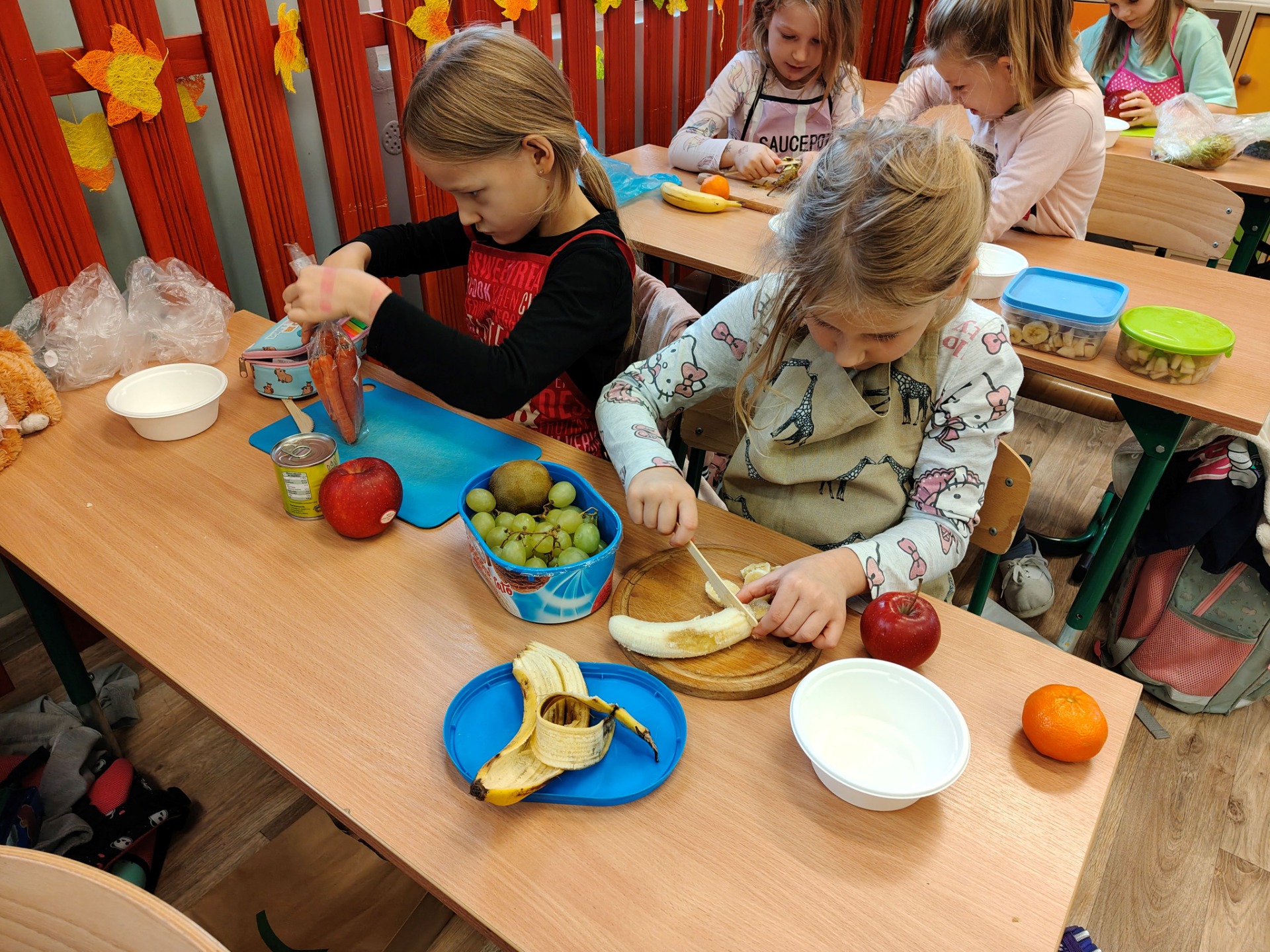 Uczniowie klasy 1b uczyli się o zdrowym odżywianiu i o darach jesieni. Przynieśli do szkoły różne owoce i warzywa, które umyli, a następnie z zapałem zabrali się do wykonania sałatki owocowej i warzywnej. Wspólna praca sprawiła dzieciom dużo radości i satysfakcji z samodzielnie wykonanego, pożywnego i kolorowego posiłku. W czasie zajęć pierwszoklasiści uświadomili sobie, że to co zdrowe, może być również pyszne - zwłaszcza gdy zostało wykonane własnoręcznie.