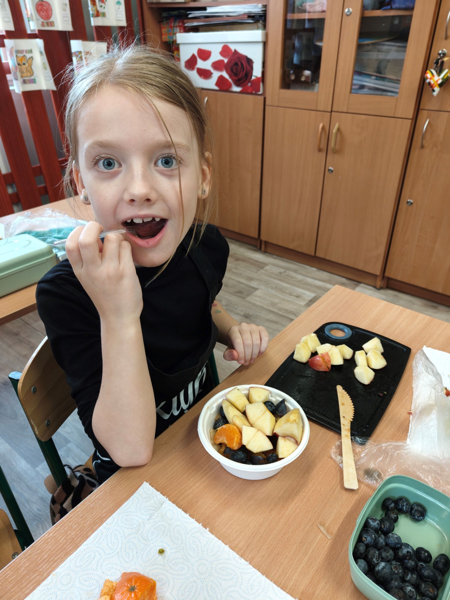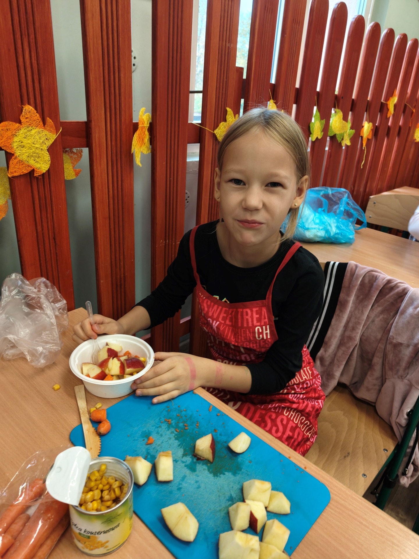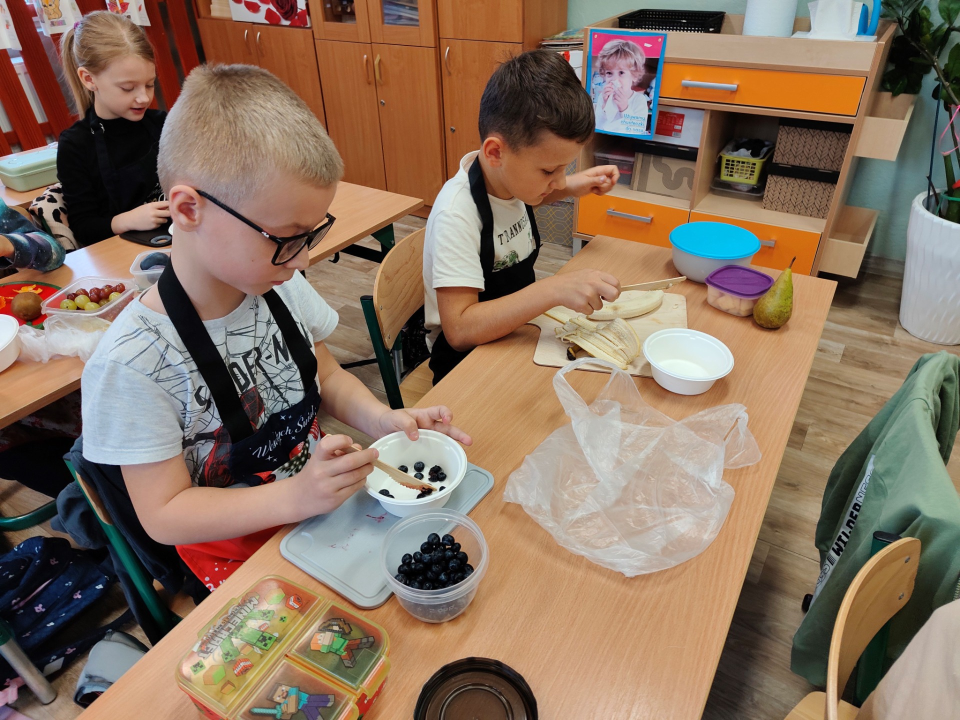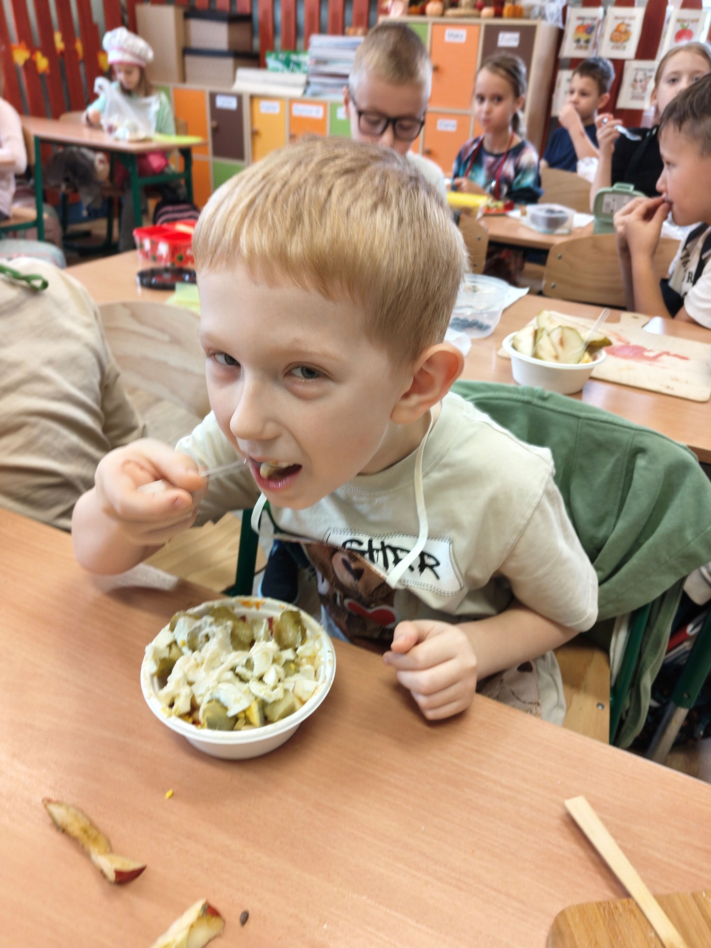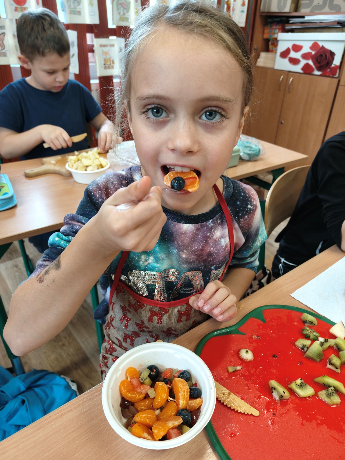 Uczniowie klasy 1b uczyli się o zdrowym odżywianiu i o darach jesieni. Przynieśli do szkoły różne owoce i warzywa, które umyli, a następnie z zapałem zabrali się do wykonania sałatki owocowej i warzywnej. Wspólna praca sprawiła dzieciom dużo radości i satysfakcji z samodzielnie wykonanego, pożywnego i kolorowego posiłku. W czasie zajęć pierwszoklasiści uświadomili sobie, że to co zdrowe, może być również pyszne - zwłaszcza gdy zostało wykonane własnoręcznie.