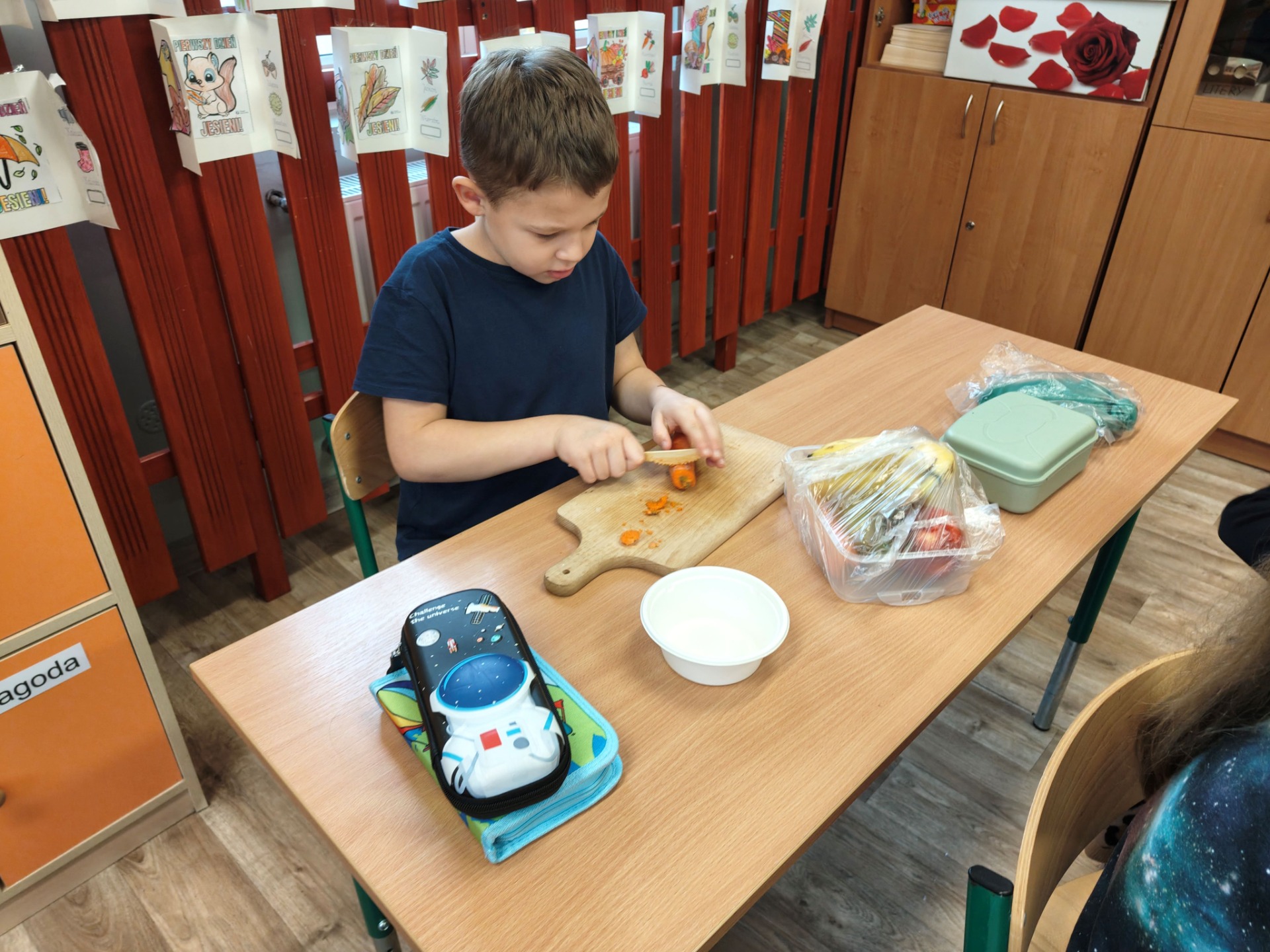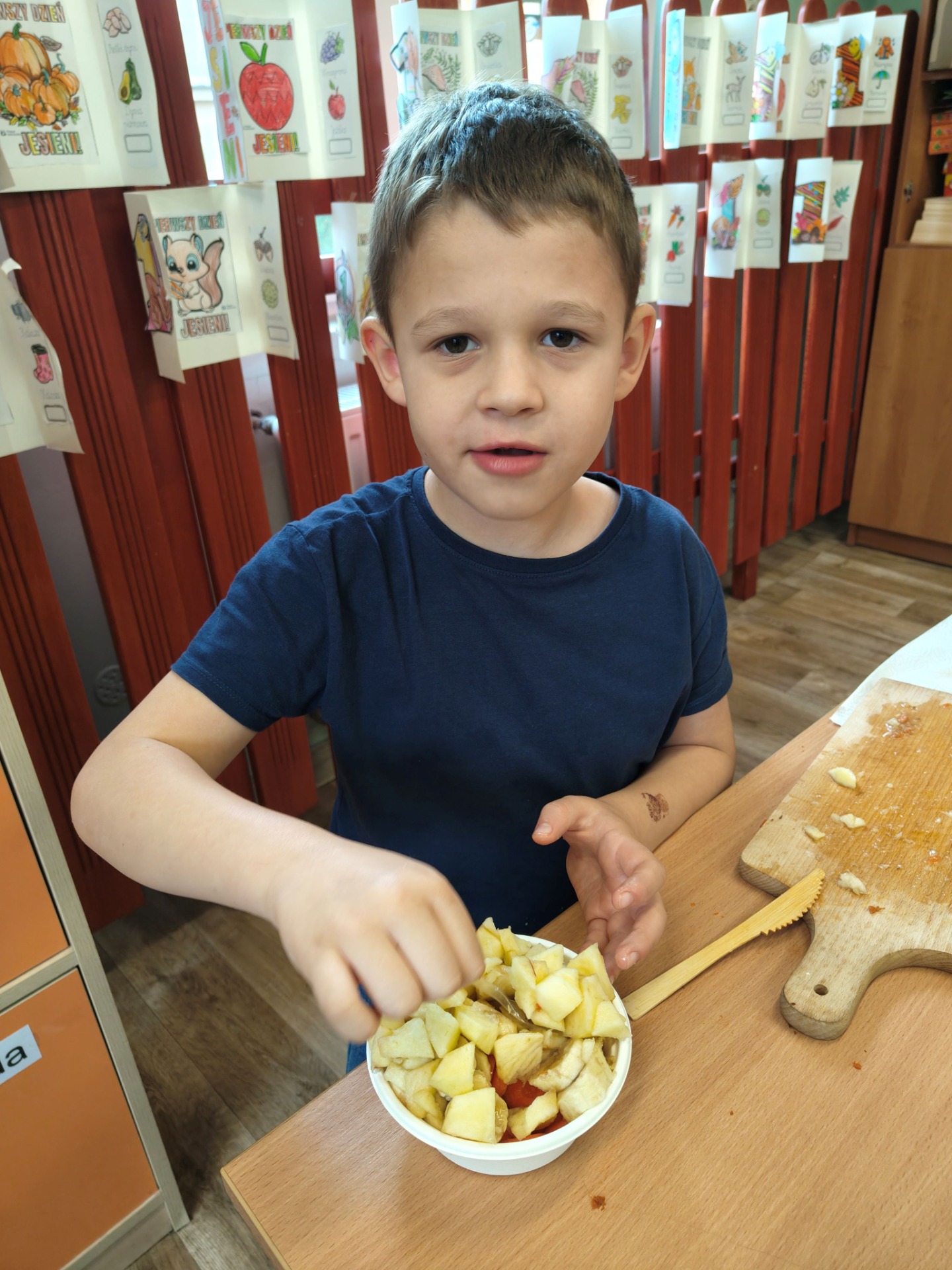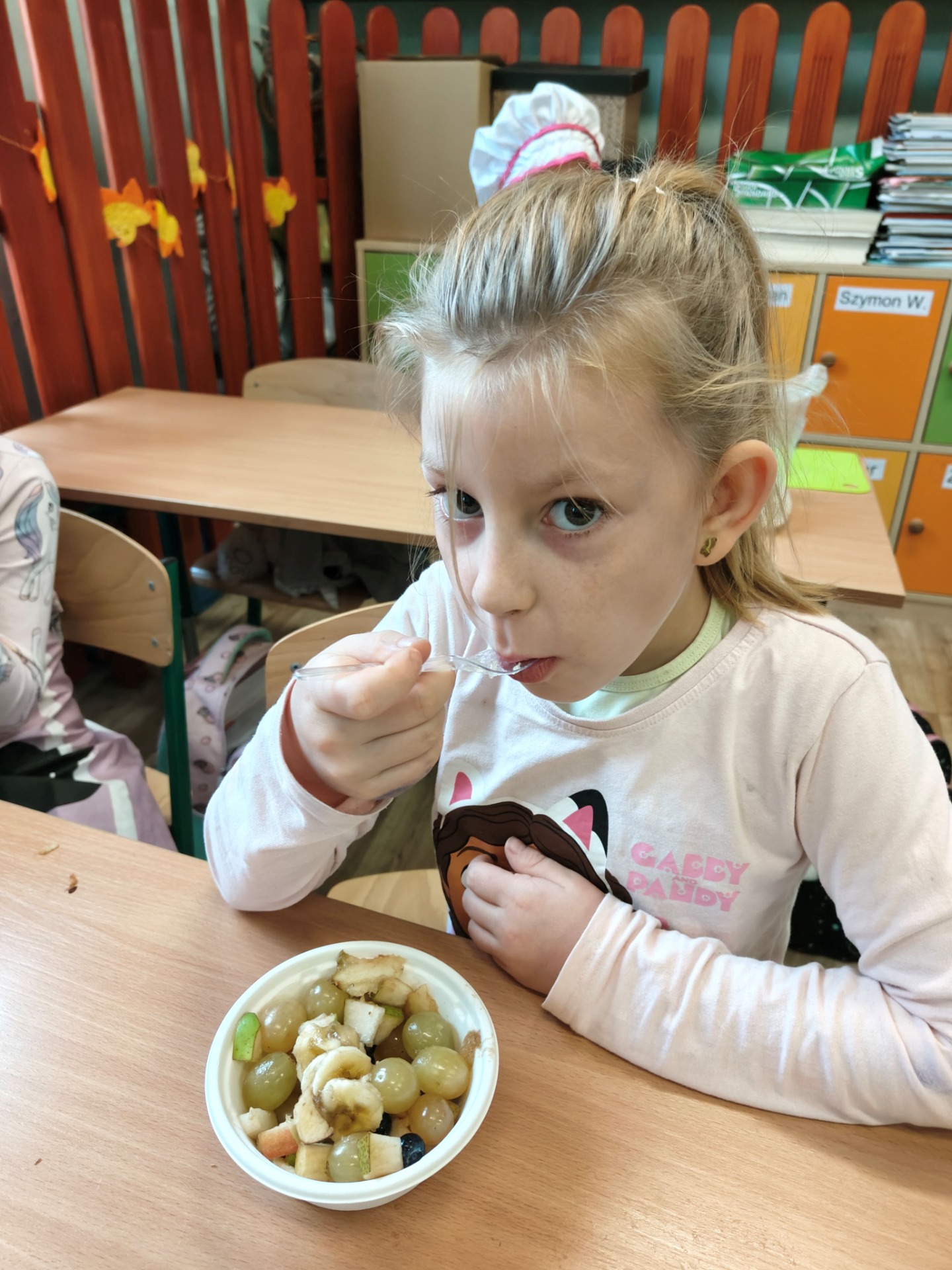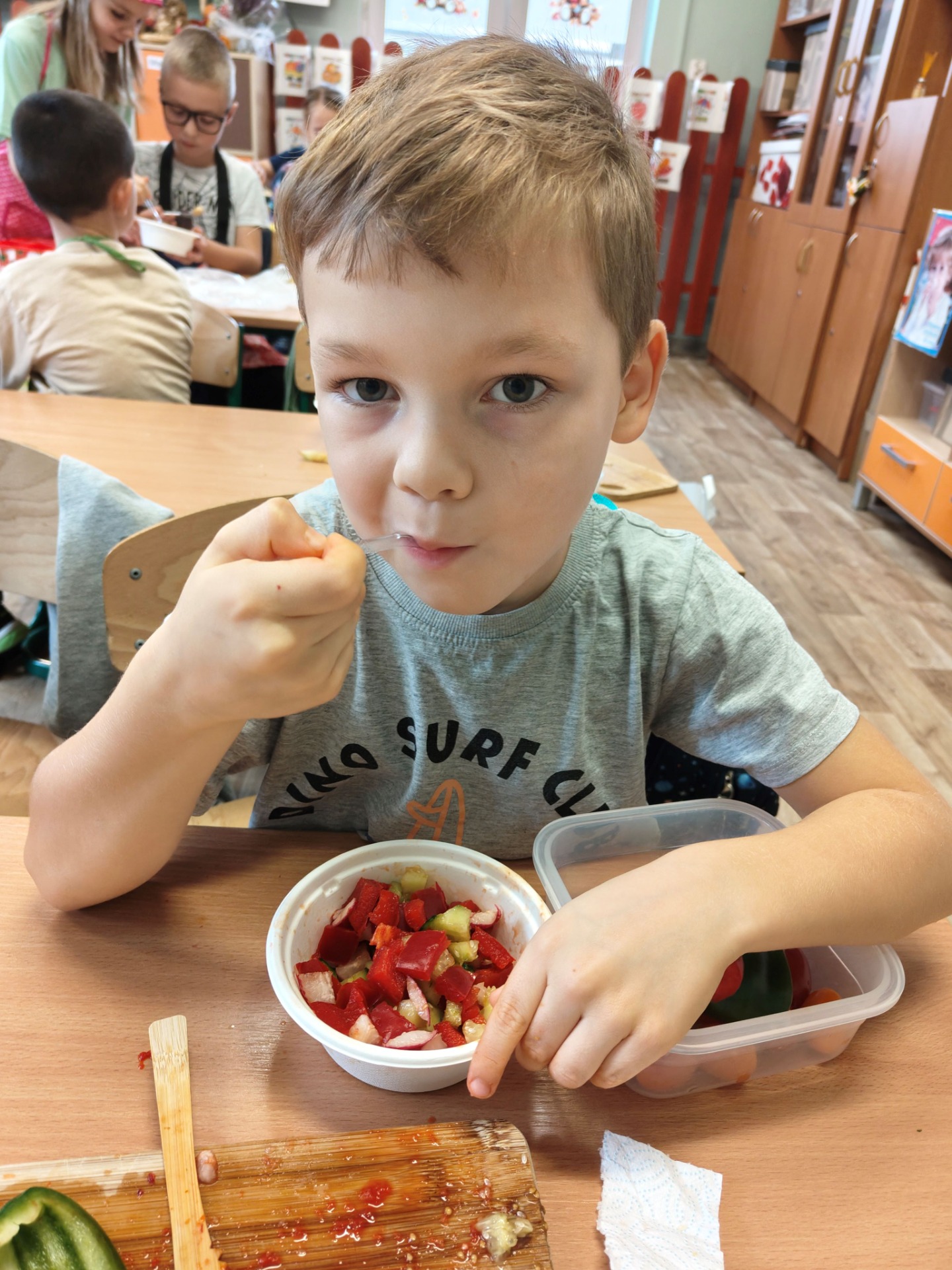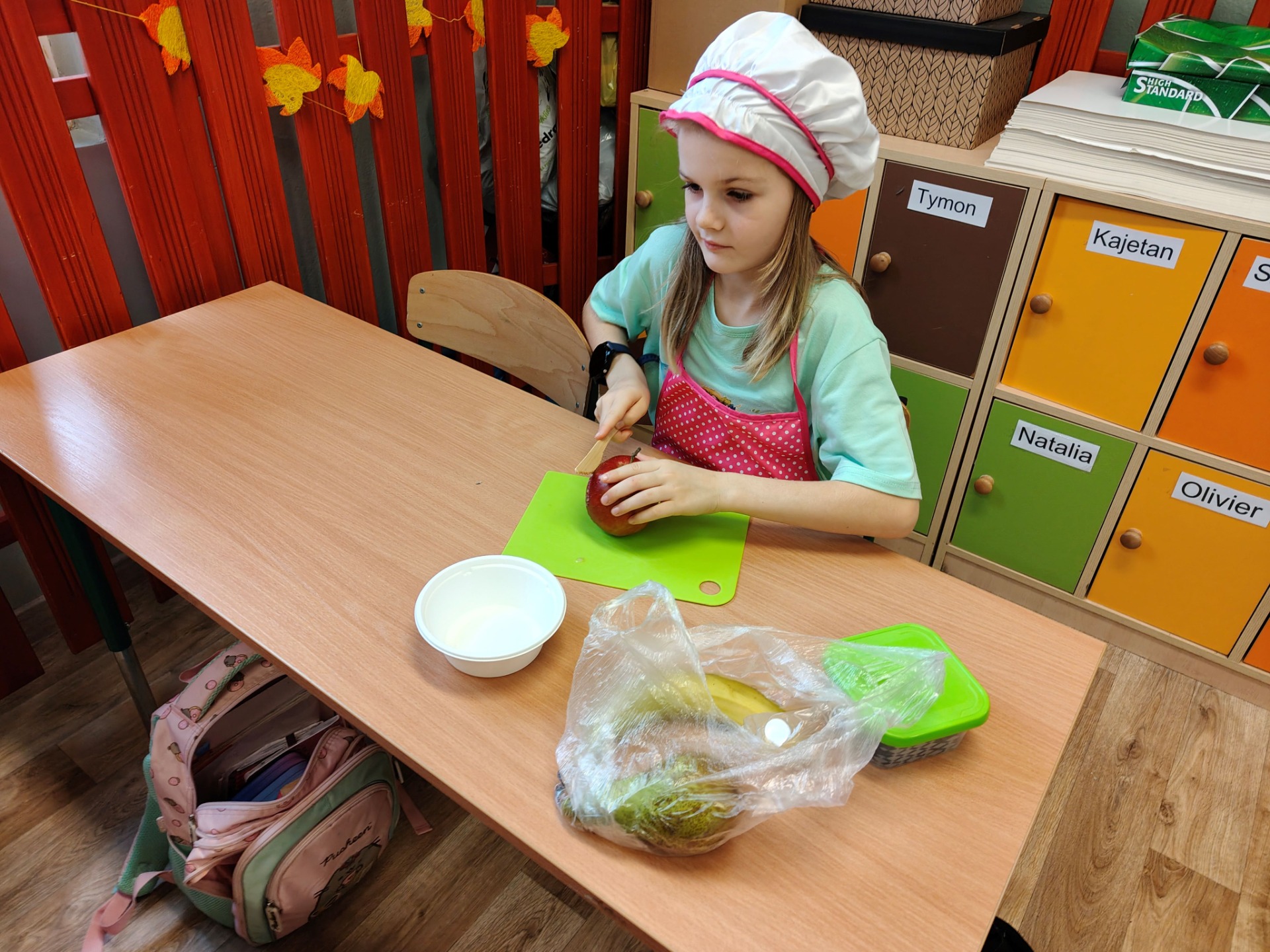 Uczniowie klasy 1b uczyli się o zdrowym odżywianiu i o darach jesieni. Przynieśli do szkoły różne owoce i warzywa, które umyli, a następnie z zapałem zabrali się do wykonania sałatki owocowej i warzywnej. Wspólna praca sprawiła dzieciom dużo radości i satysfakcji z samodzielnie wykonanego, pożywnego i kolorowego posiłku. W czasie zajęć pierwszoklasiści uświadomili sobie, że to co zdrowe, może być również pyszne - zwłaszcza gdy zostało wykonane własnoręcznie.