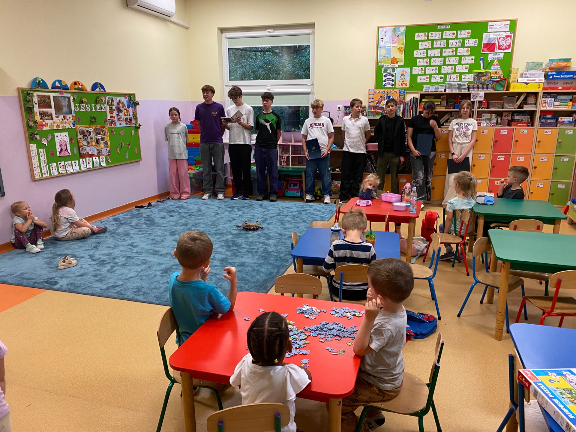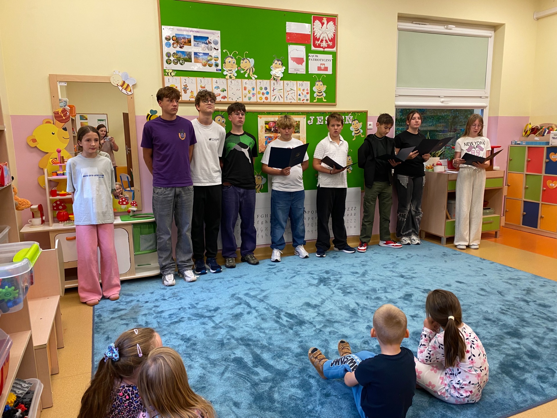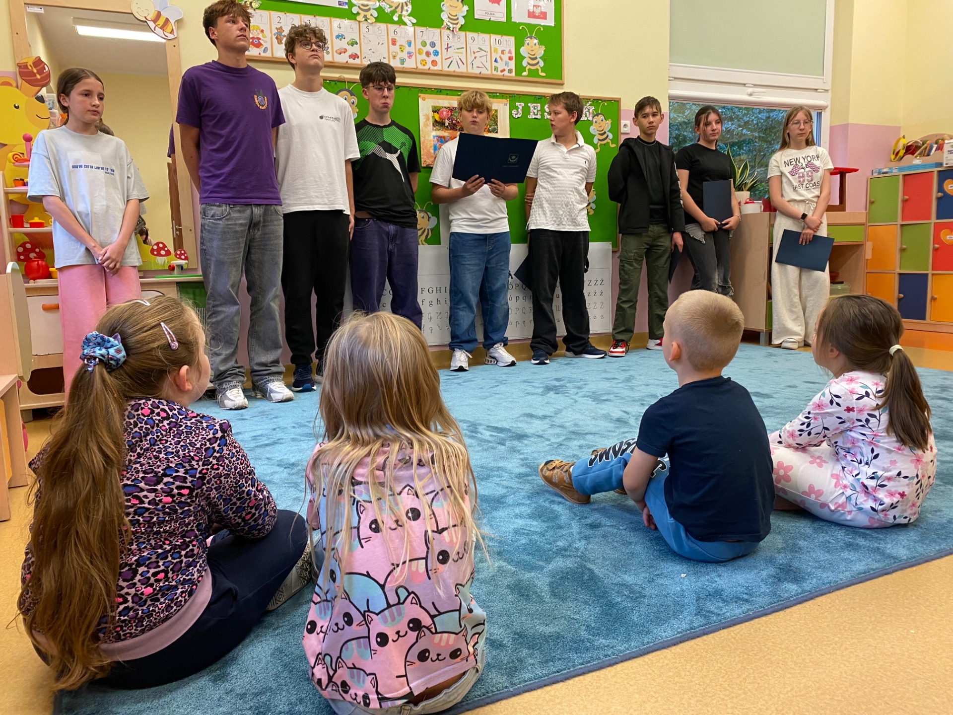 Z tej okazji członkowie Samorządu Uczniowskiego udali się do oddziałów przedszkolnych, by zaprezentować najmłodszym kolegom i koleżankom znane oraz lubiane utwory literackie.