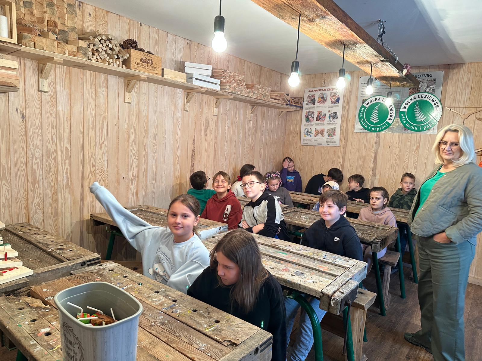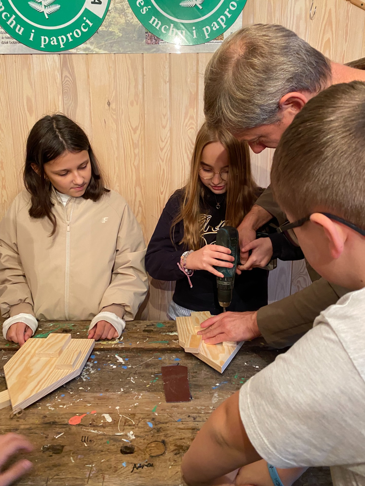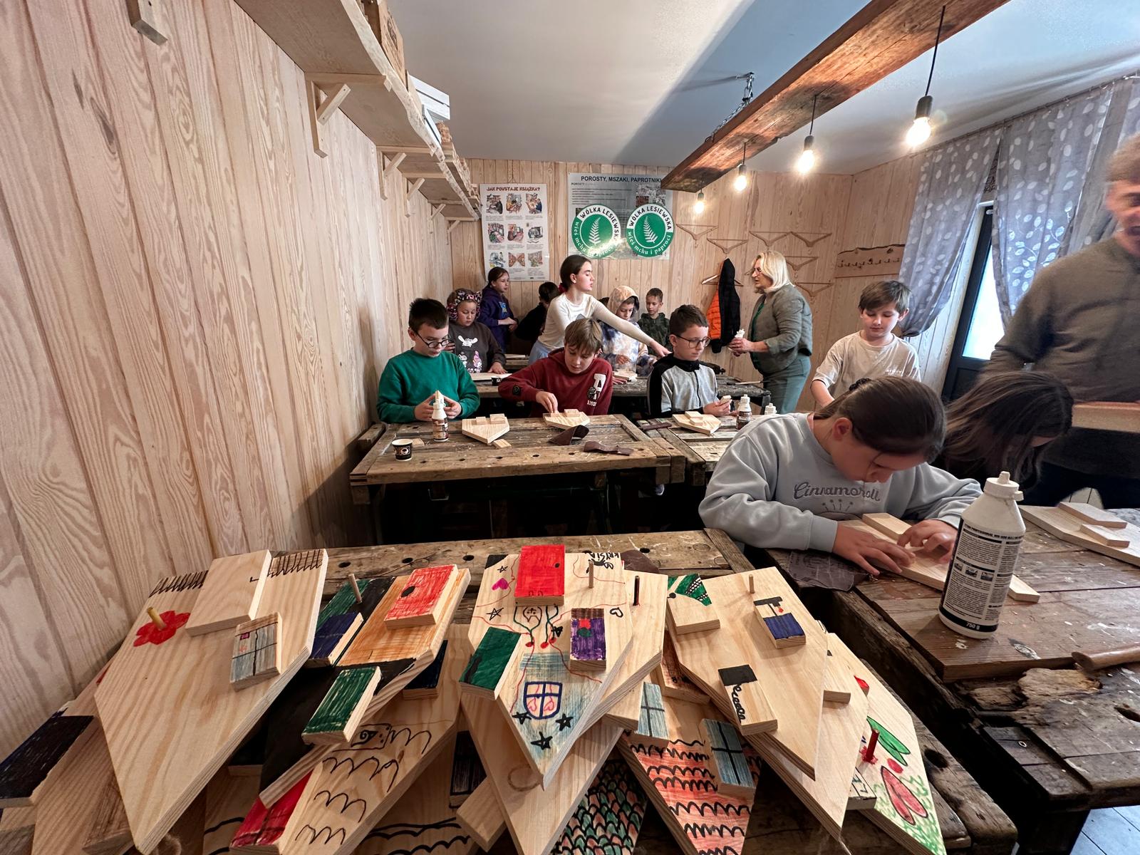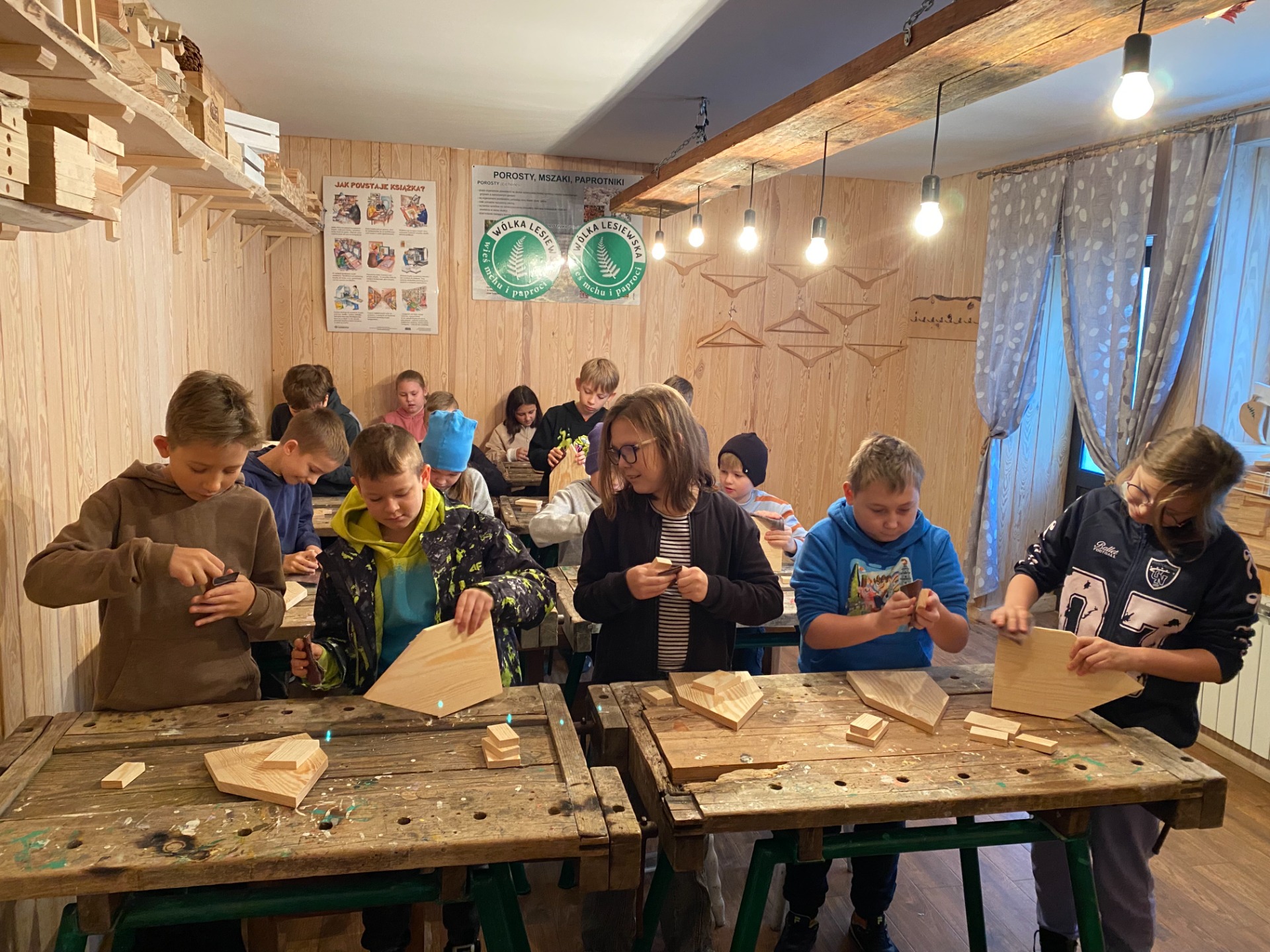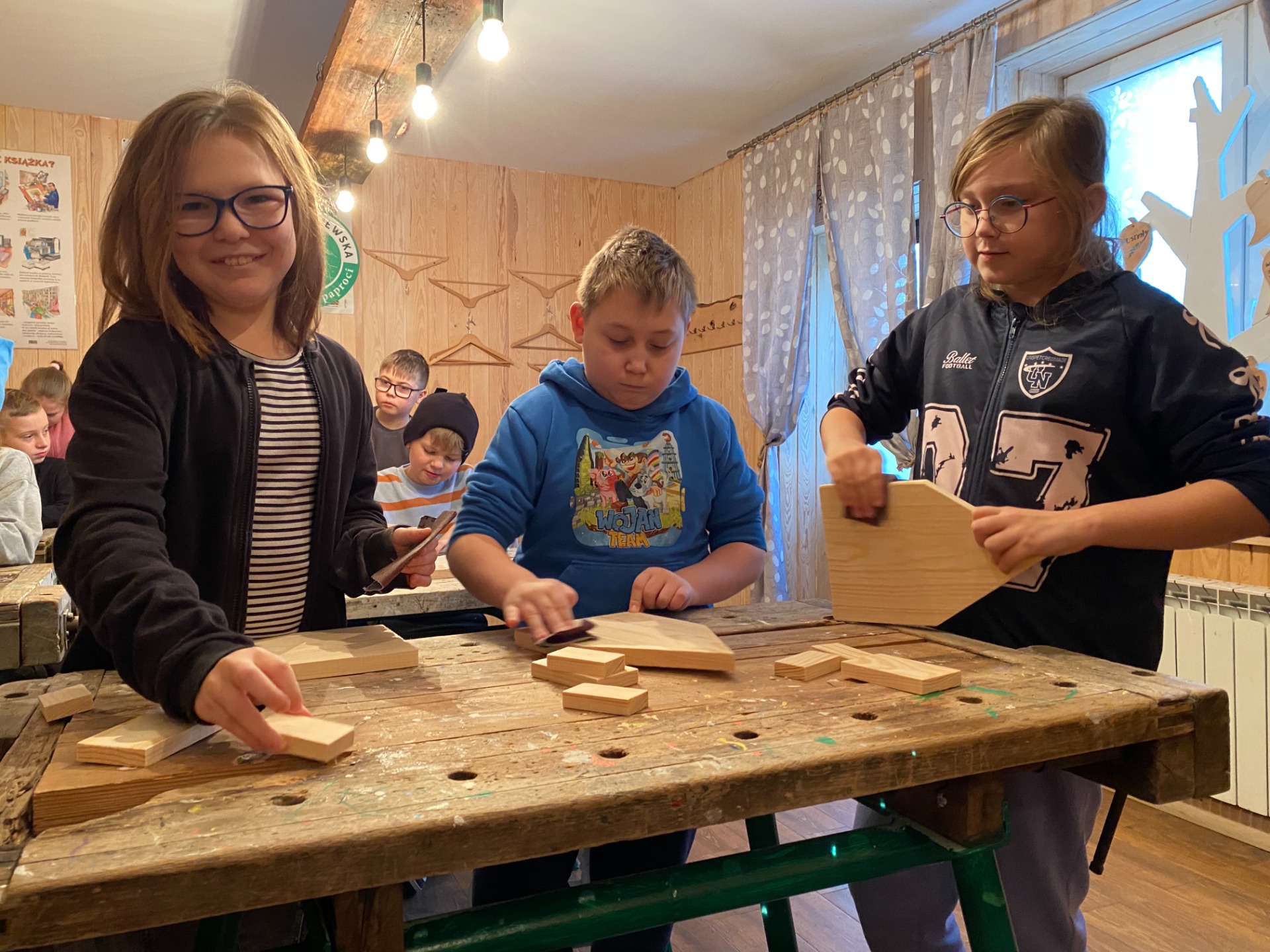 Czwartoklasiści wzięli udział w warsztatach stolarskich, podczas których własnoręcznie wykonali, a następnie ozdobili drewniane domki. W trakcie pracy poznali specyfikę zawodu stolarza i mieli okazję posługiwać się narzędziami używanymi na co dzień w pracowni stolarskiej.