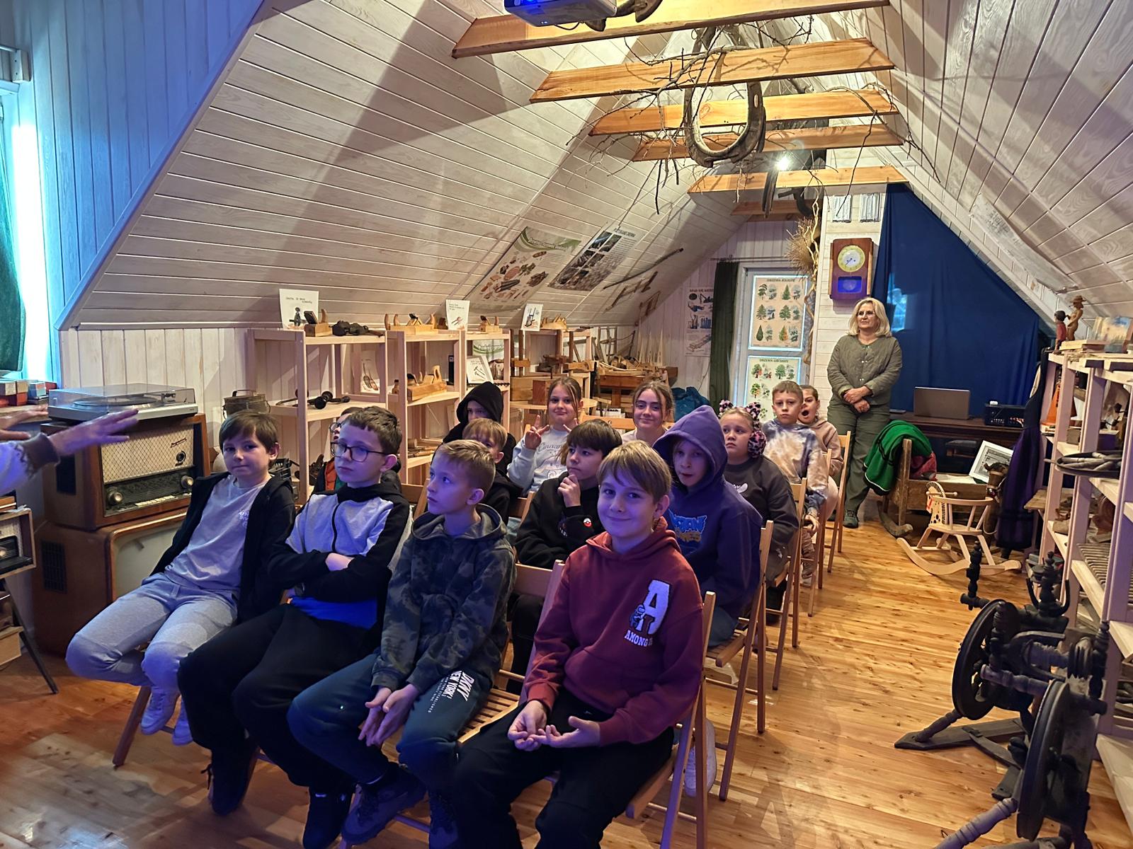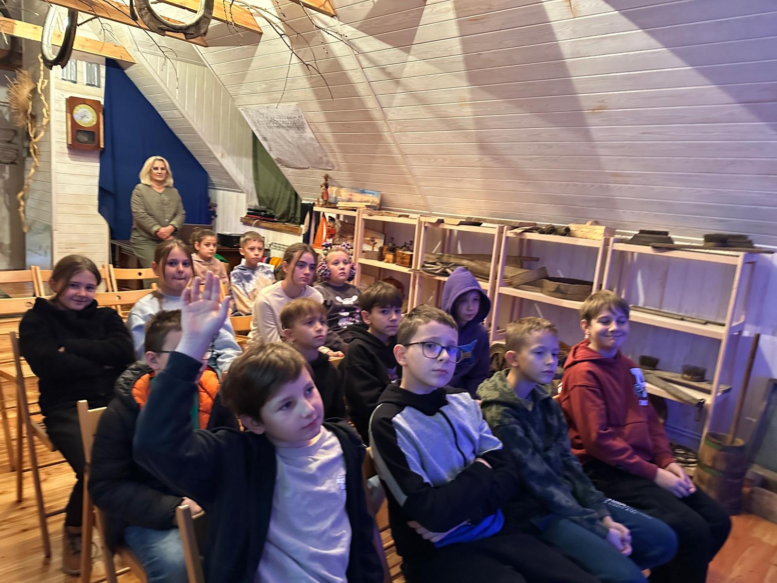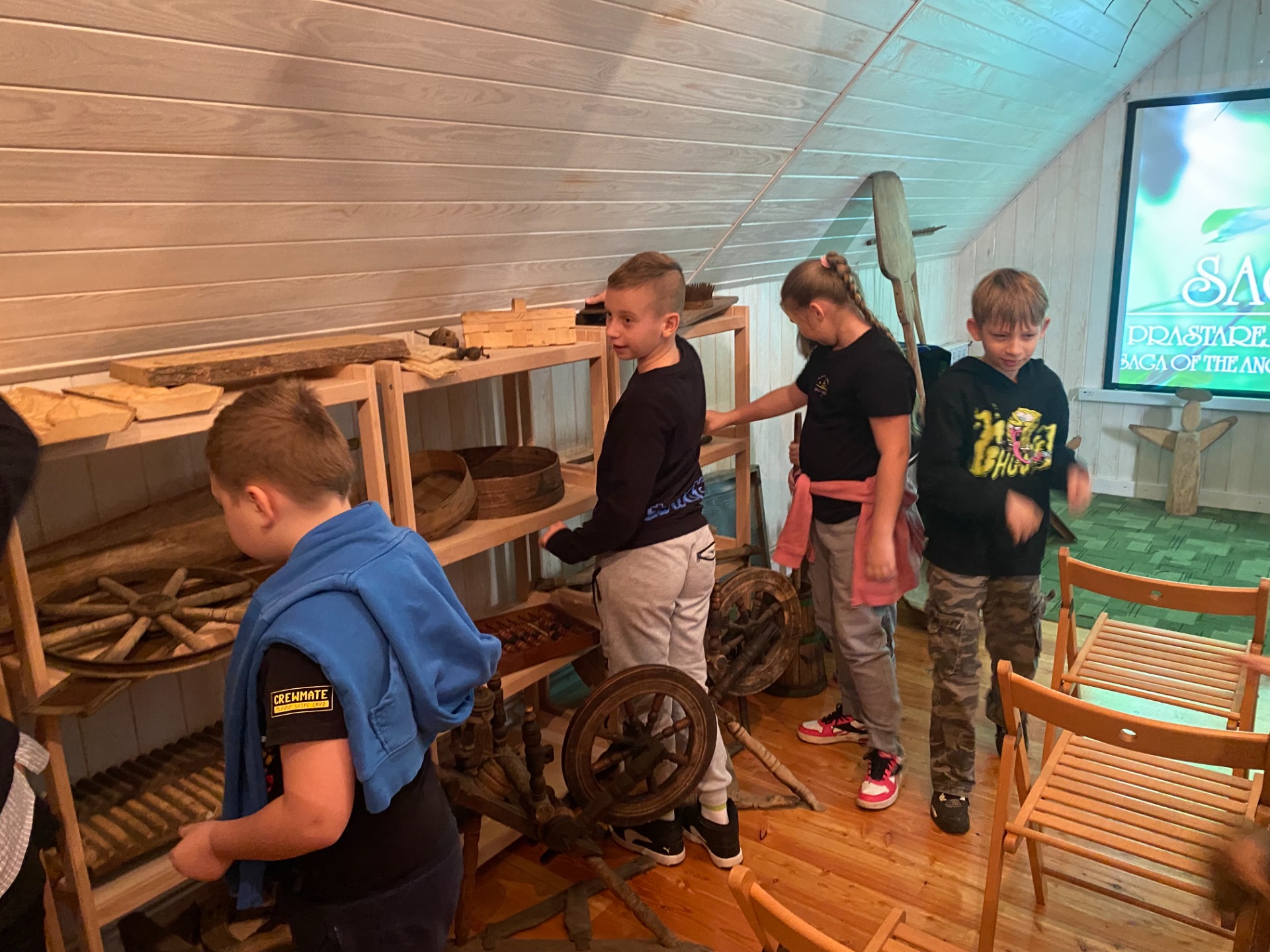 Następnie młodzi konstruktorzy obejrzeli ekspozycję muzealną znajdującą się w Wiosce Mchu i Paproci. Drewniane eksponaty – przedmioty codziennego użytku wykorzystywane niegdyś w gospodarstwach domowych – zostały bezbłędnie rozpoznane przez naszych dociekliwych uczniów. Czwartoklasiści obejrzeli również film przyrodniczy o krukach, który przybliżył im wiele ciekawostek z życia tych inteligentnych ptaków.