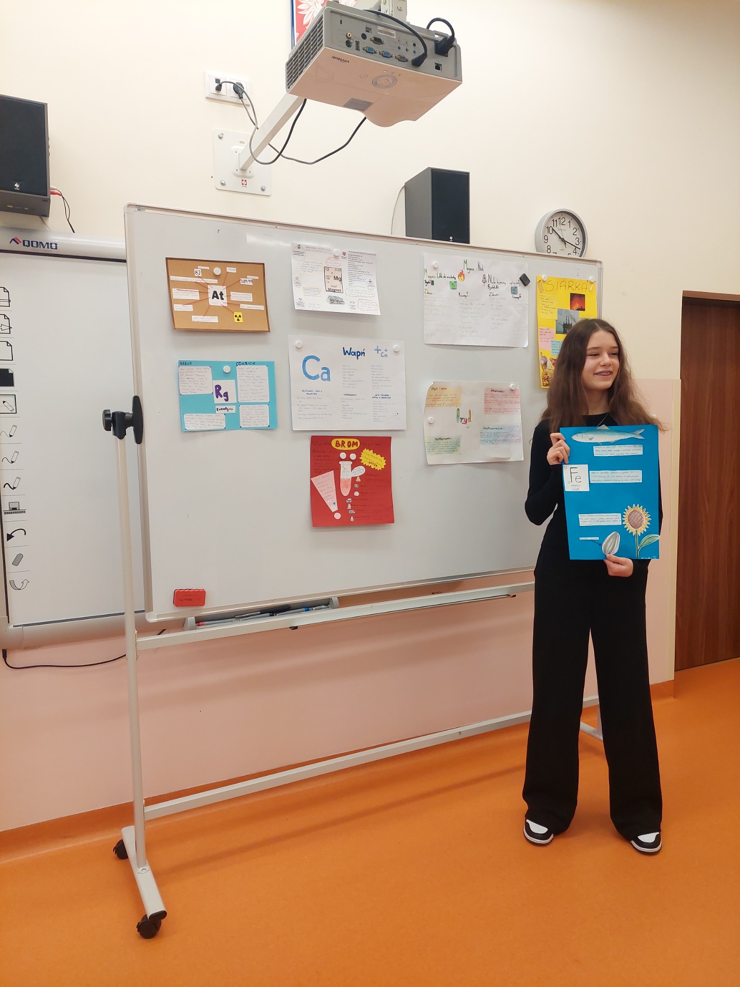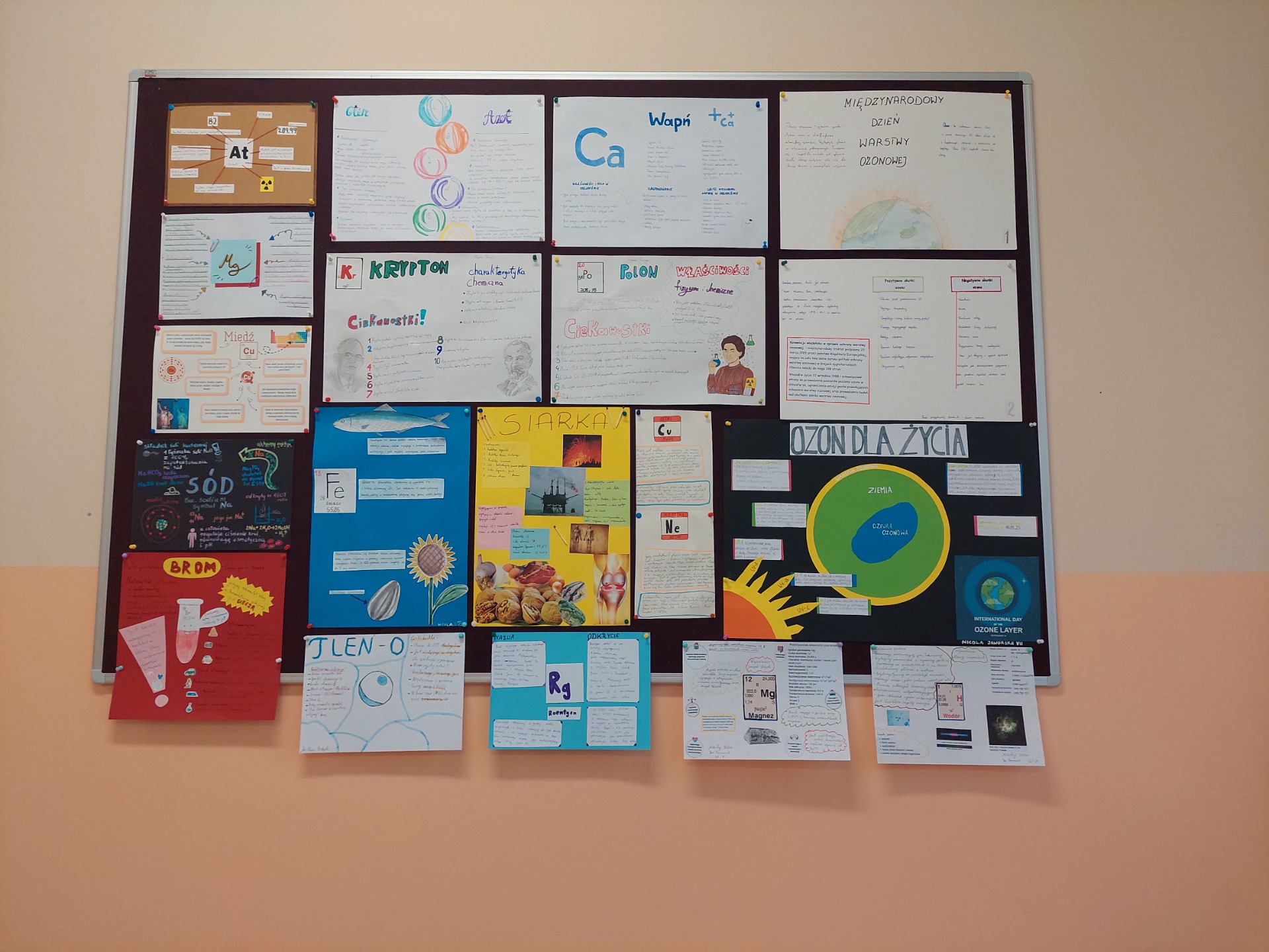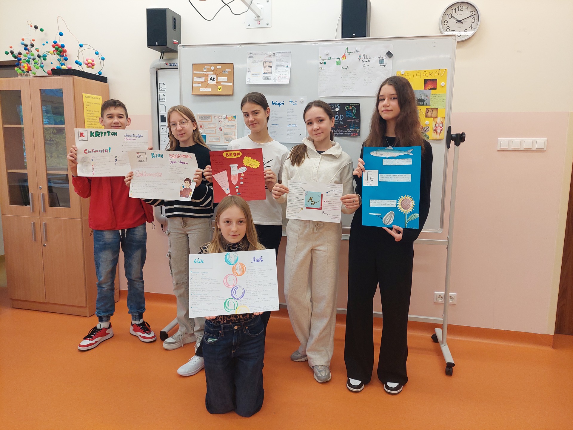 „Pierwiastki w nas i wokół nas" - pod takim hasłem uczniowie klasy VII realizowali projekt z chemii. Jego głównym celem było wzbogacenie wiedzy na temat pierwiastków chemicznych, zrozumienia ich roli w organizmach żywych i środowisku, a także wzmacnianie umiejętności planowania własnej pracy, współpracy w grupie oraz zbierania i analizy informacji. Uczniowie wykonywali plakaty, które zostały zaprezentowane na wystawie.
