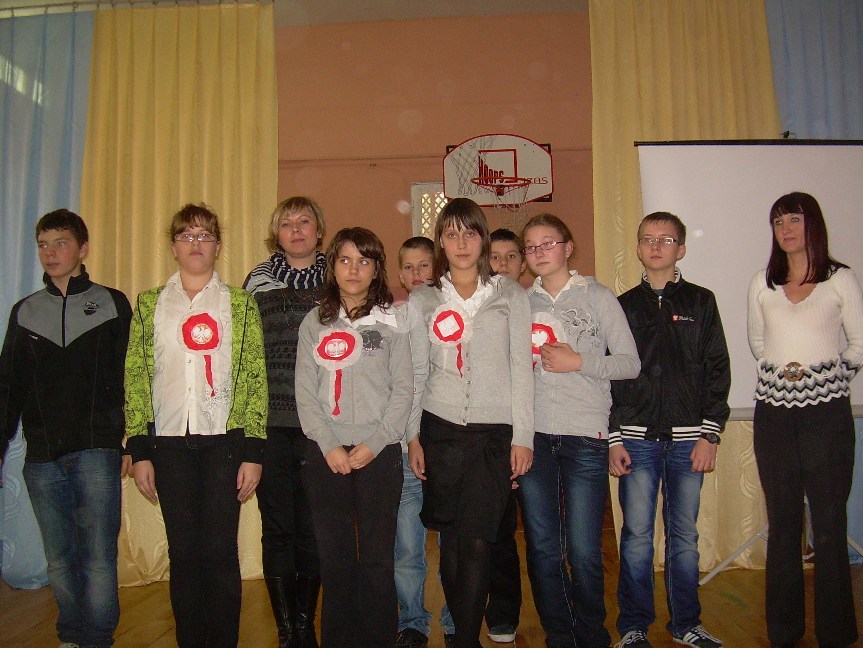 Dnia 14.11.2011 r. uczniowie naszej szkoły wraz z nauczycielami obchodzili kolejną rocznicę odzyskania Niepodległości przez Polskę. W tym dniu odbył się montaż słowno-muzyczny o charakterze patriotycznym w wykonaniu uczniów klasy czwartej i szóstej oraz prezentacja multimedialna ukazująca drogi Polaków do niepodległości. Program artystyczny został przygotowany pod kierunkiem pani Magdaleny Skowrońskiej.