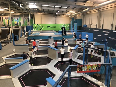 Klasa VI i VIIIA na lekcji w-f na trampolinach.