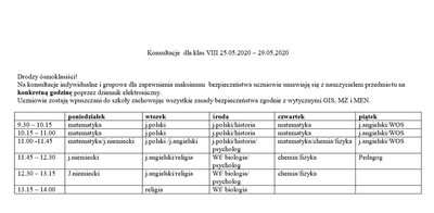 Konsultacje dla klas VIII 25.05.2020 – 29.05.2020